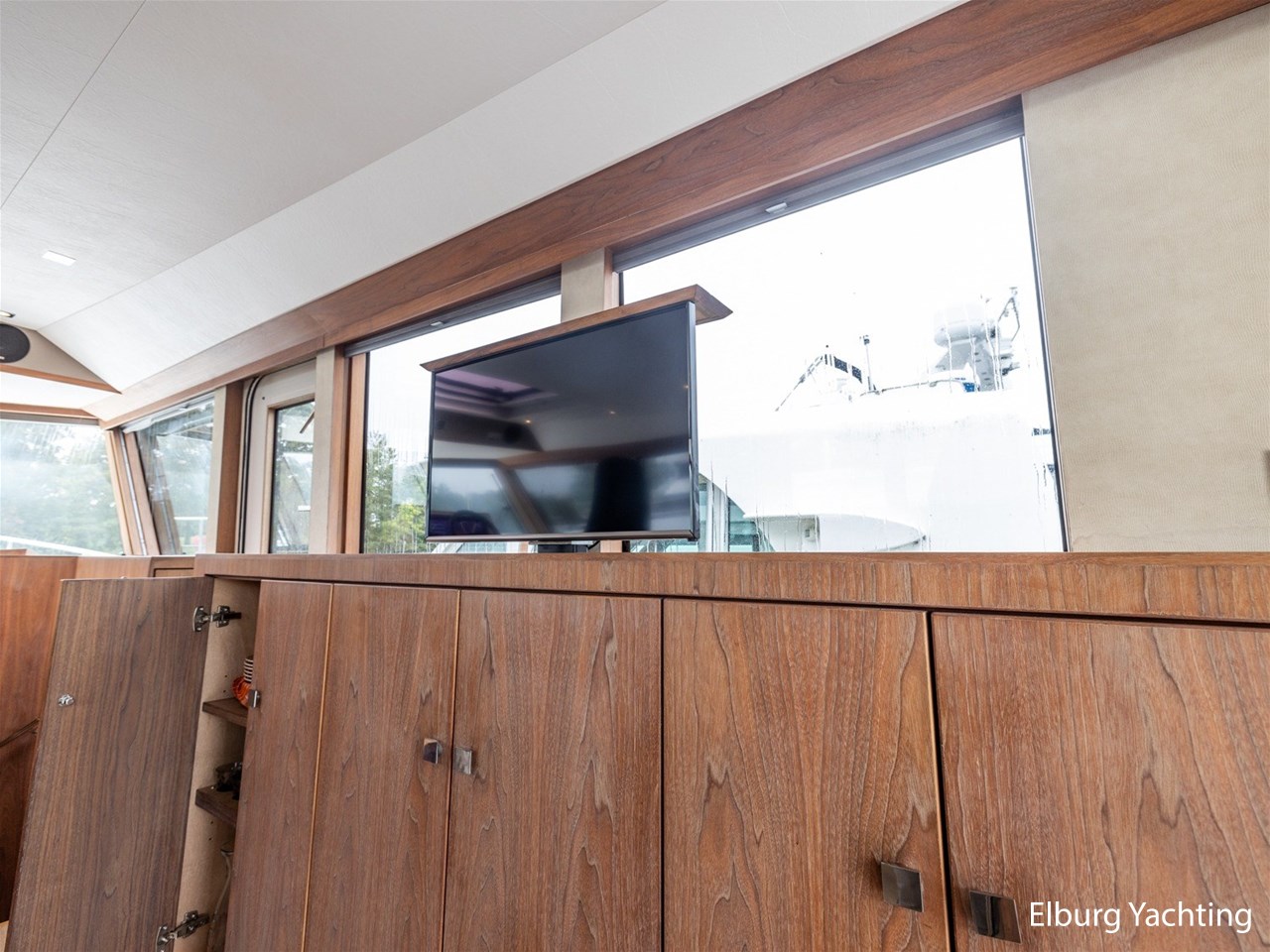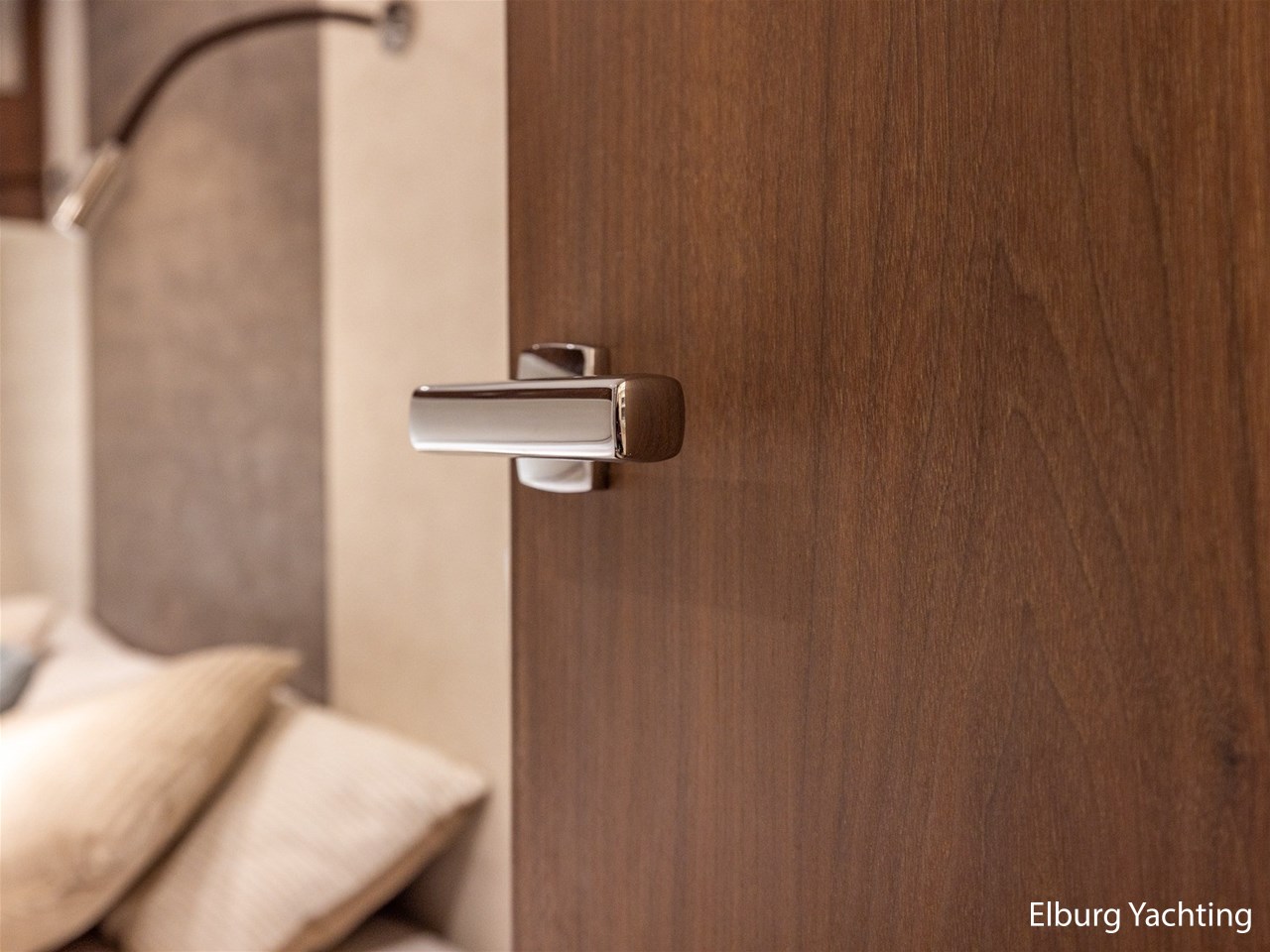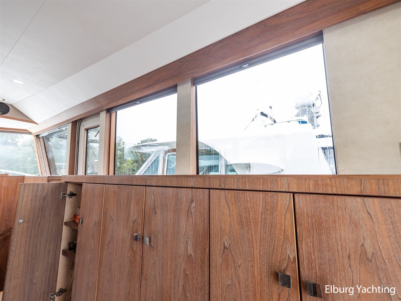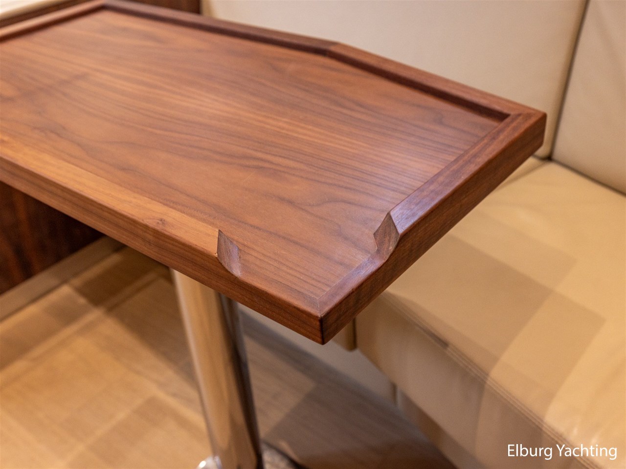 Amerikaans notenhout interieur, plafonds van Nautilux-vinyl en de wanden bekleed met Sibu Leguan