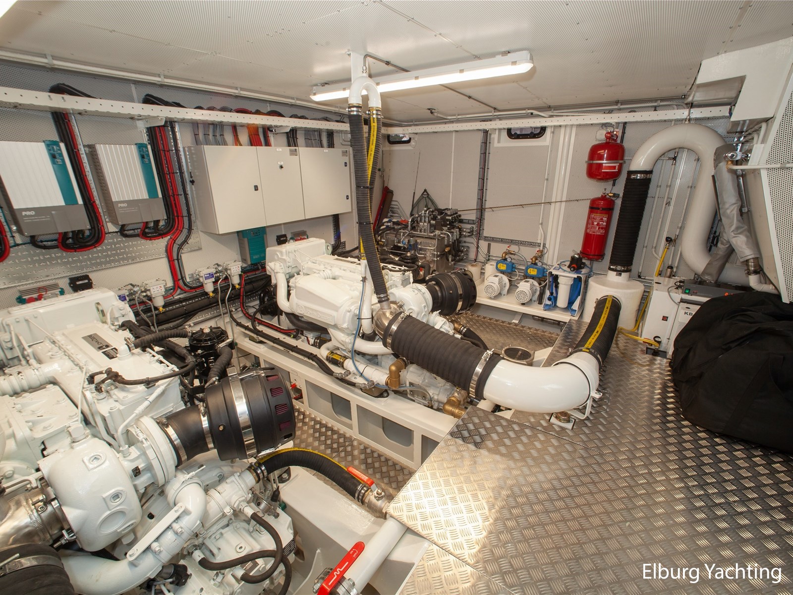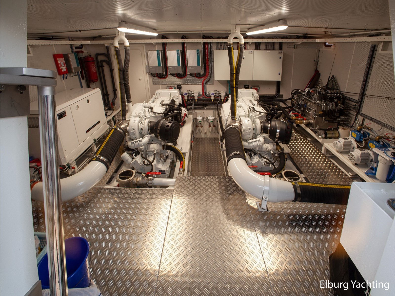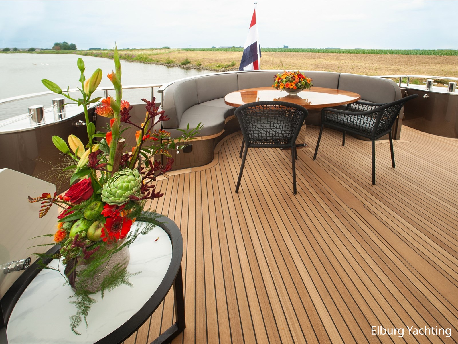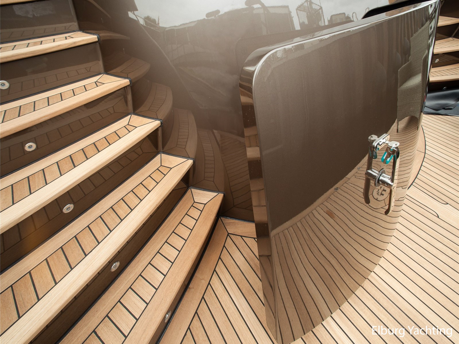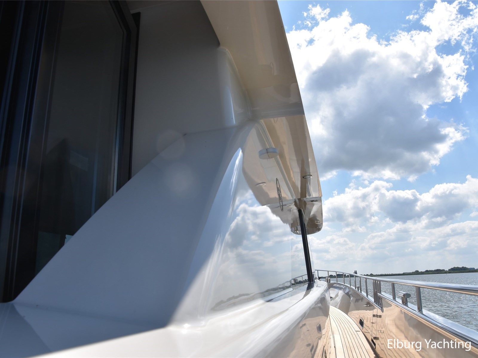 De salon op dekniveau biedt een spectaculair 360-graden uitzicht, wat het gevoel van ruimte en licht versterkt doormiddel van de grote raampartijen. De brede gangboorden rondom maken het veilig en gemakkelijk om gelijkvloers rondom het dek te bewegen. Het voordek biedt volop ruimte om te loungen, compleet met een comfortabele bank om in alle rust van het uitzicht te genieten. Ook het achterdek is royaal opgezet, met een halfronde bank voor vijf personen en een overkapping die schaduw biedt tijdens zonnige dagen. Aan beide zijden van het jacht leiden stijlvolle trappen naar het ruime zwemplateau, dat tevens toegang biedt tot de professioneel ingerichte machinekamer met stahoogte. Met plezier maak je hier een dagelijks inspectie rondje en ziet in een oogopslag dat alle techniek in orde is. Dit schip beschikt over een geldig CVO certificaat.