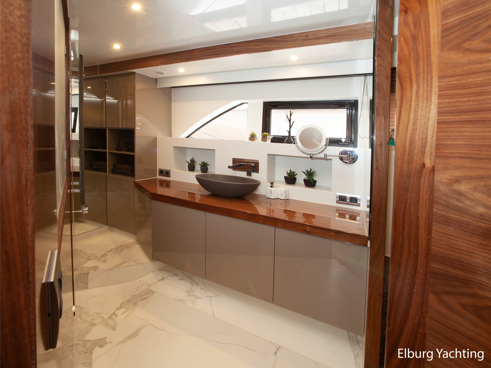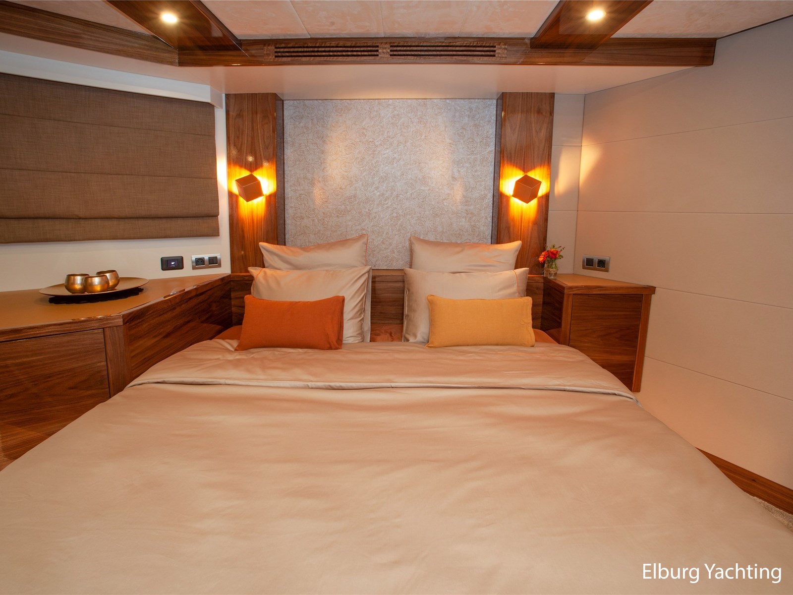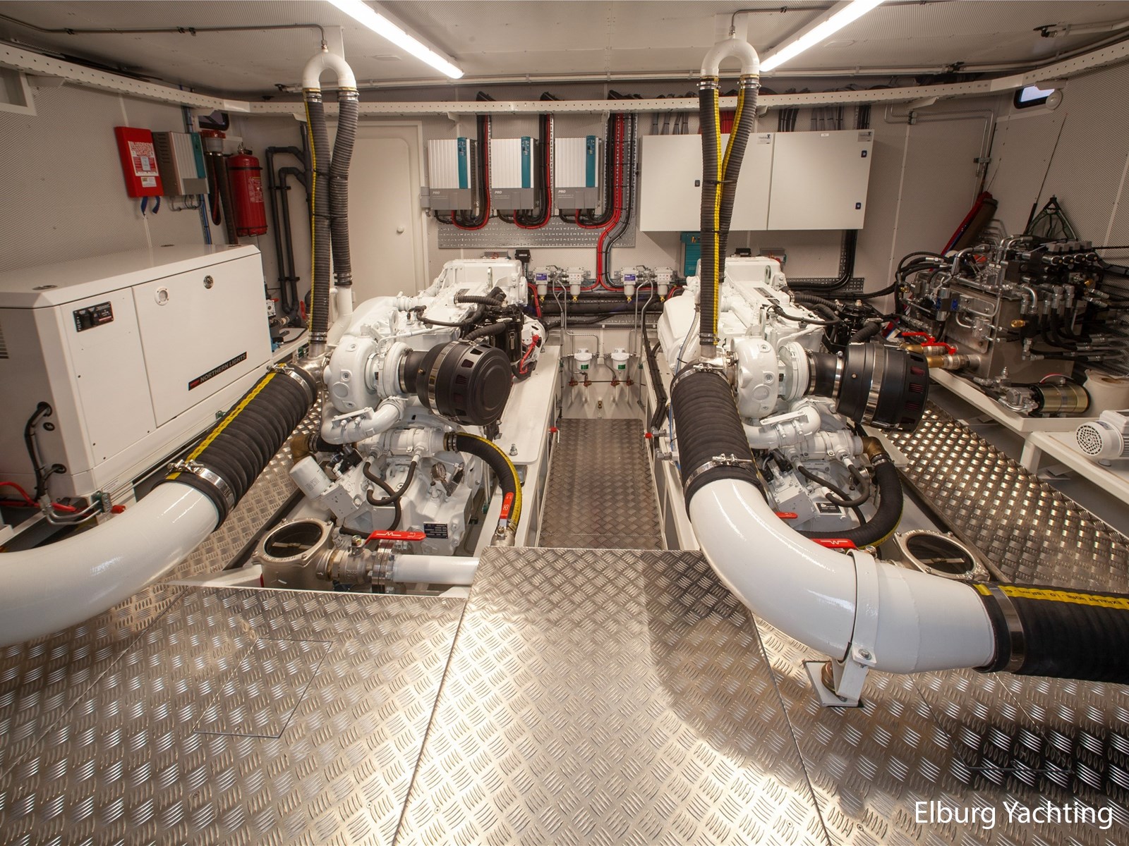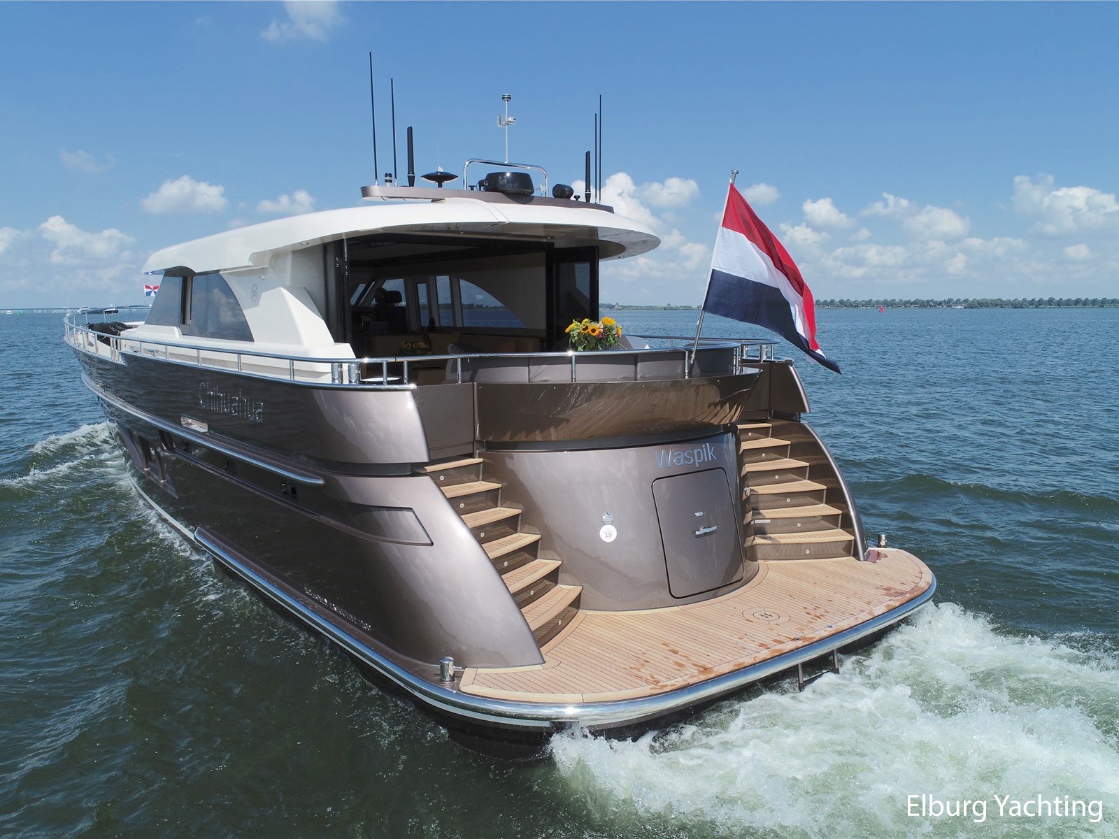 De salon op dekniveau biedt een spectaculair 360-graden uitzicht, wat het gevoel van ruimte en licht versterkt doormiddel van de grote raampartijen. De brede gangboorden rondom maken het veilig en gemakkelijk om gelijkvloers rondom het dek te bewegen. Het voordek biedt volop ruimte om te loungen, compleet met een comfortabele bank om in alle rust van het uitzicht te genieten. Ook het achterdek is royaal opgezet, met een halfronde bank voor vijf personen en een overkapping die schaduw biedt tijdens zonnige dagen. Aan beide zijden van het jacht leiden stijlvolle trappen naar het ruime zwemplateau, dat tevens toegang biedt tot de professioneel ingerichte machinekamer met stahoogte. Met plezier maak je hier een dagelijks inspectie rondje en ziet in een oogopslag dat alle techniek in orde is. Dit schip beschikt over een geldig CVO certificaat.