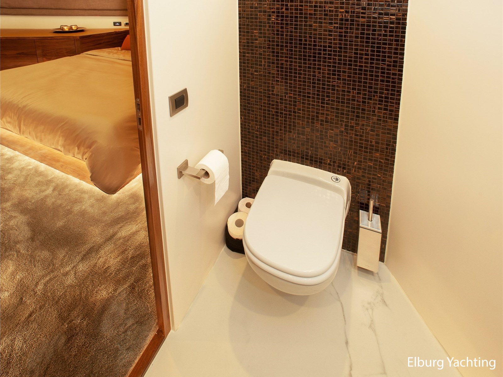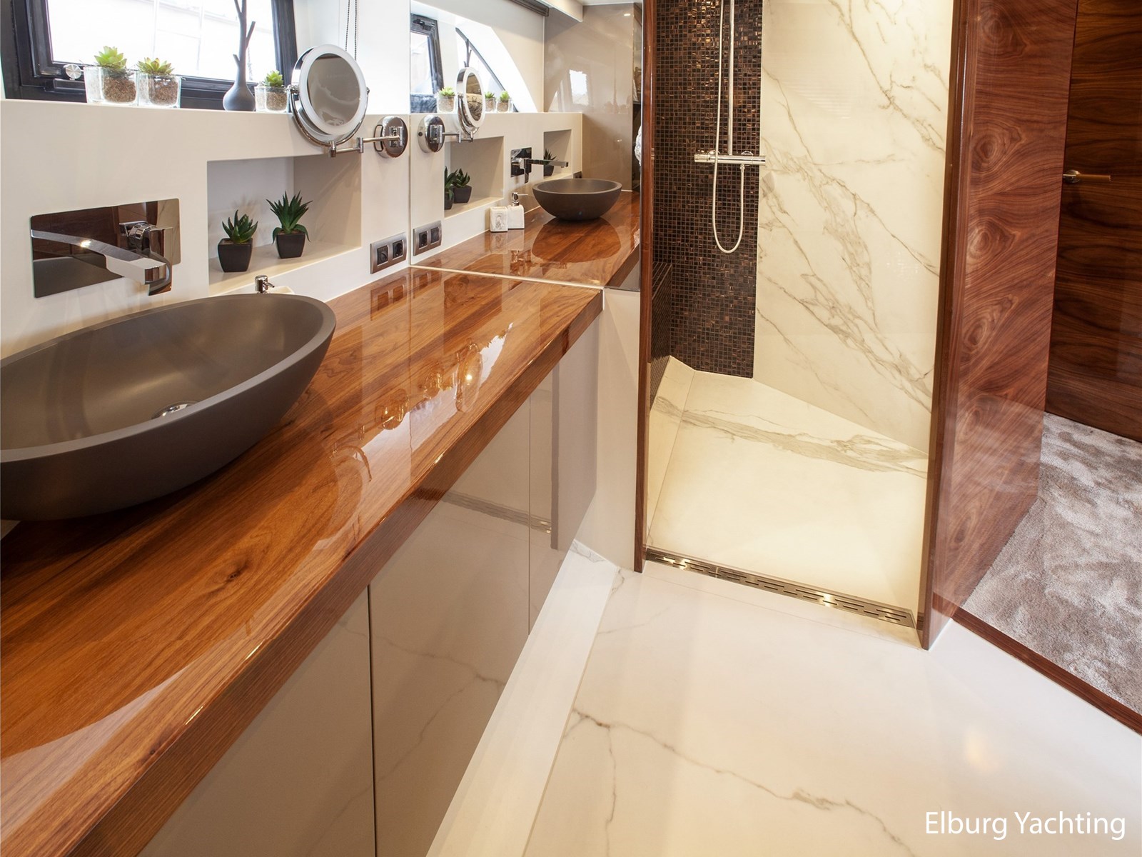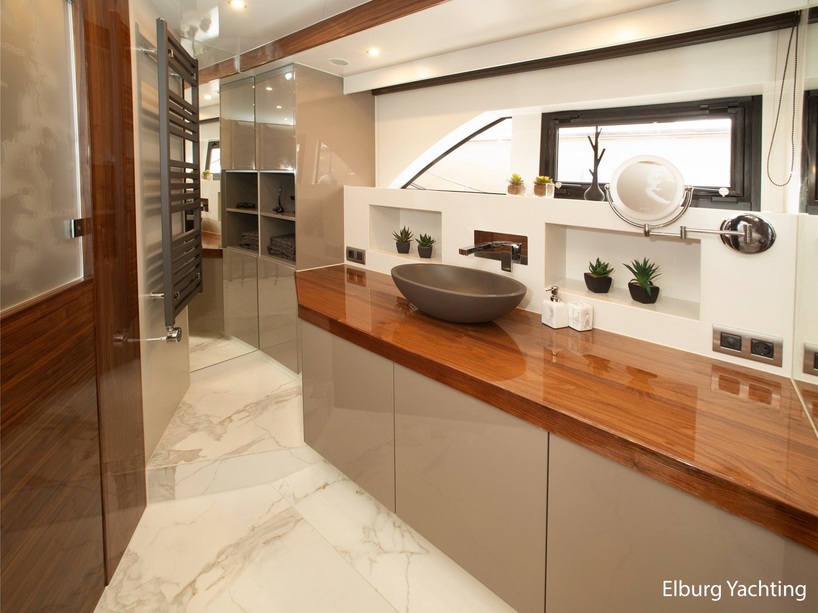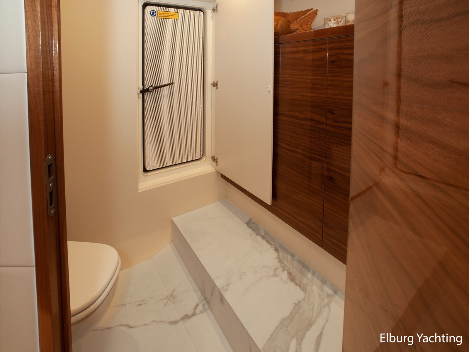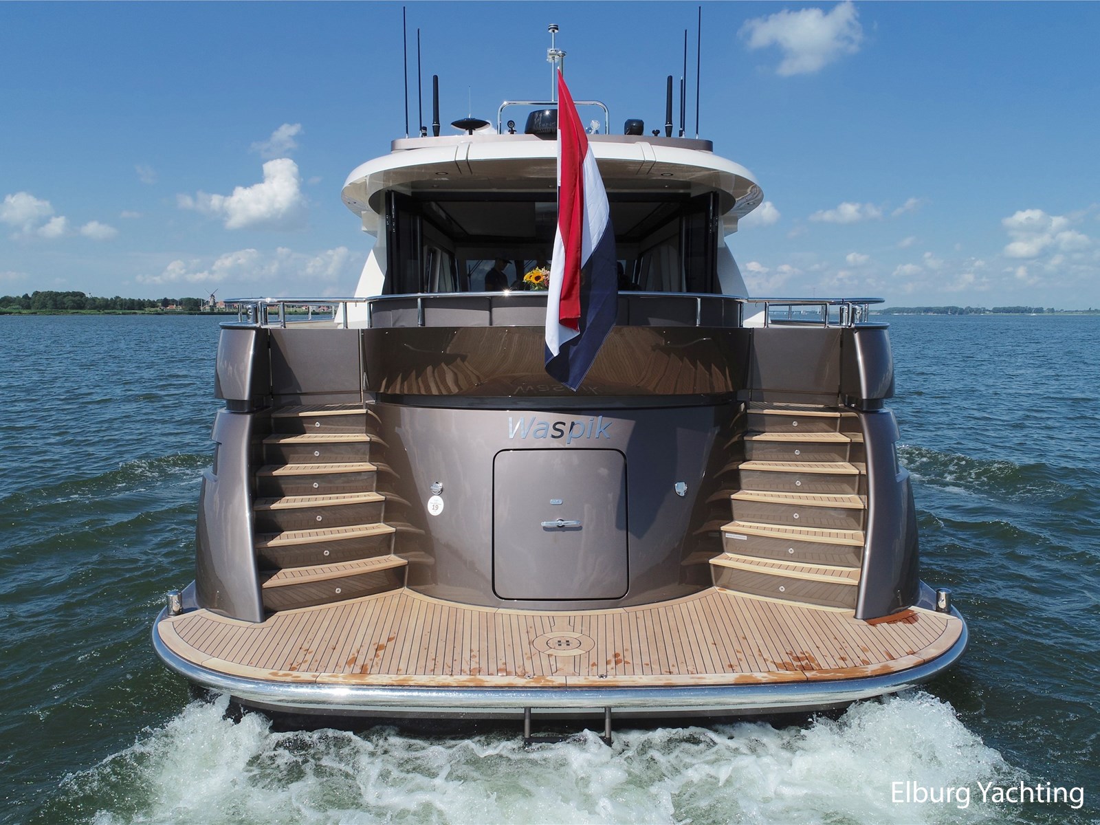 De salon op dekniveau biedt een spectaculair 360-graden uitzicht, wat het gevoel van ruimte en licht versterkt doormiddel van de grote raampartijen. De brede gangboorden rondom maken het veilig en gemakkelijk om gelijkvloers rondom het dek te bewegen. Het voordek biedt volop ruimte om te loungen, compleet met een comfortabele bank om in alle rust van het uitzicht te genieten. Ook het achterdek is royaal opgezet, met een halfronde bank voor vijf personen en een overkapping die schaduw biedt tijdens zonnige dagen. Aan beide zijden van het jacht leiden stijlvolle trappen naar het ruime zwemplateau, dat tevens toegang biedt tot de professioneel ingerichte machinekamer met stahoogte. Met plezier maak je hier een dagelijks inspectie rondje en ziet in een oogopslag dat alle techniek in orde is. Dit schip beschikt over een geldig CVO certificaat.