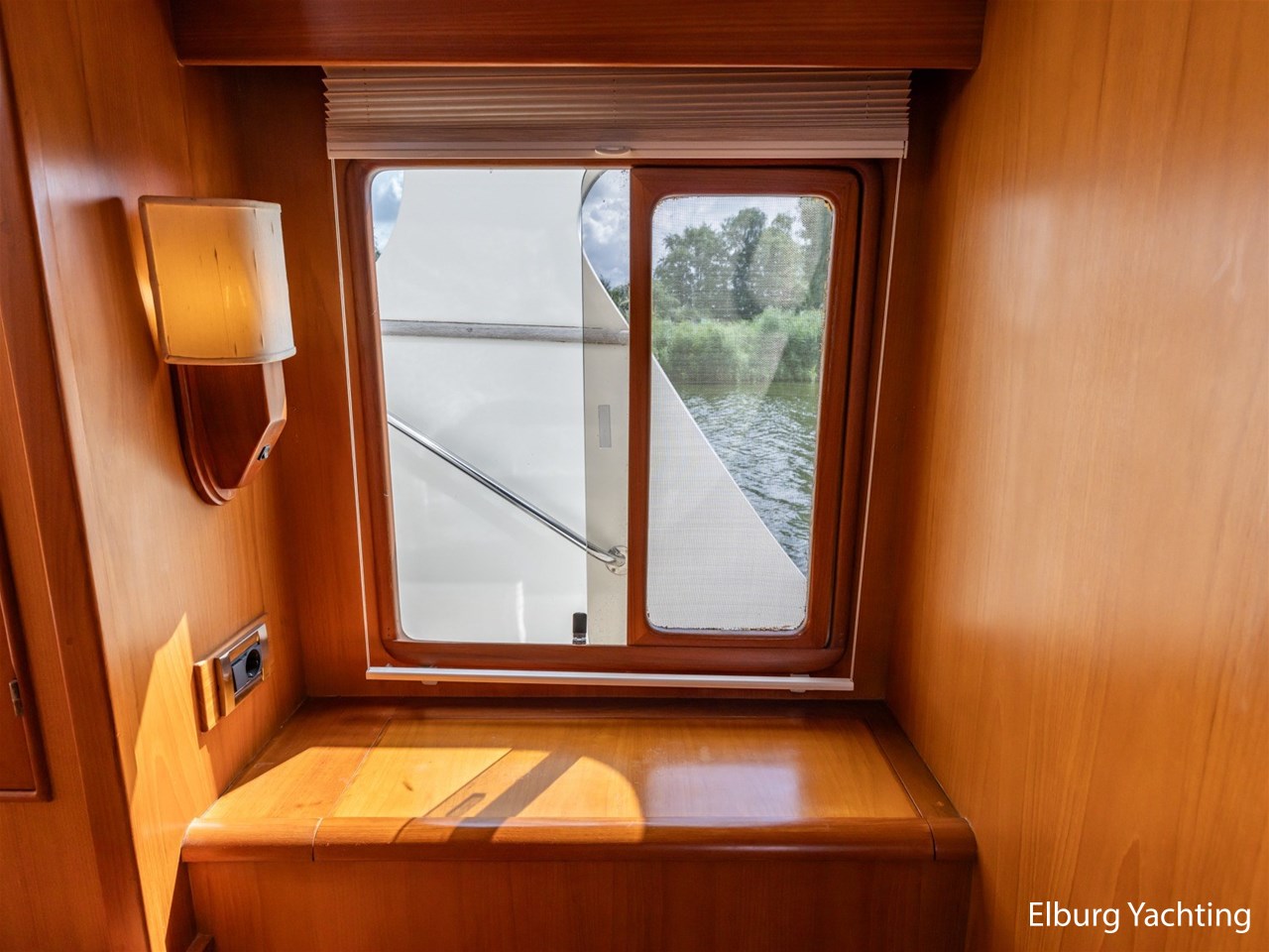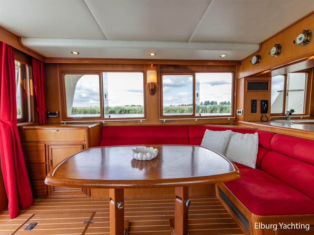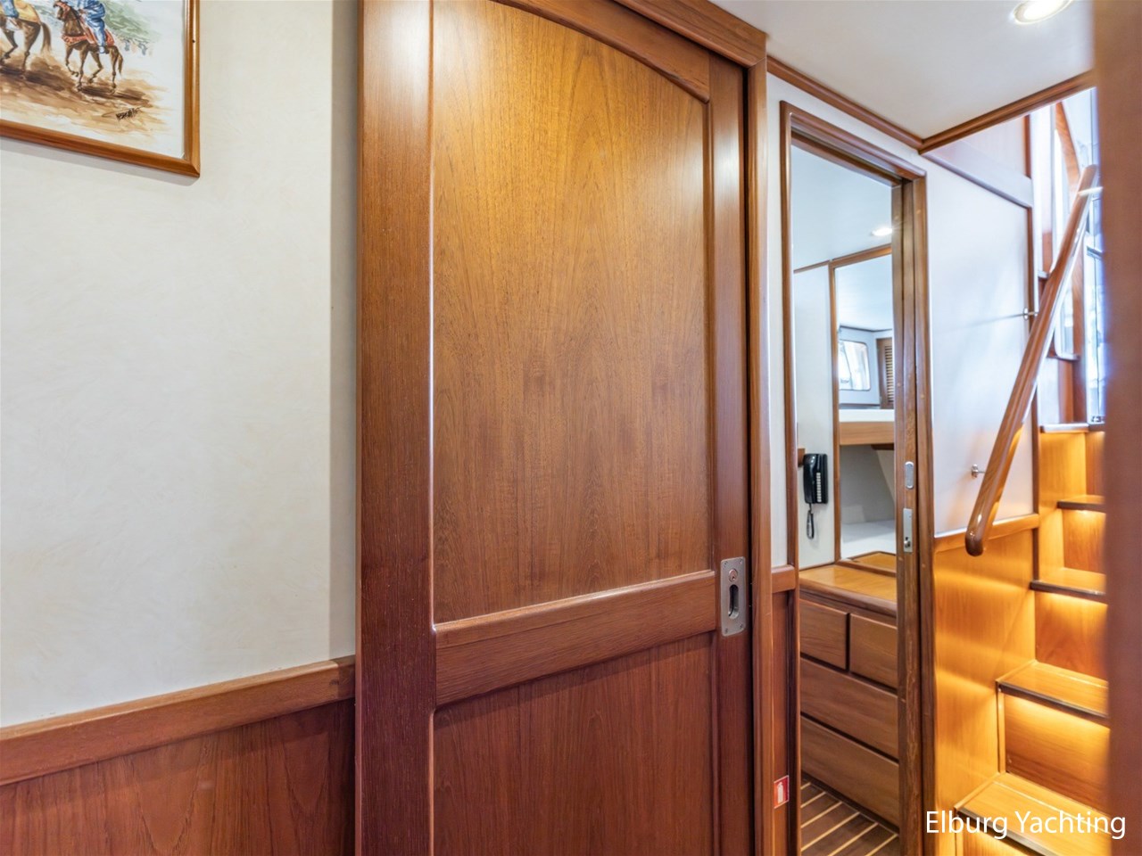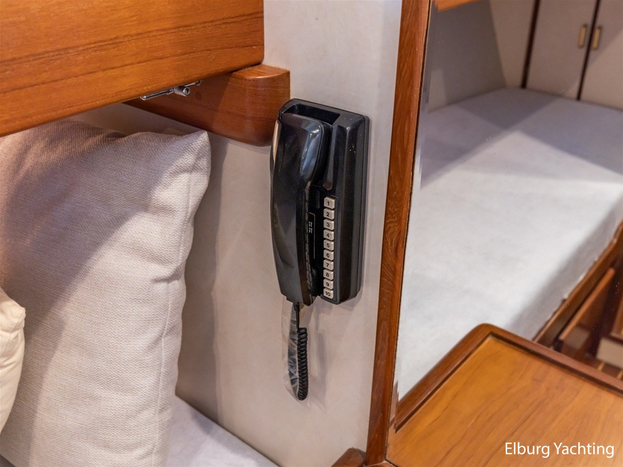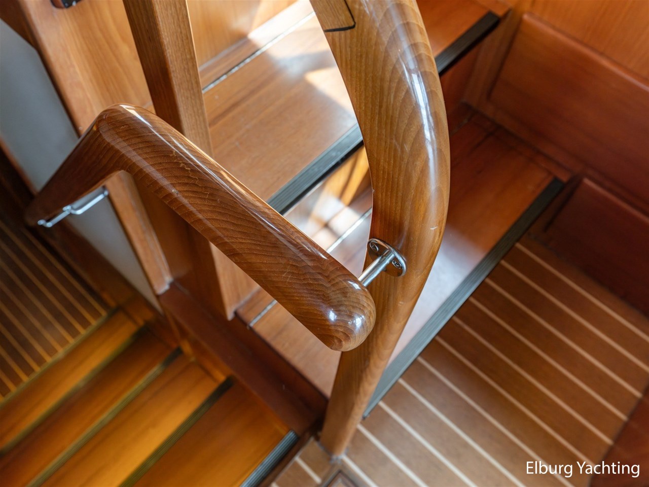 De indeling biedt een ruime eigenaarshut met kingsize 2 pers. bed en badkamer ensuite, twee extra slaaphutten met elk 2 x een 1 pers. bed. , drie dinette-opstellingen en een grote salon met veel daglicht. De flybridge is bereikbaar via zowel het stuurhuis als het achterdek., ruime zitgelegenheid op flybridge, bijbootsteunen op vaste dak. Het jacht is voorzien van een volledig teakdek rondom, ruime bergmogelijkheden en een separate toegang tot de machinekamer.