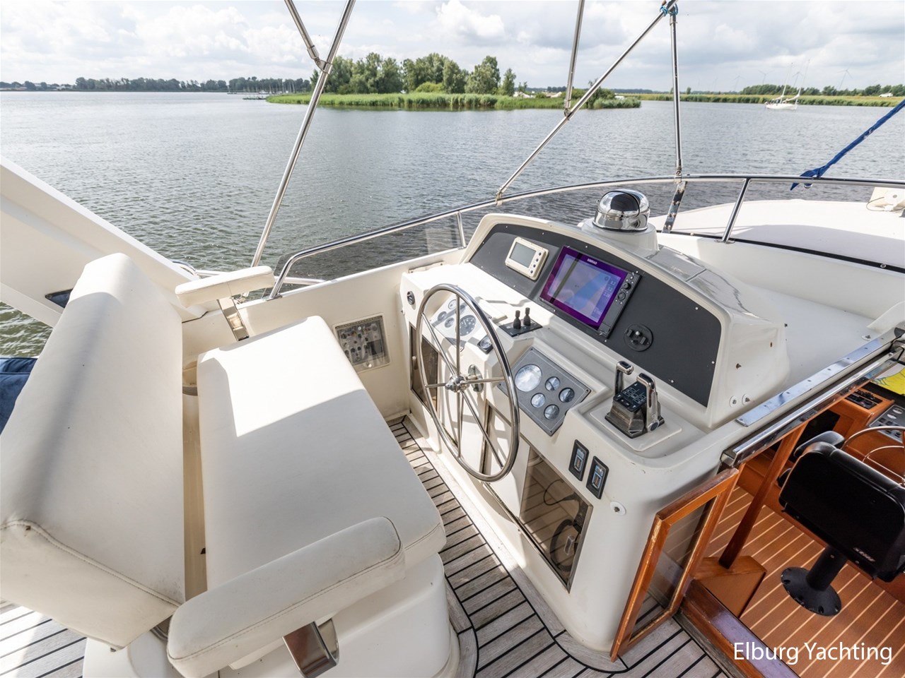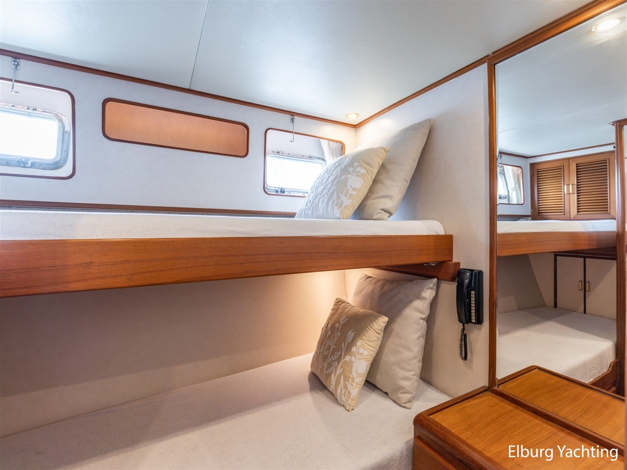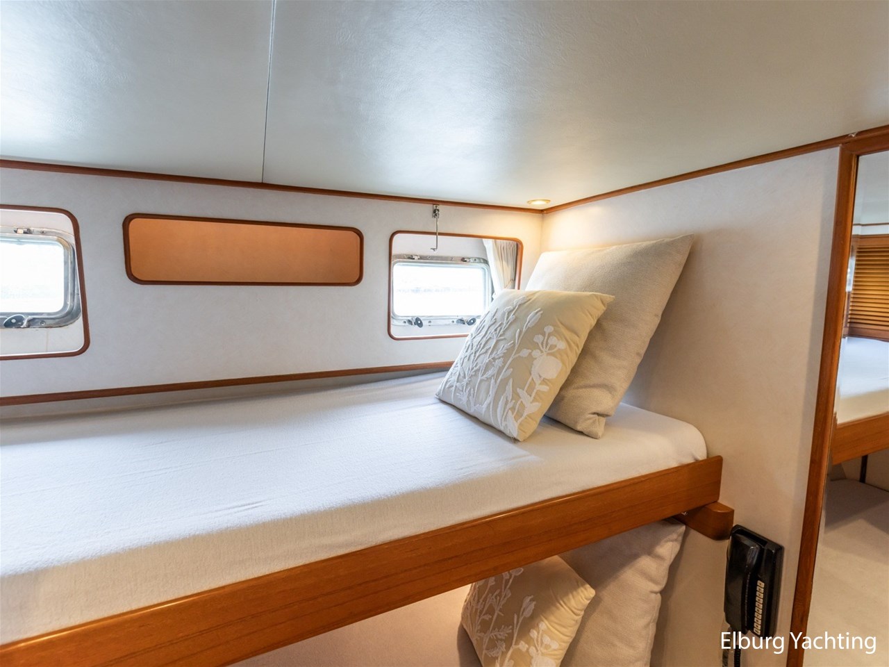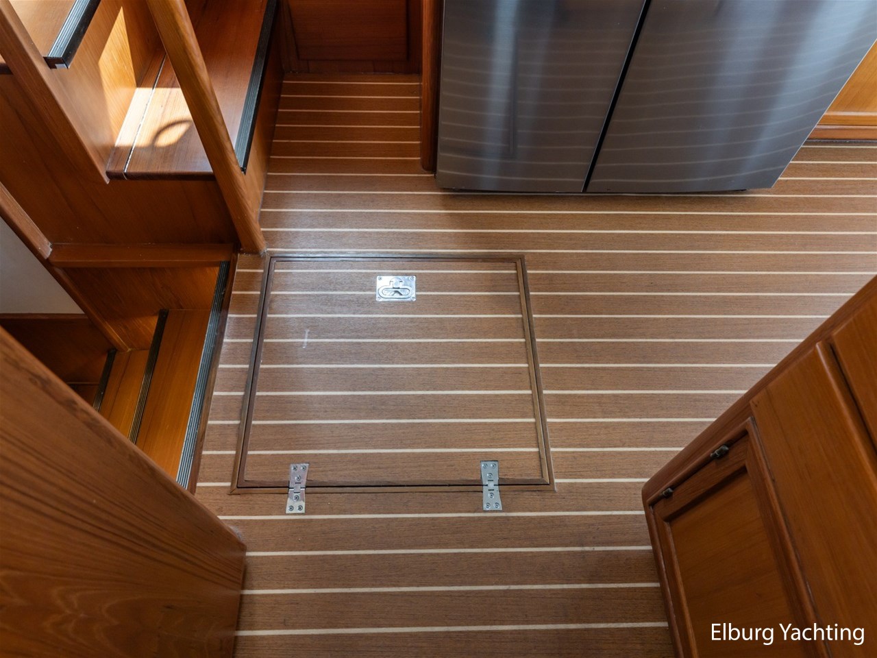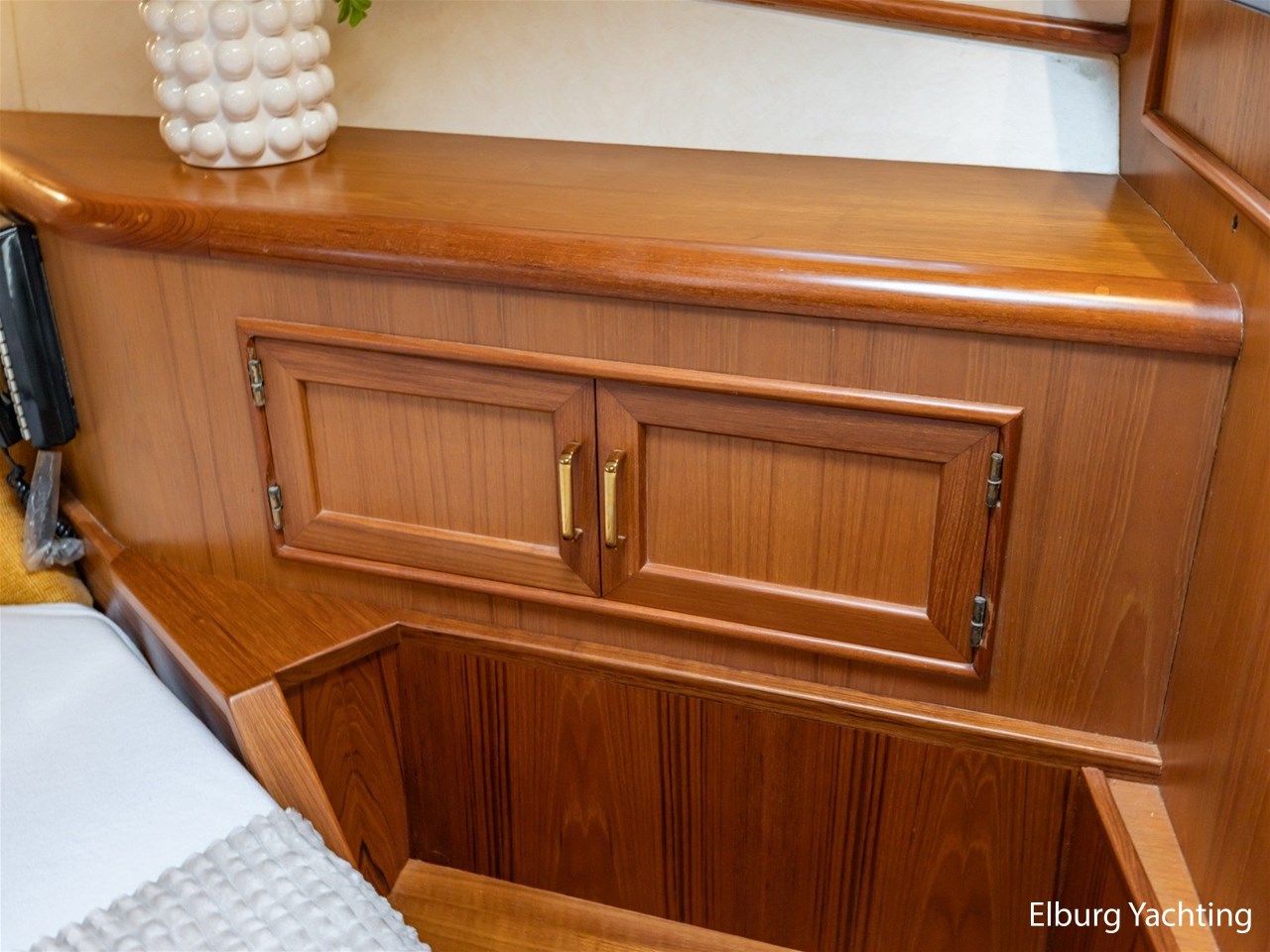 De indeling biedt een ruime eigenaarshut met kingsize 2 pers. bed en badkamer ensuite, twee extra slaaphutten met elk 2 x een 1 pers. bed. , drie dinette-opstellingen en een grote salon met veel daglicht. De flybridge is bereikbaar via zowel het stuurhuis als het achterdek., ruime zitgelegenheid op flybridge, bijbootsteunen op vaste dak. Het jacht is voorzien van een volledig teakdek rondom, ruime bergmogelijkheden en een separate toegang tot de machinekamer.