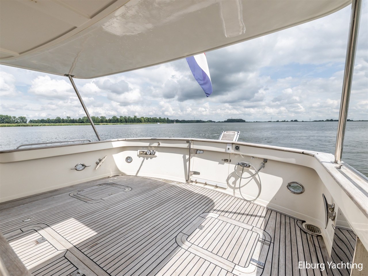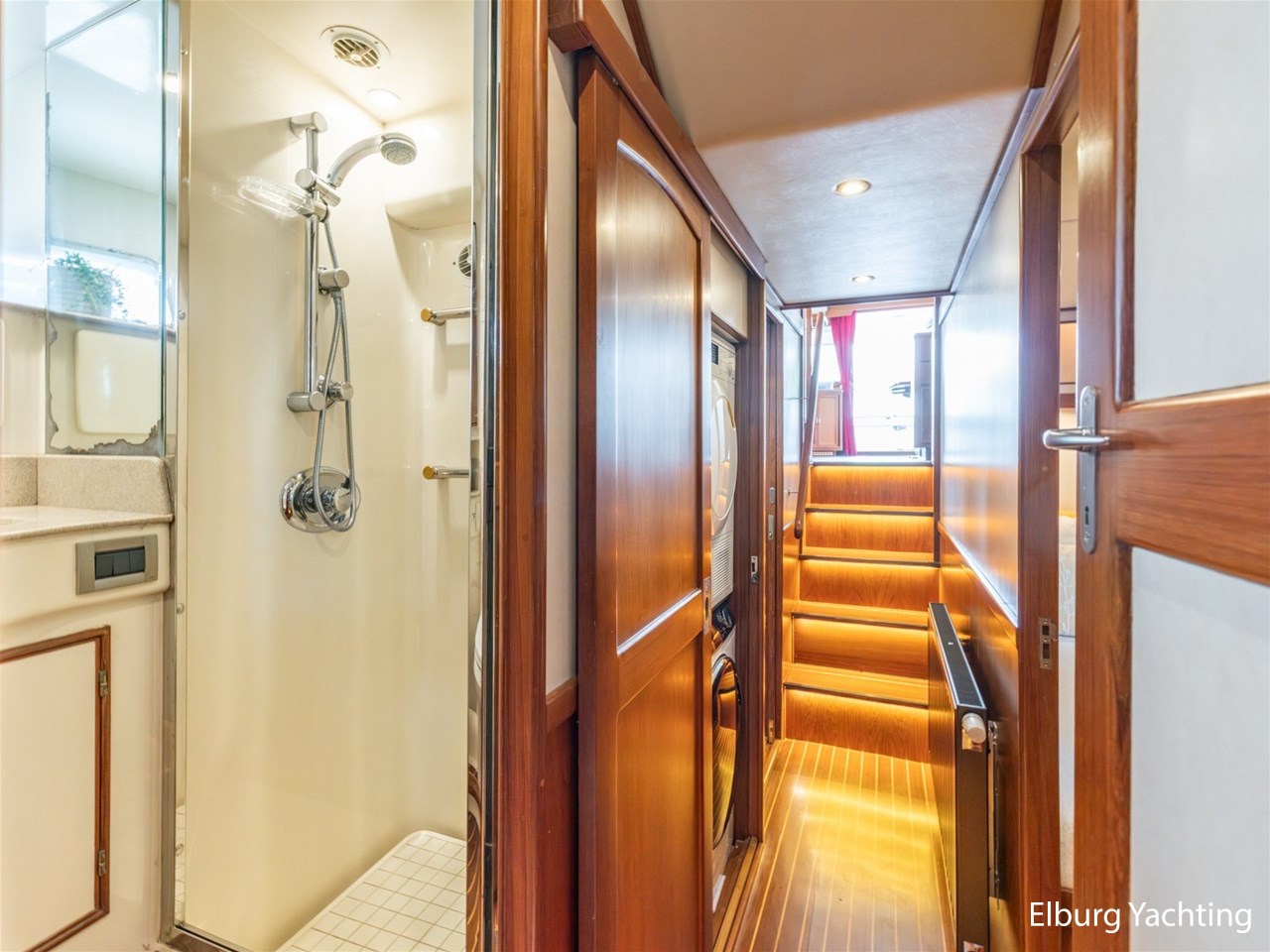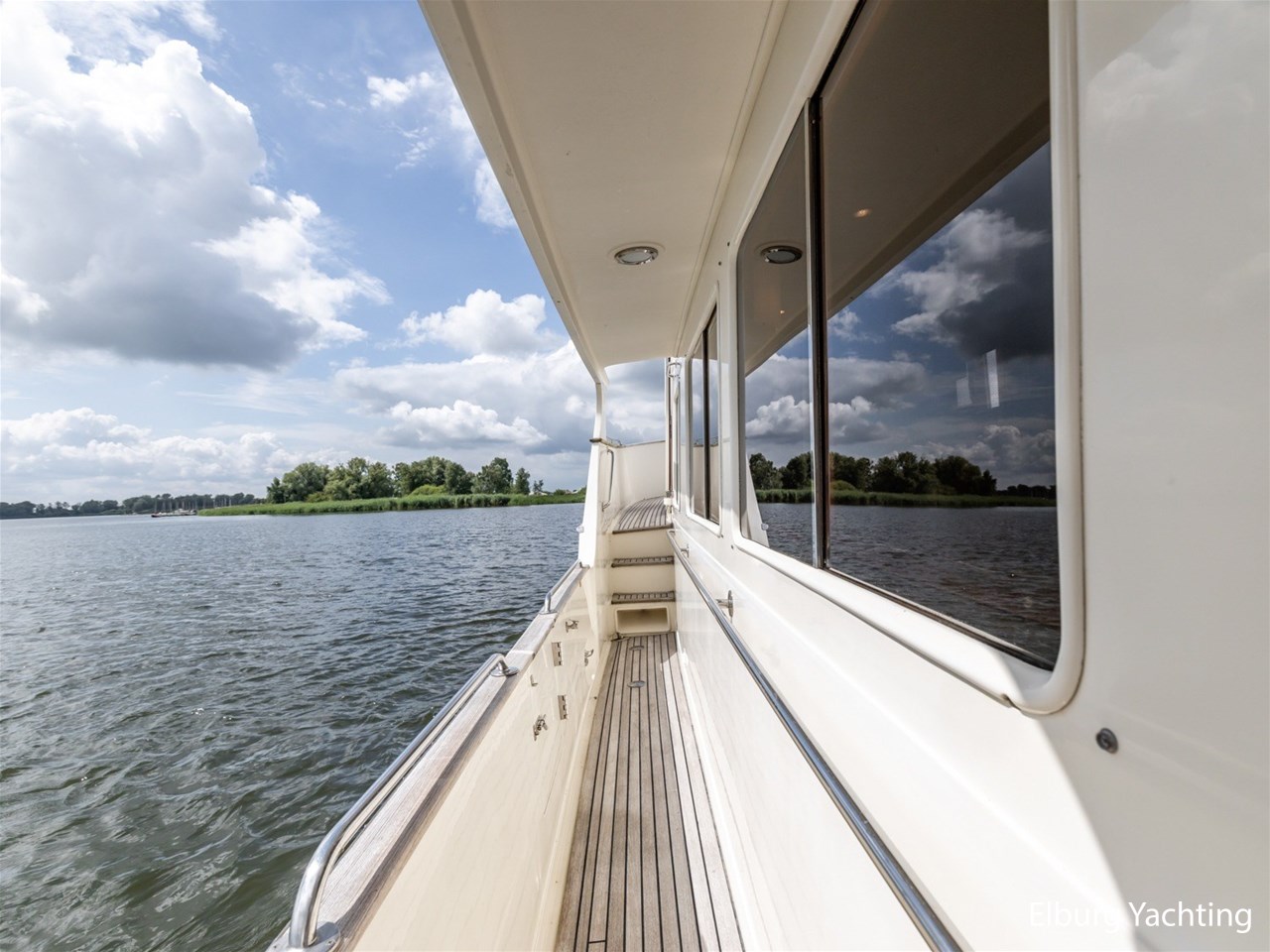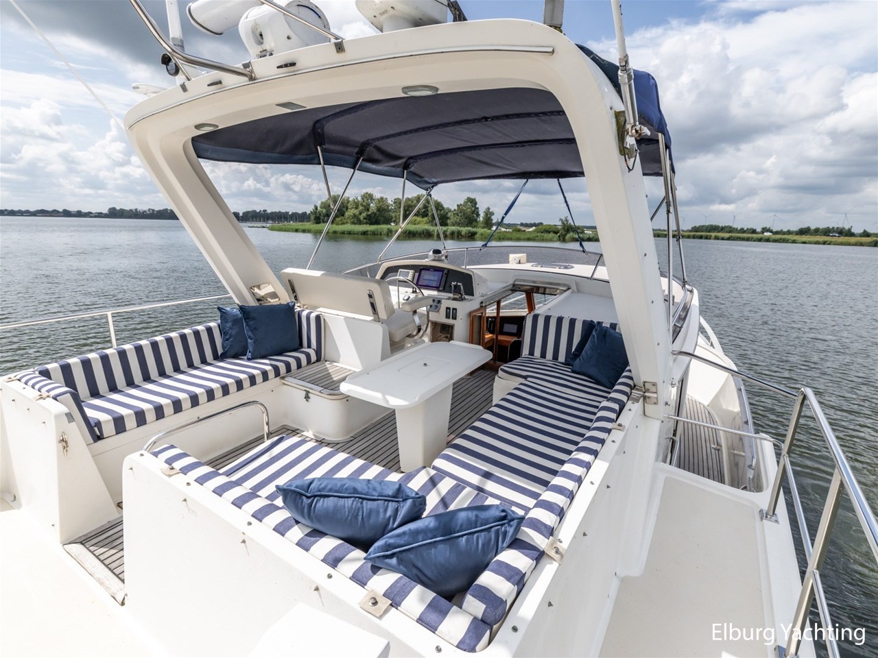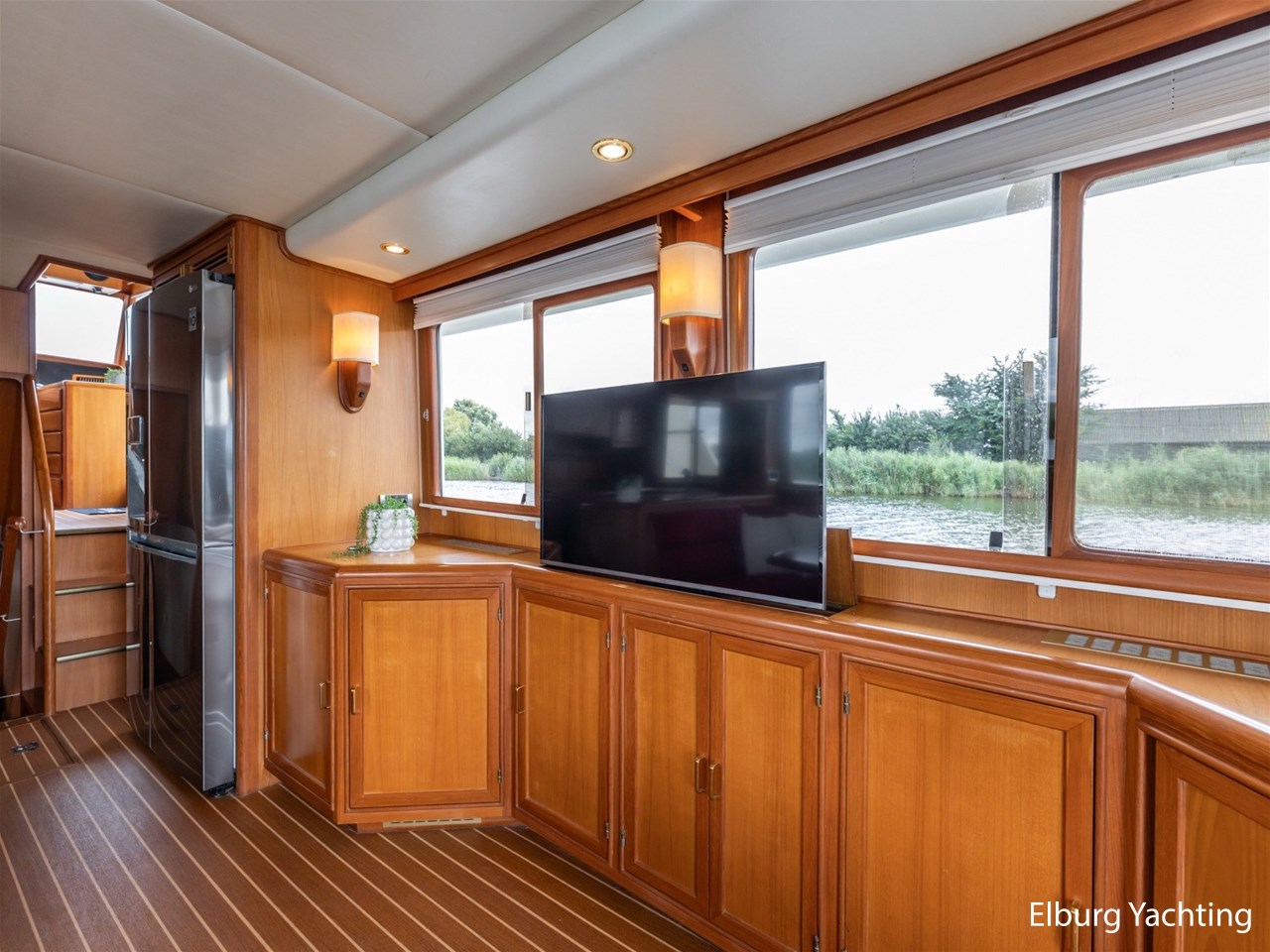 De indeling biedt een ruime eigenaarshut met kingsize 2 pers. bed en badkamer ensuite, twee extra slaaphutten met elk 2 x een 1 pers. bed. , drie dinette-opstellingen en een grote salon met veel daglicht. De flybridge is bereikbaar via zowel het stuurhuis als het achterdek., ruime zitgelegenheid op flybridge, bijbootsteunen op vaste dak. Het jacht is voorzien van een volledig teakdek rondom, ruime bergmogelijkheden en een separate toegang tot de machinekamer.