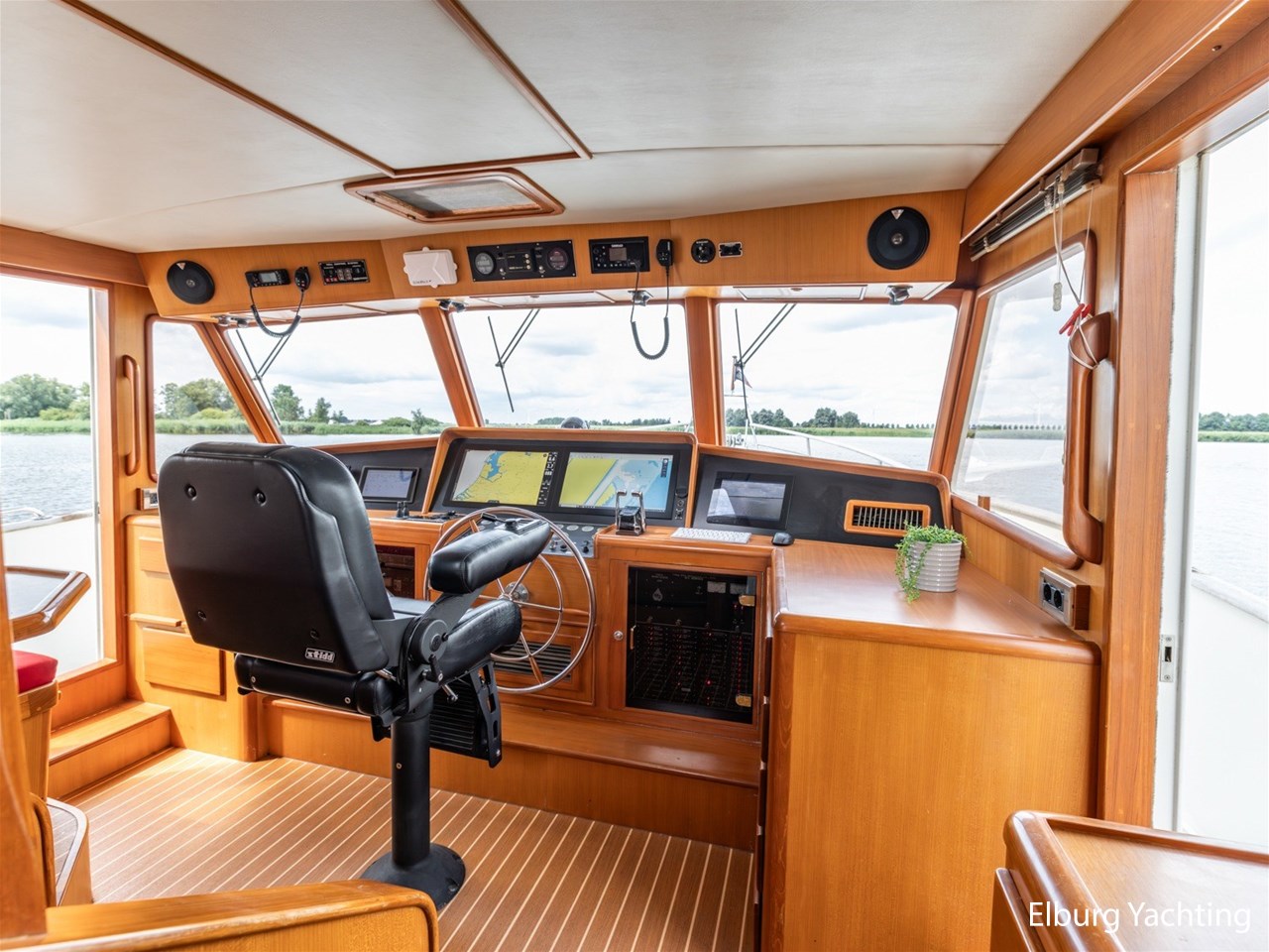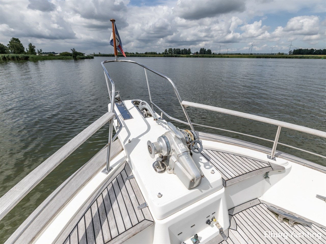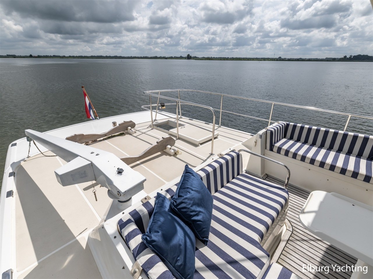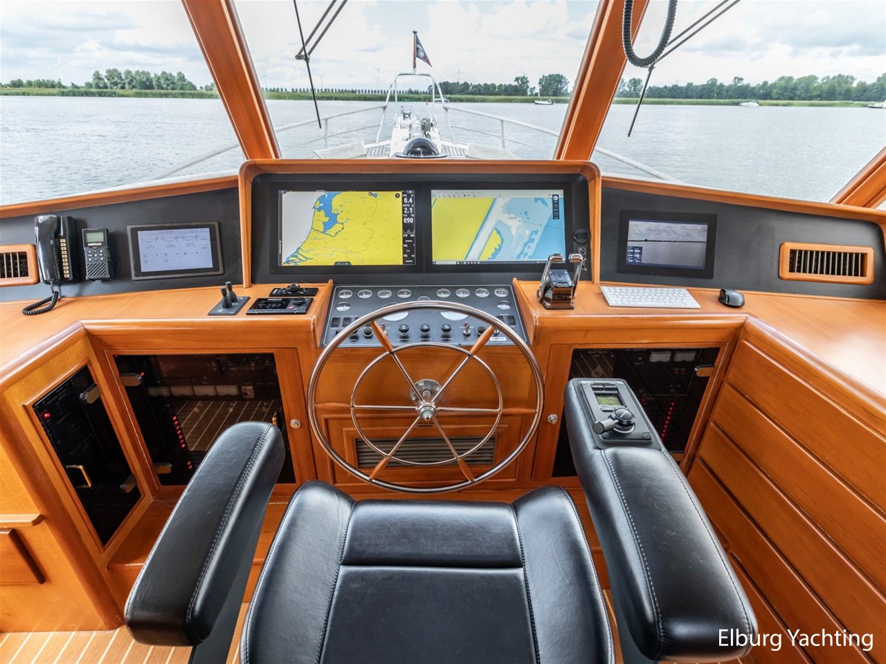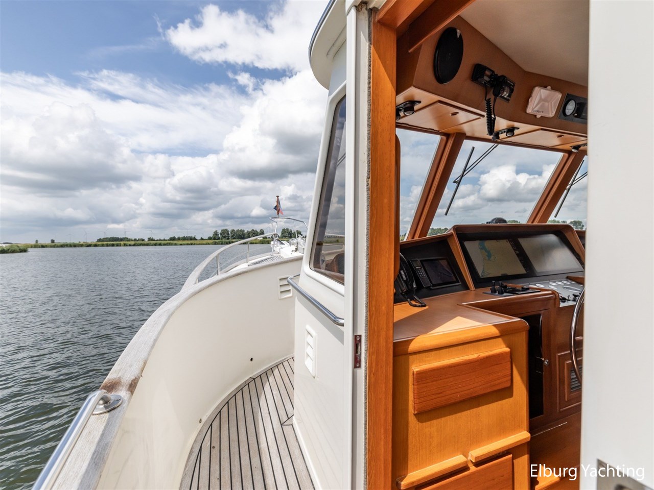 De indeling biedt een ruime eigenaarshut met kingsize 2 pers. bed en badkamer ensuite, twee extra slaaphutten met elk 2 x een 1 pers. bed. , drie dinette-opstellingen en een grote salon met veel daglicht. De flybridge is bereikbaar via zowel het stuurhuis als het achterdek., ruime zitgelegenheid op flybridge, bijbootsteunen op vaste dak. Het jacht is voorzien van een volledig teakdek rondom, ruime bergmogelijkheden en een separate toegang tot de machinekamer.