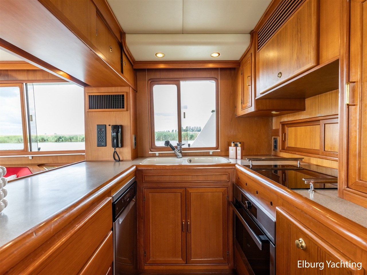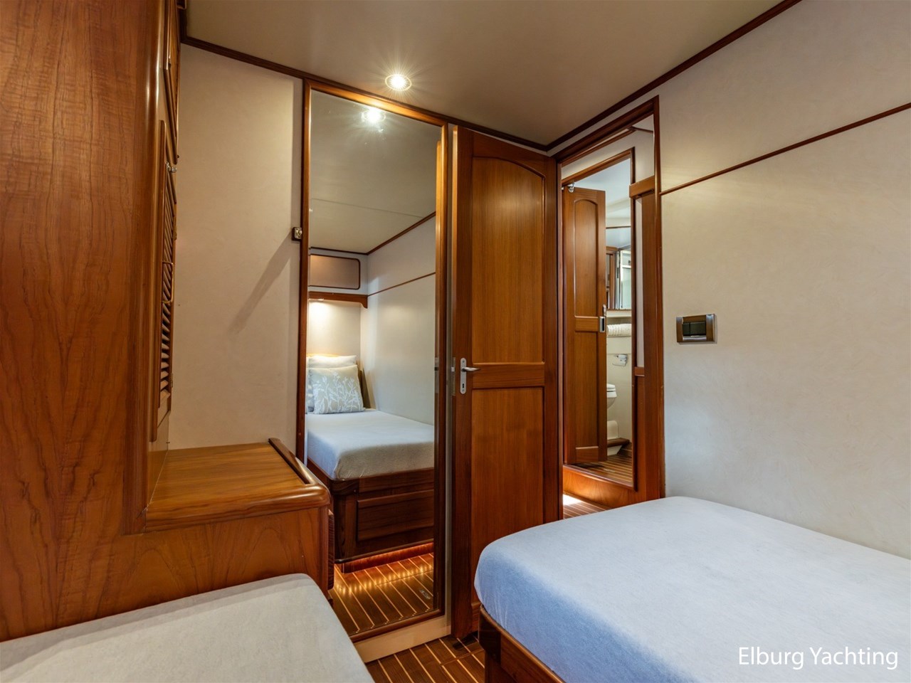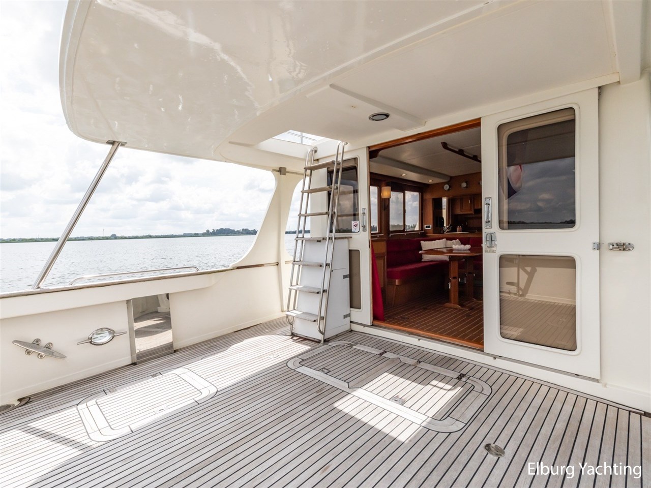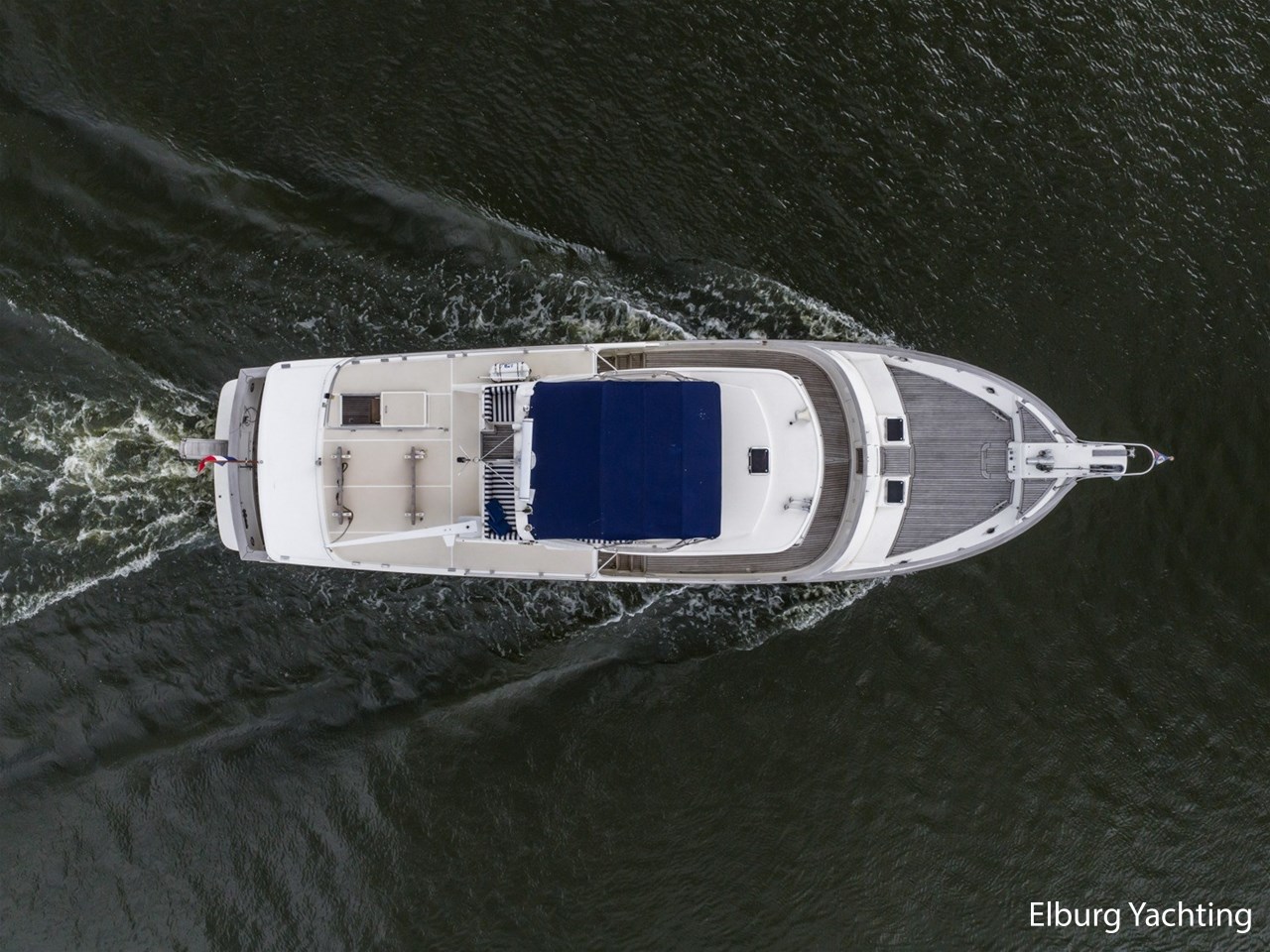 De indeling biedt een ruime eigenaarshut met kingsize 2 pers. bed en badkamer ensuite, twee extra slaaphutten met elk 2 x een 1 pers. bed. , drie dinette-opstellingen en een grote salon met veel daglicht. De flybridge is bereikbaar via zowel het stuurhuis als het achterdek., ruime zitgelegenheid op flybridge, bijbootsteunen op vaste dak. Het jacht is voorzien van een volledig teakdek rondom, ruime bergmogelijkheden en een separate toegang tot de machinekamer.