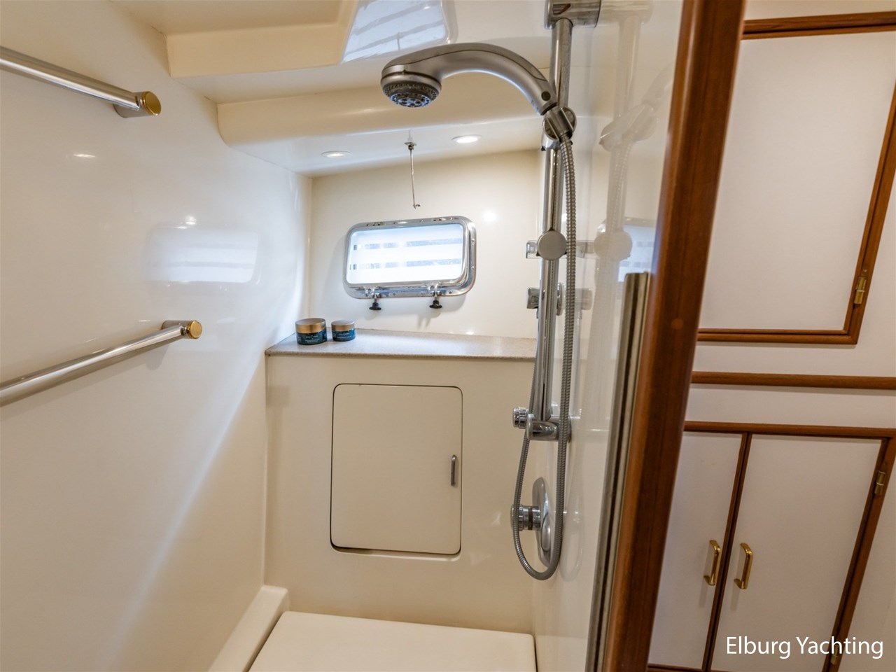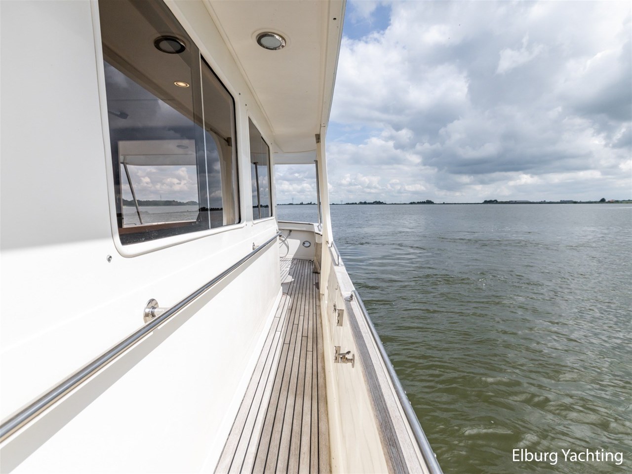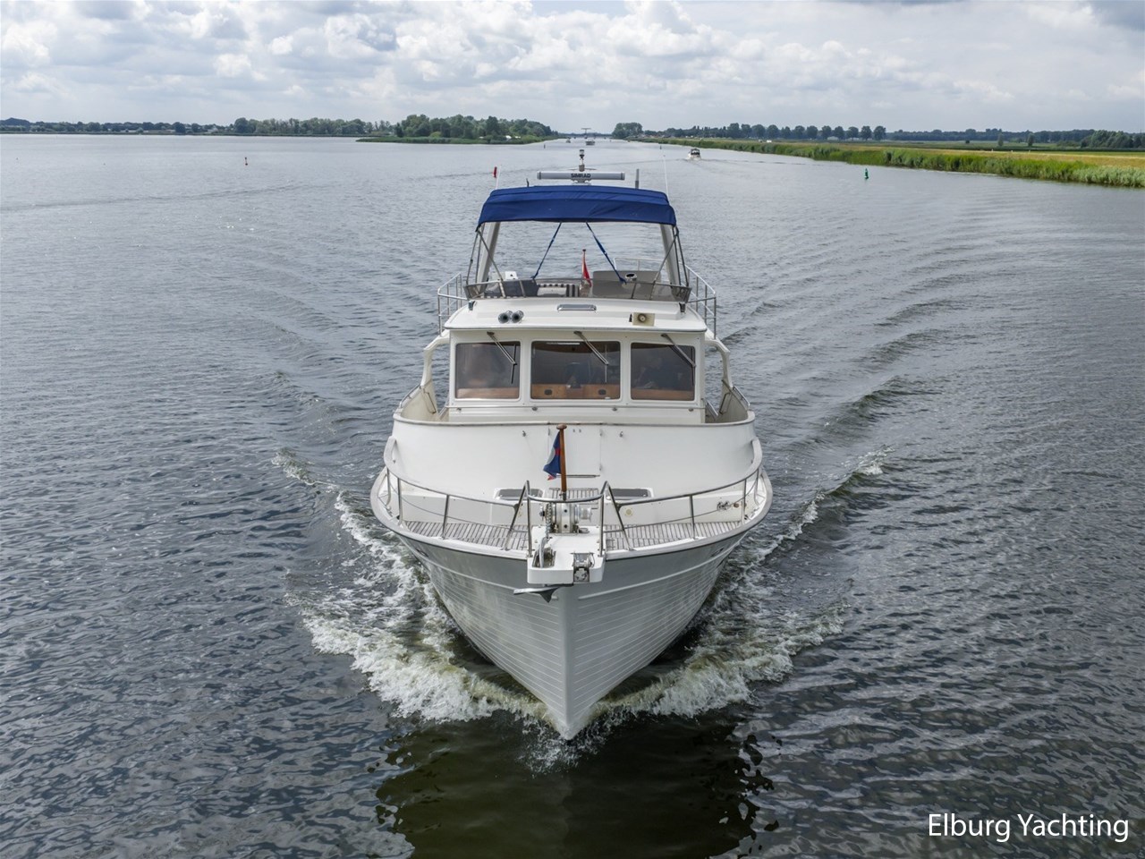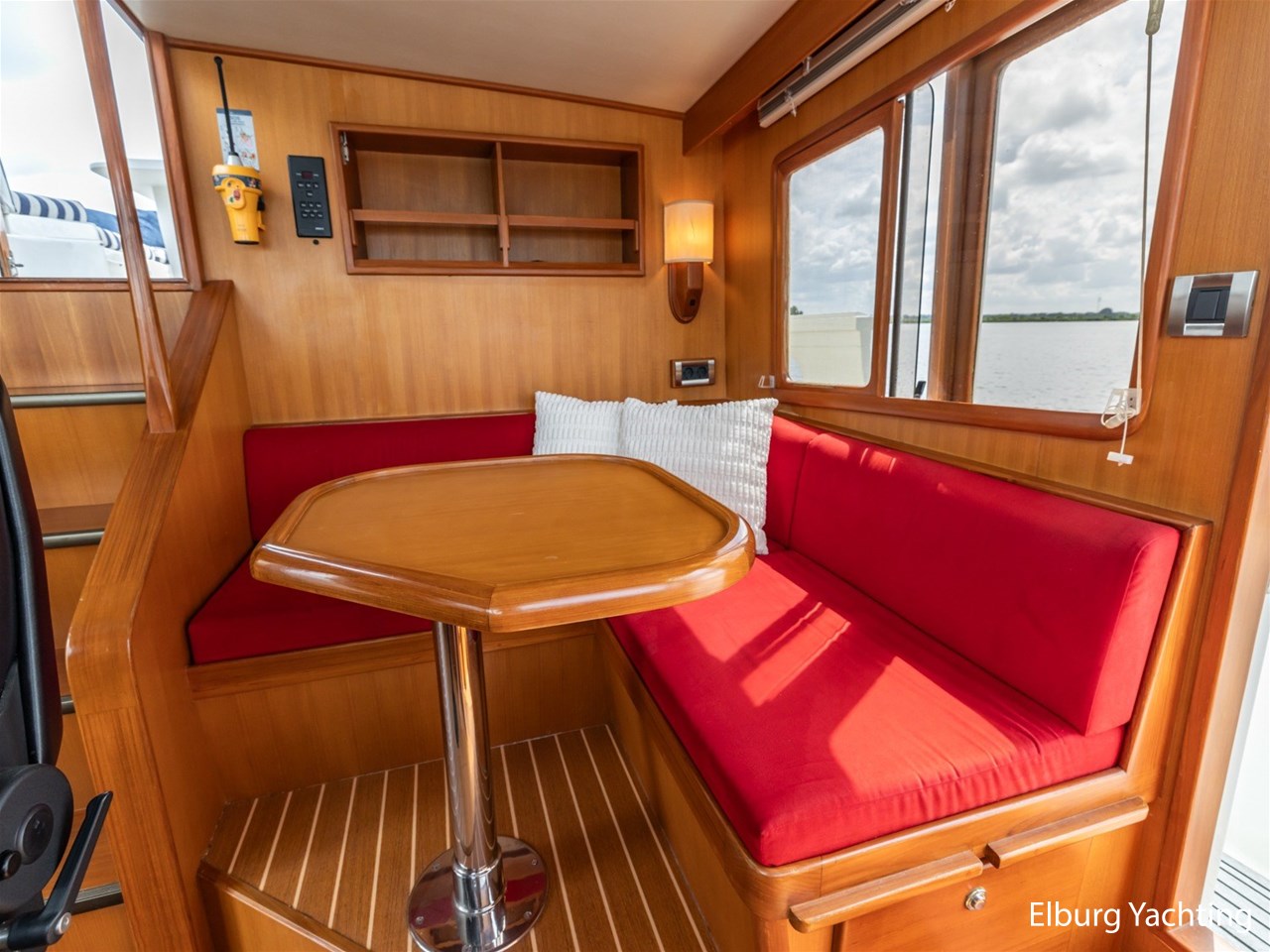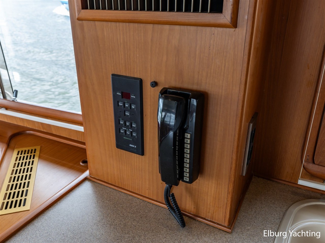 De indeling biedt een ruime eigenaarshut met kingsize 2 pers. bed en badkamer ensuite, twee extra slaaphutten met elk 2 x een 1 pers. bed. , drie dinette-opstellingen en een grote salon met veel daglicht. De flybridge is bereikbaar via zowel het stuurhuis als het achterdek., ruime zitgelegenheid op flybridge, bijbootsteunen op vaste dak. Het jacht is voorzien van een volledig teakdek rondom, ruime bergmogelijkheden en een separate toegang tot de machinekamer.