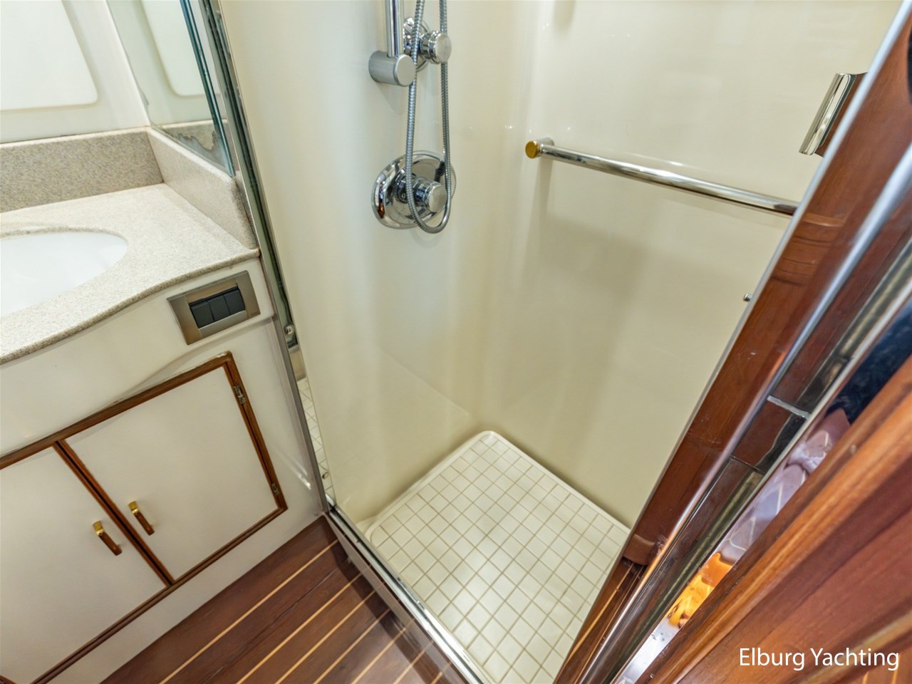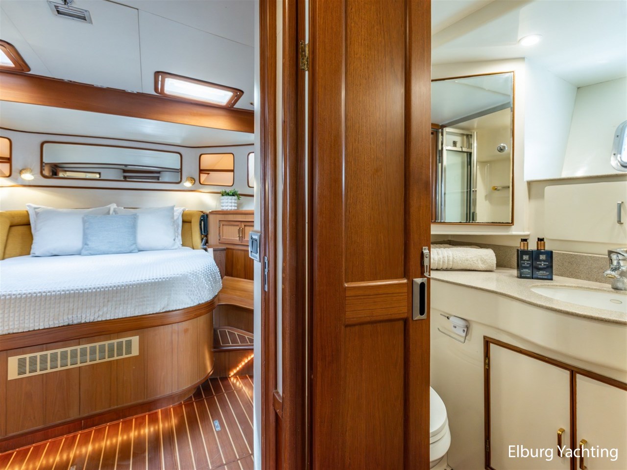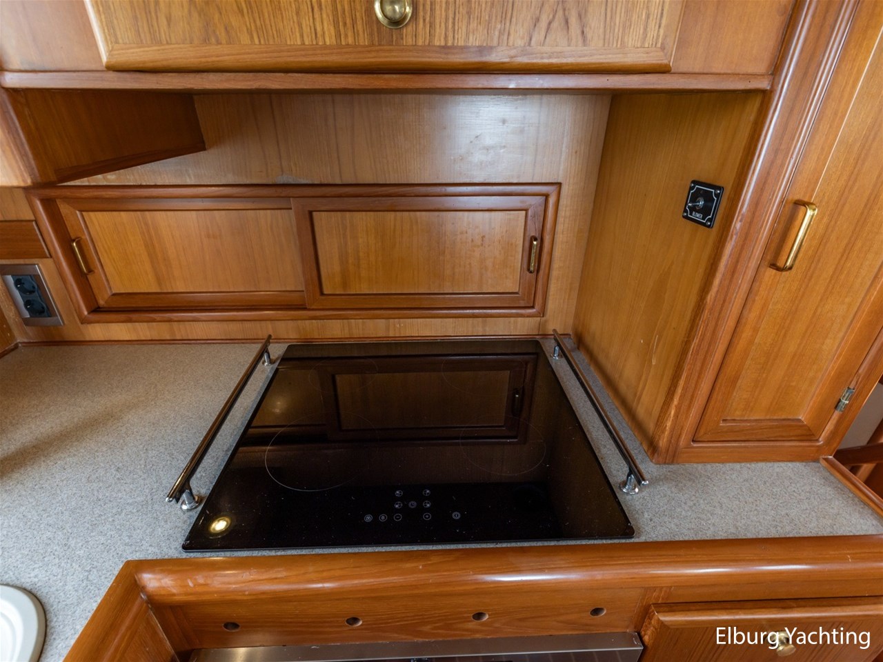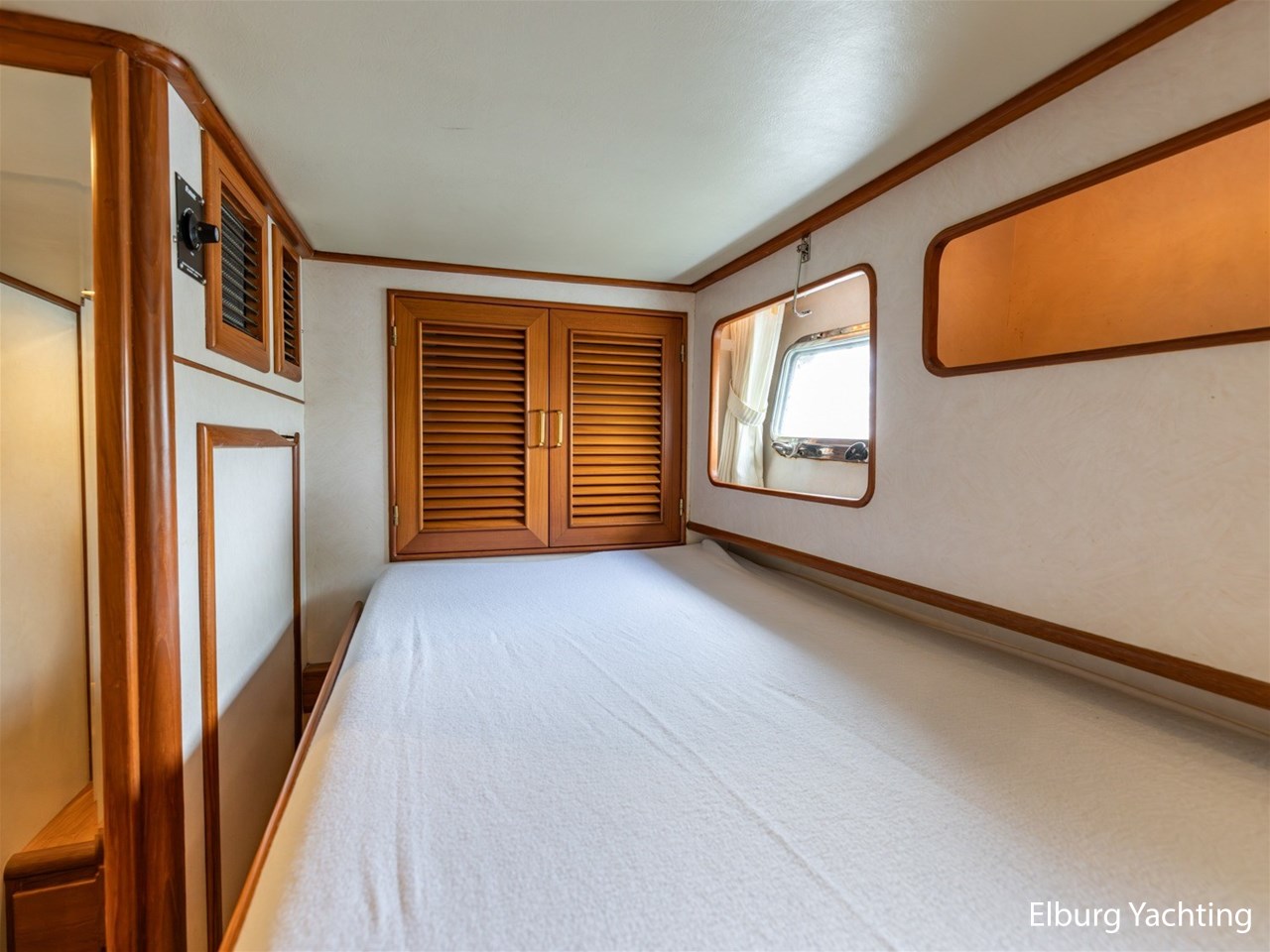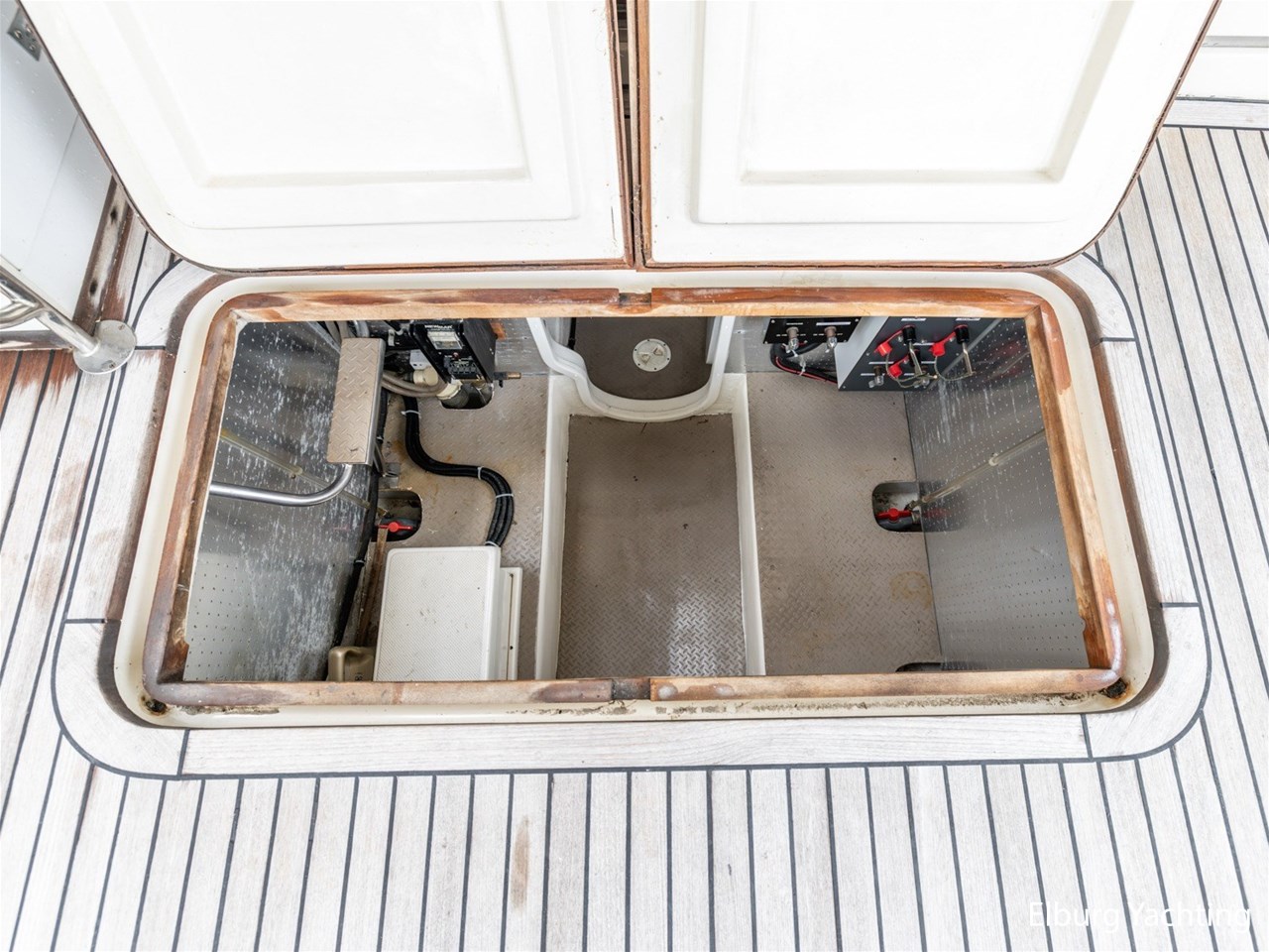 De indeling biedt een ruime eigenaarshut met kingsize 2 pers. bed en badkamer ensuite, twee extra slaaphutten met elk 2 x een 1 pers. bed. , drie dinette-opstellingen en een grote salon met veel daglicht. De flybridge is bereikbaar via zowel het stuurhuis als het achterdek., ruime zitgelegenheid op flybridge, bijbootsteunen op vaste dak. Het jacht is voorzien van een volledig teakdek rondom, ruime bergmogelijkheden en een separate toegang tot de machinekamer.
