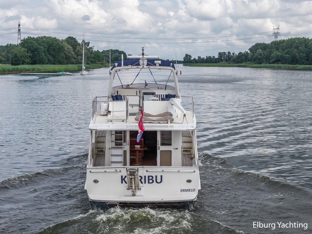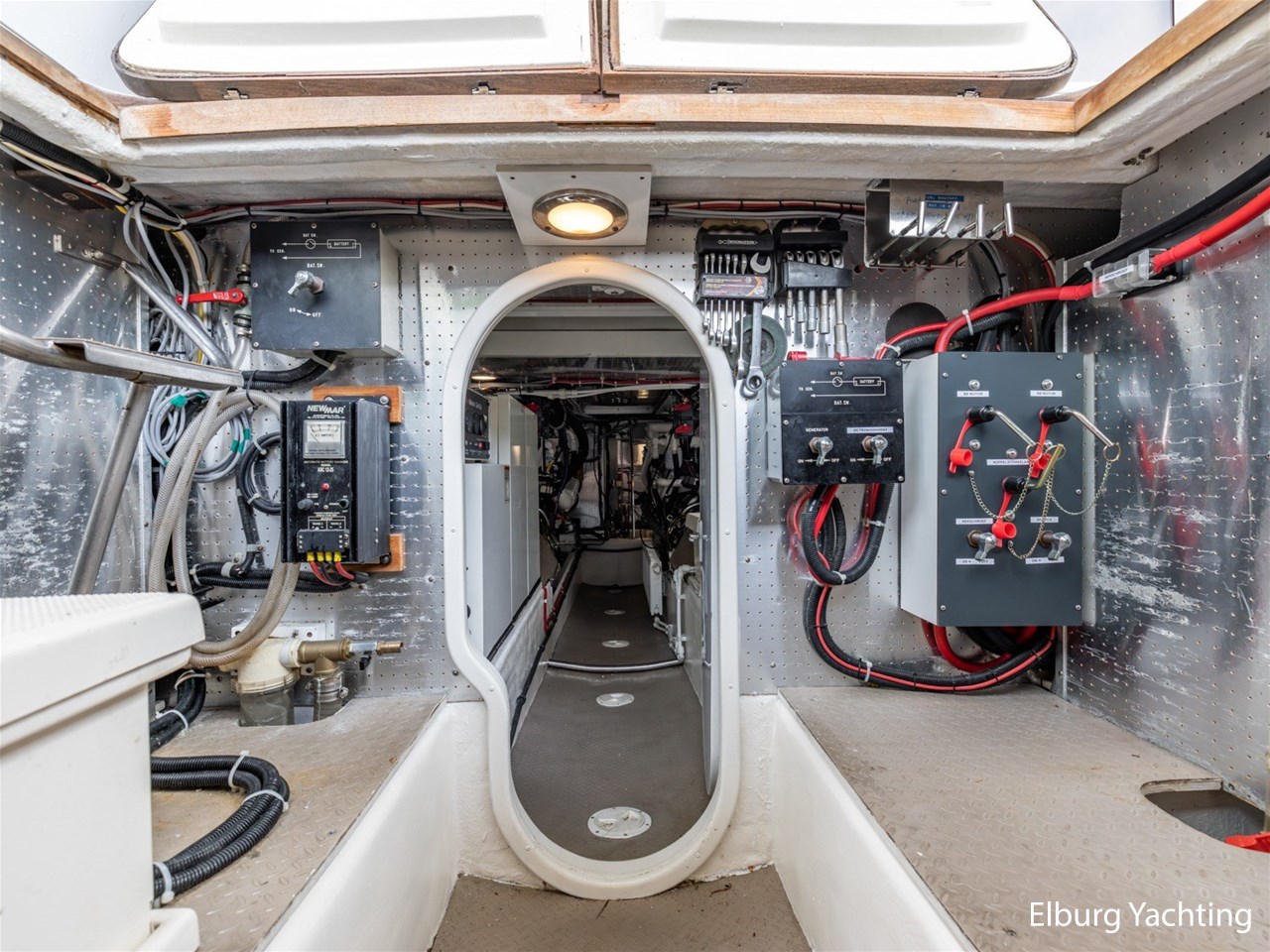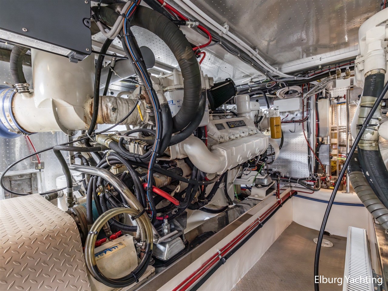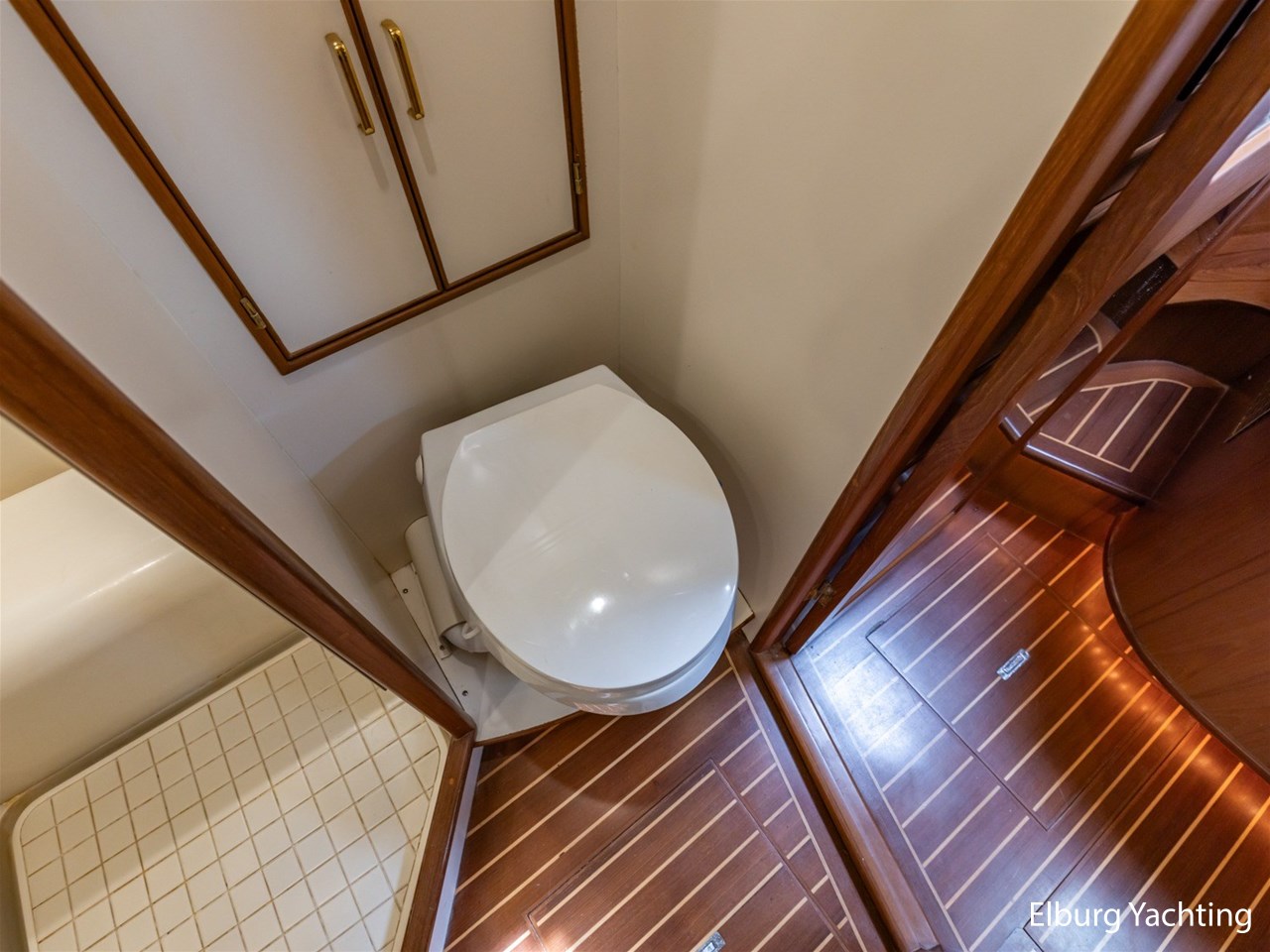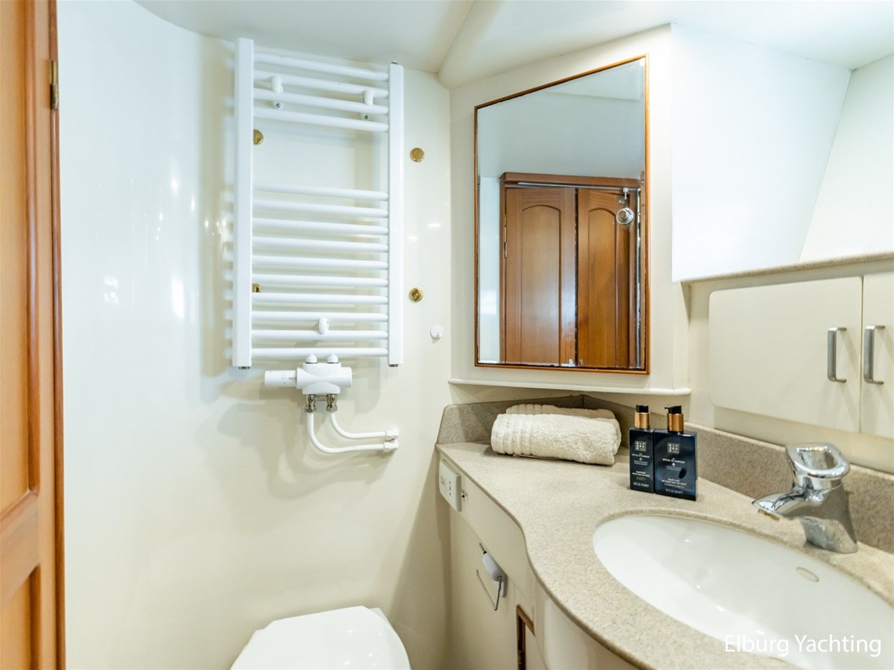 De indeling biedt een ruime eigenaarshut met kingsize 2 pers. bed en badkamer ensuite, twee extra slaaphutten met elk 2 x een 1 pers. bed. , drie dinette-opstellingen en een grote salon met veel daglicht. De flybridge is bereikbaar via zowel het stuurhuis als het achterdek., ruime zitgelegenheid op flybridge, bijbootsteunen op vaste dak. Het jacht is voorzien van een volledig teakdek rondom, ruime bergmogelijkheden en een separate toegang tot de machinekamer.