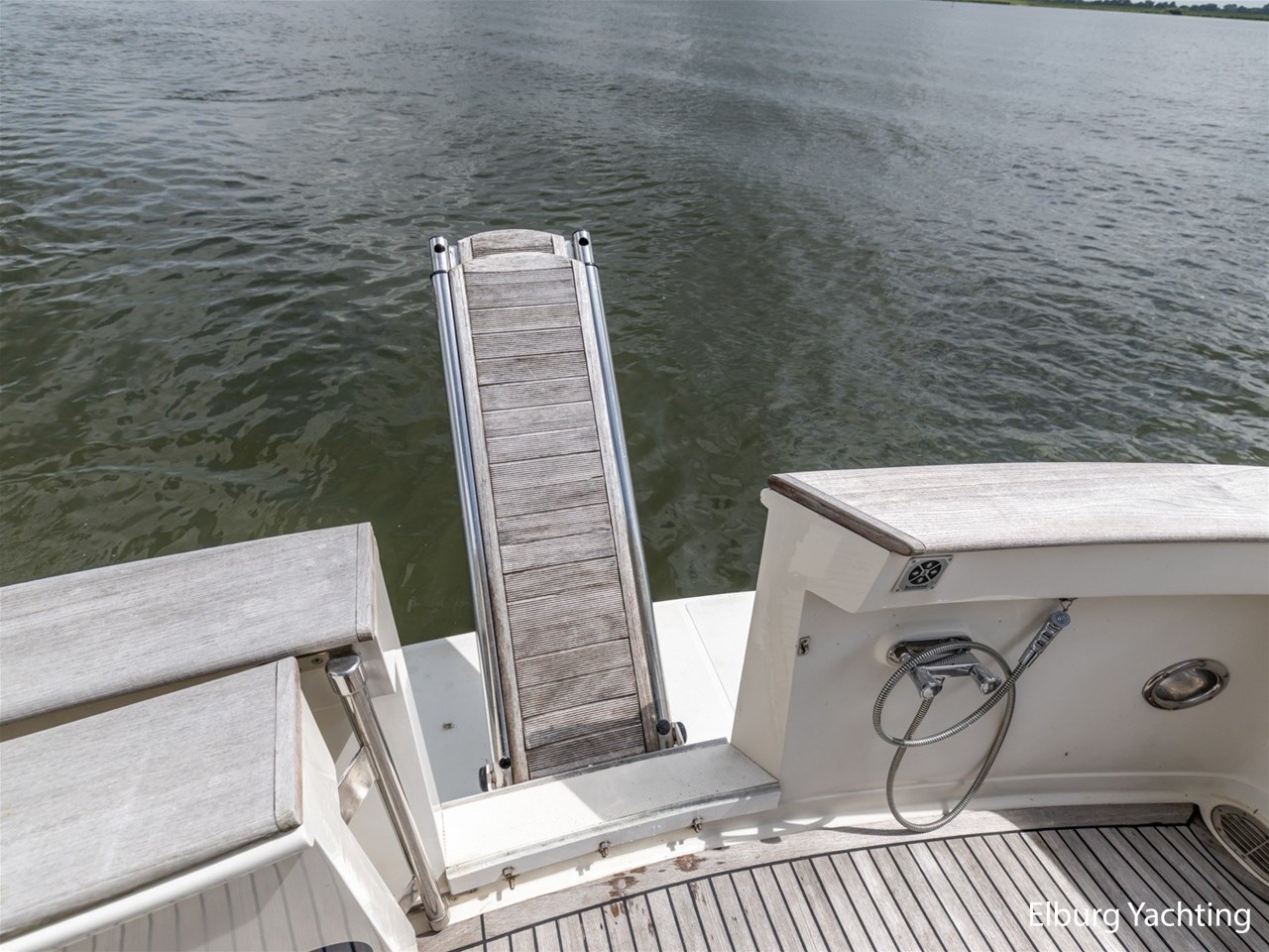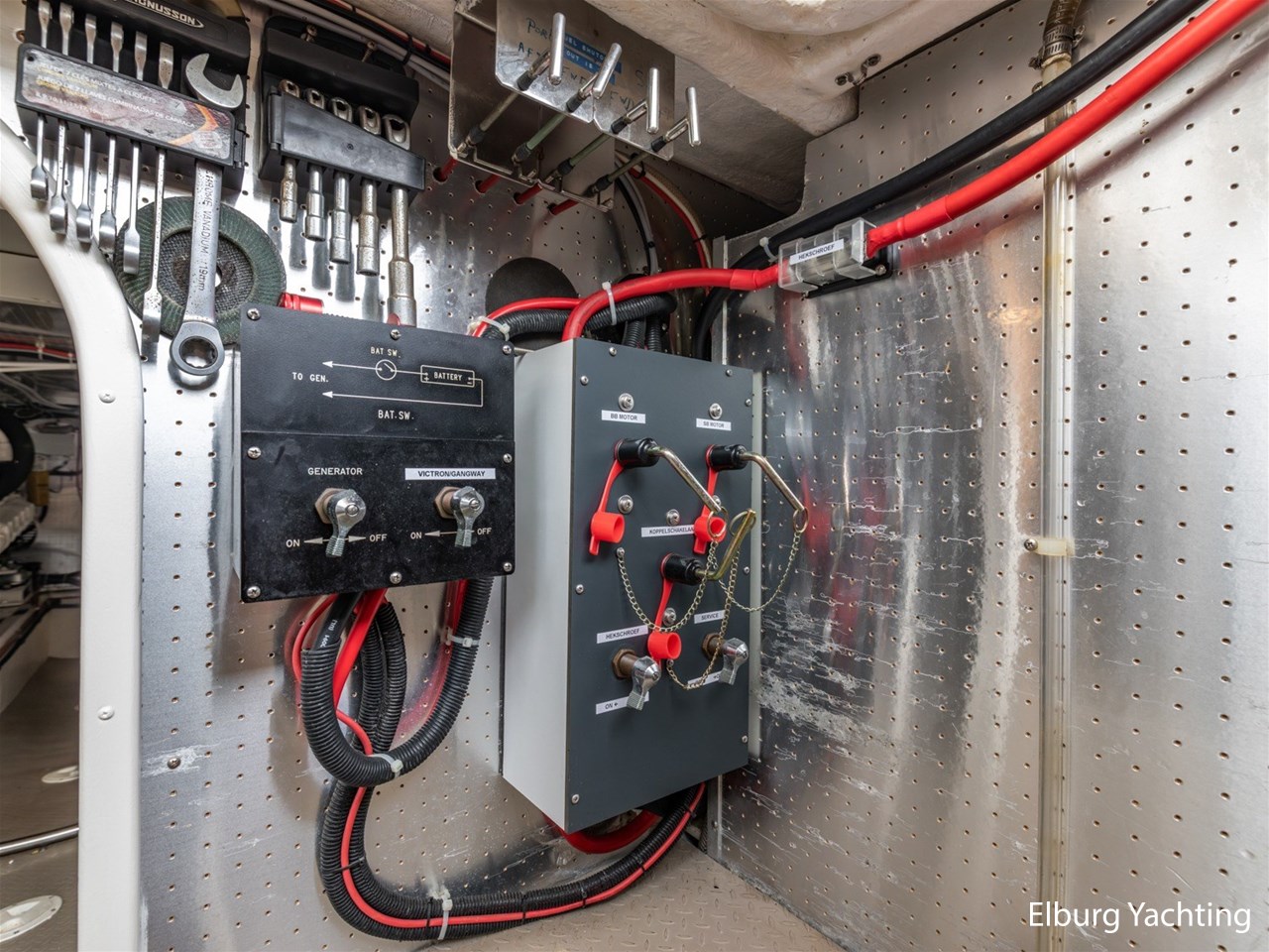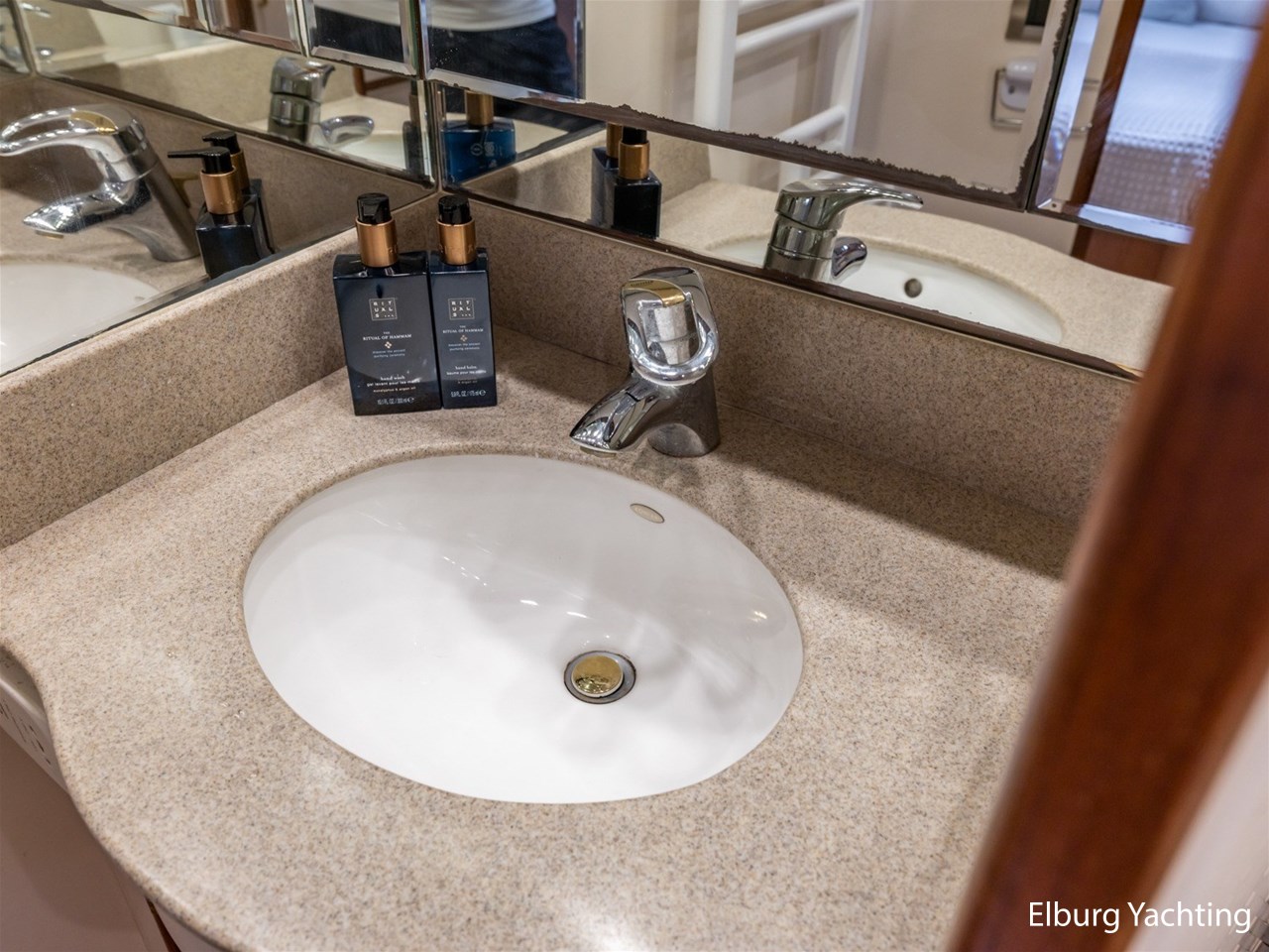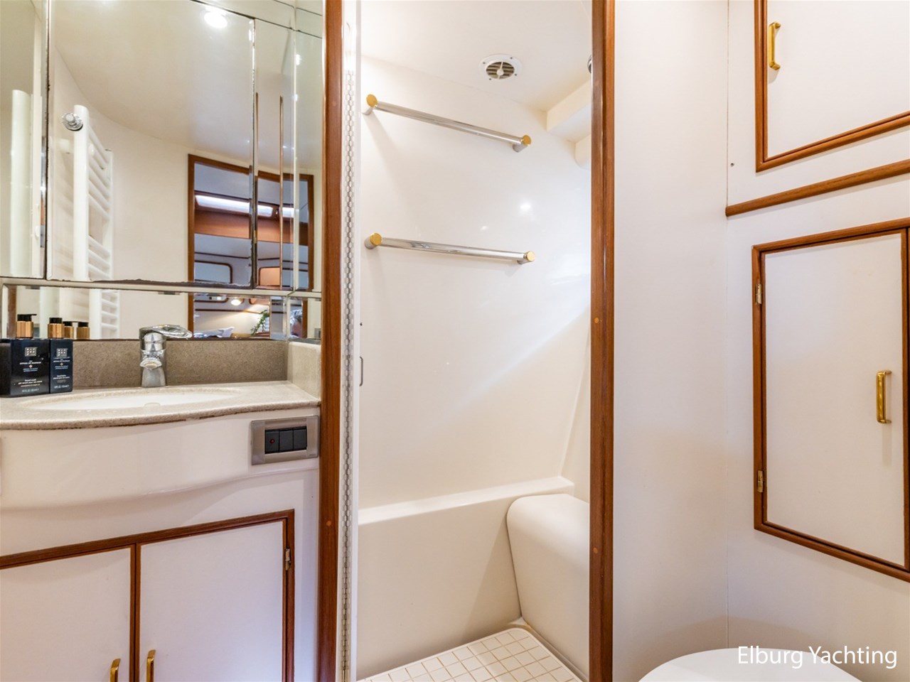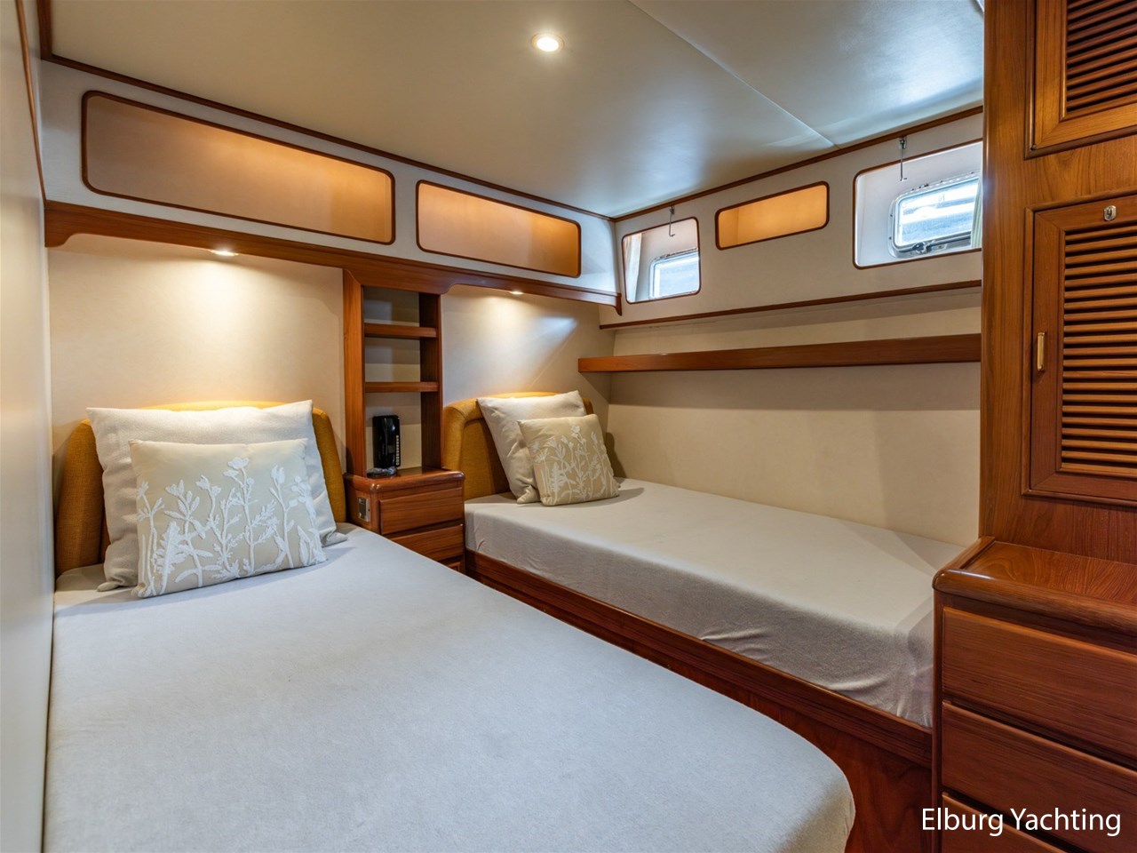 De indeling biedt een ruime eigenaarshut met kingsize 2 pers. bed en badkamer ensuite, twee extra slaaphutten met elk 2 x een 1 pers. bed. , drie dinette-opstellingen en een grote salon met veel daglicht. De flybridge is bereikbaar via zowel het stuurhuis als het achterdek., ruime zitgelegenheid op flybridge, bijbootsteunen op vaste dak. Het jacht is voorzien van een volledig teakdek rondom, ruime bergmogelijkheden en een separate toegang tot de machinekamer.