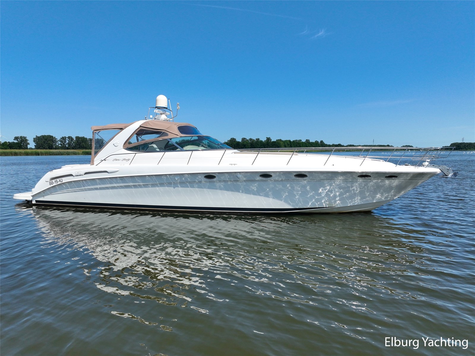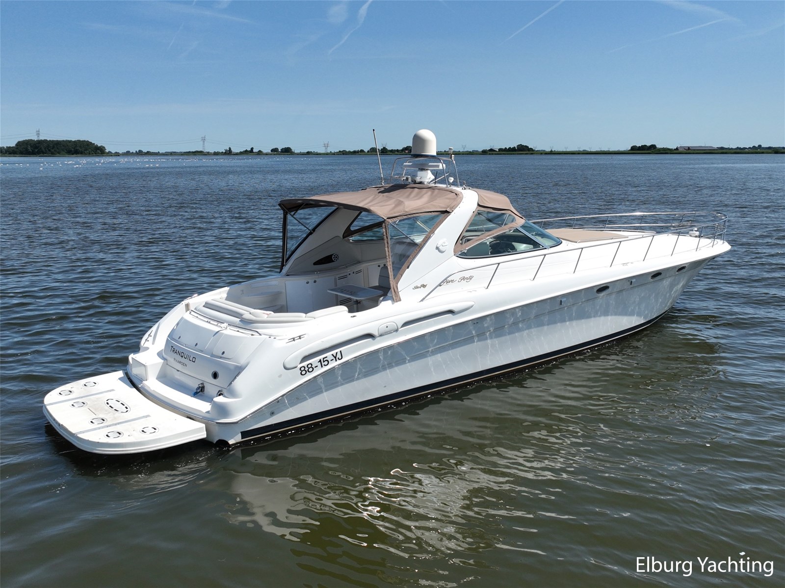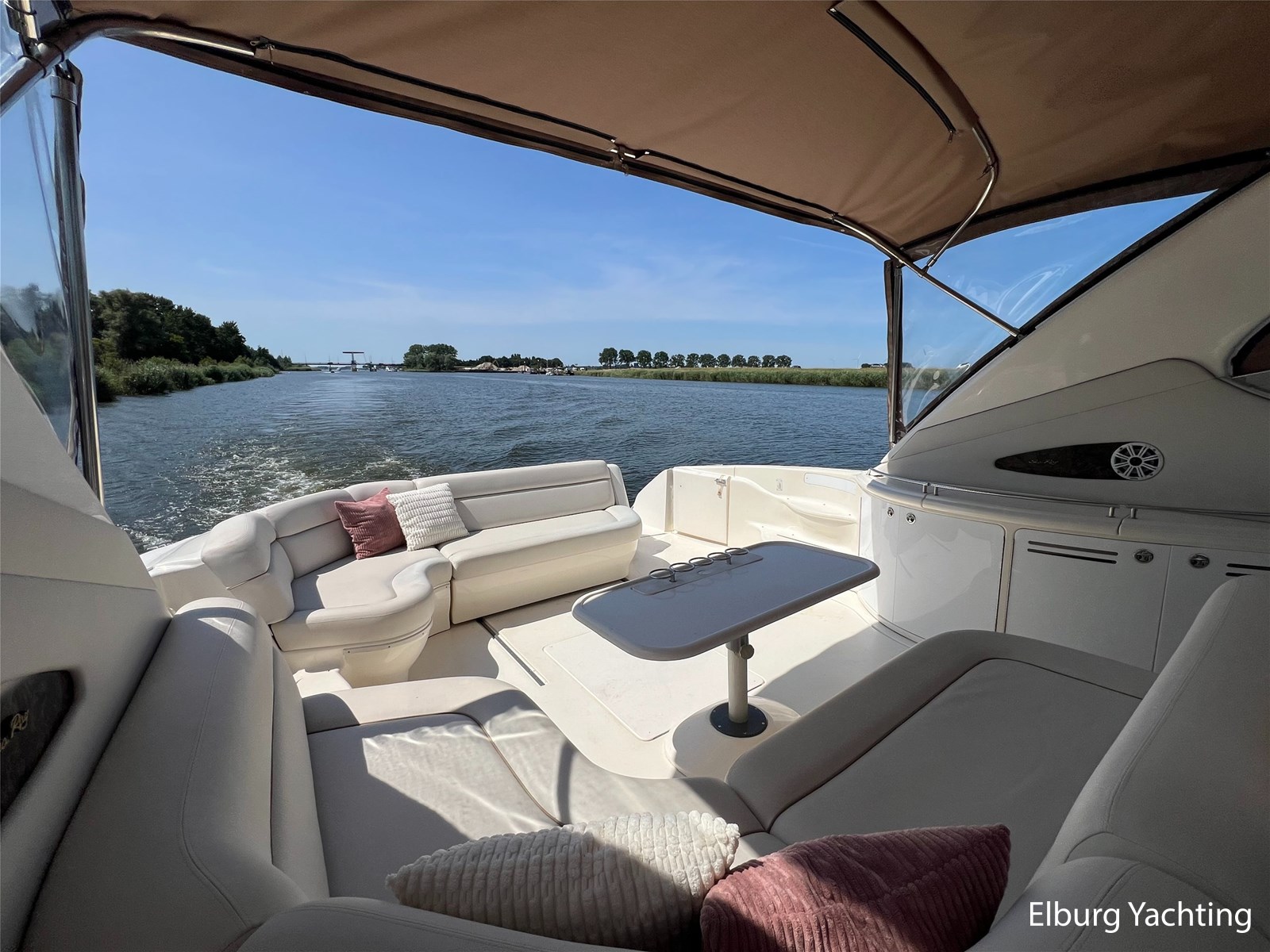 Deze Sea Ray 540 DA is oorspronkelijk ontworpen en gebouwd voor de Europese markt. De ruimte in de open kuip is zowel vanaf de oppervlakte als de hoogte indrukwekkend. Via het hydraulisch zwemplatform stap je in de ruime open kuip waar een ook grote groep mensen comfortabel kan zitten. De wetbar biedt een koelkast met spoelbak. De verhoogde stuurstand biedt plaats voor de kapitein en twee opvarenden. De stuurstand biedt hoog en goed zicht rondom. Benedendeks is er een zeer ruimte salon met aangesloten kombuis gesitueerd. Midscheeps bevindt zich de eigenaarshut met een vrij omloopbaar 2-persoons bed inclusief eigen sanitair en-suite. In het voorschip bevindt zich de gastenhut met eveneens een 2-persoons bed. De tweede badkamer in het voorschip kan ook door daggasten worden gebruikt. Deze Sea Ray 540 is uitgerust met: volledige tent over de open kuip, de kuip is afsluitbaar met een deur naar het zwemplatform, losse tafel, groot zonnebed op voordek, r.v.s. fenderhouders, wasmachine in voorhut, machinekamer toegankelijk vanuit open kuip. Volledige kuipten en bekleding van de banken in de kuip vernieuwd in 2022.