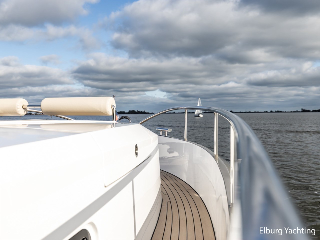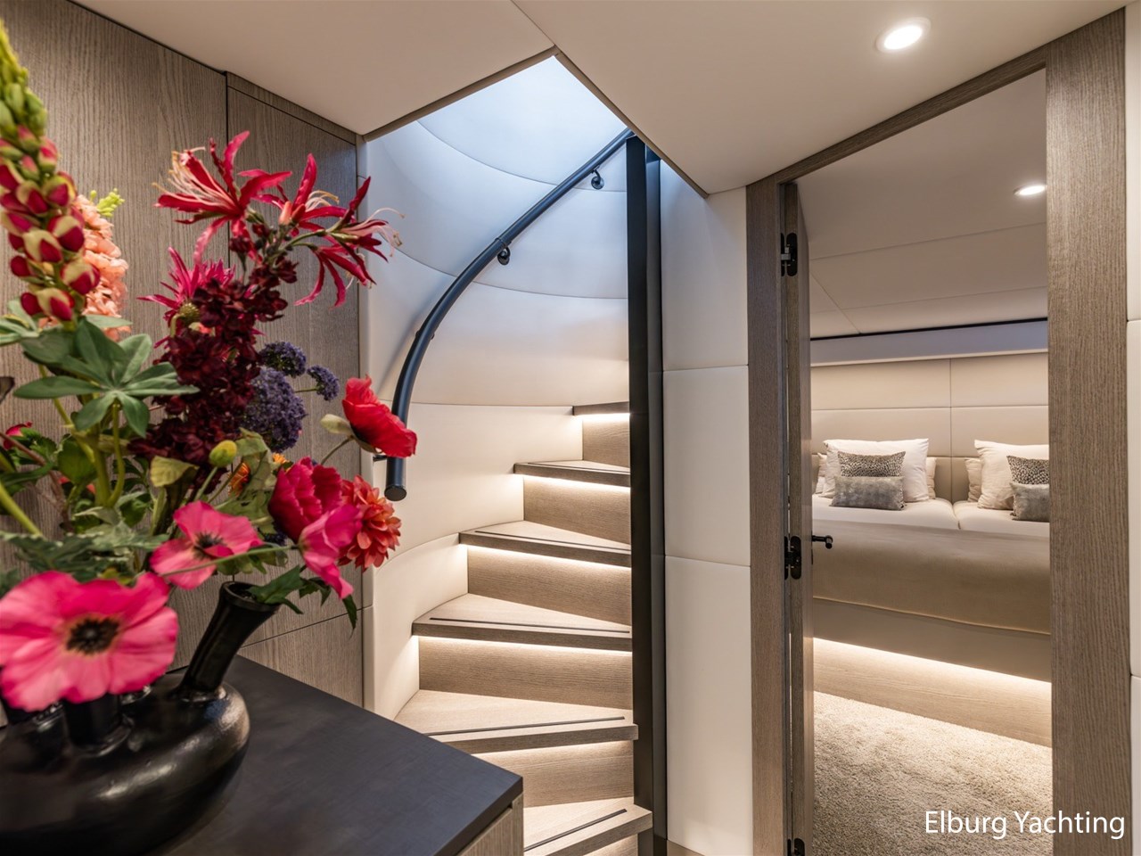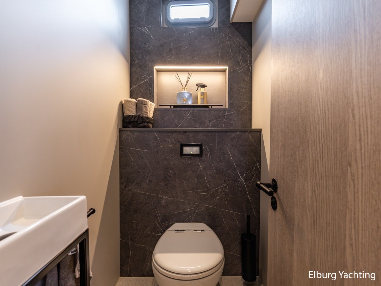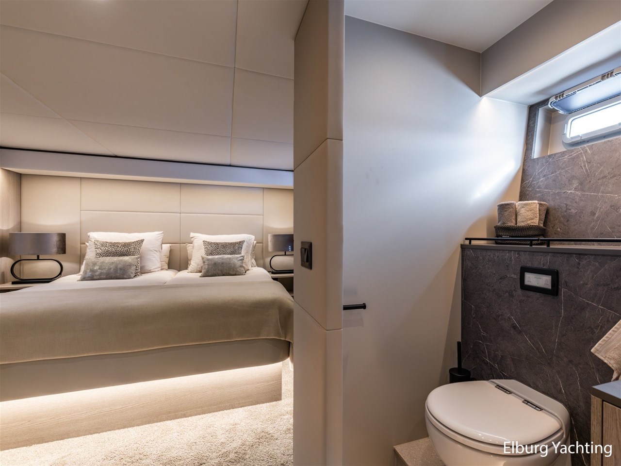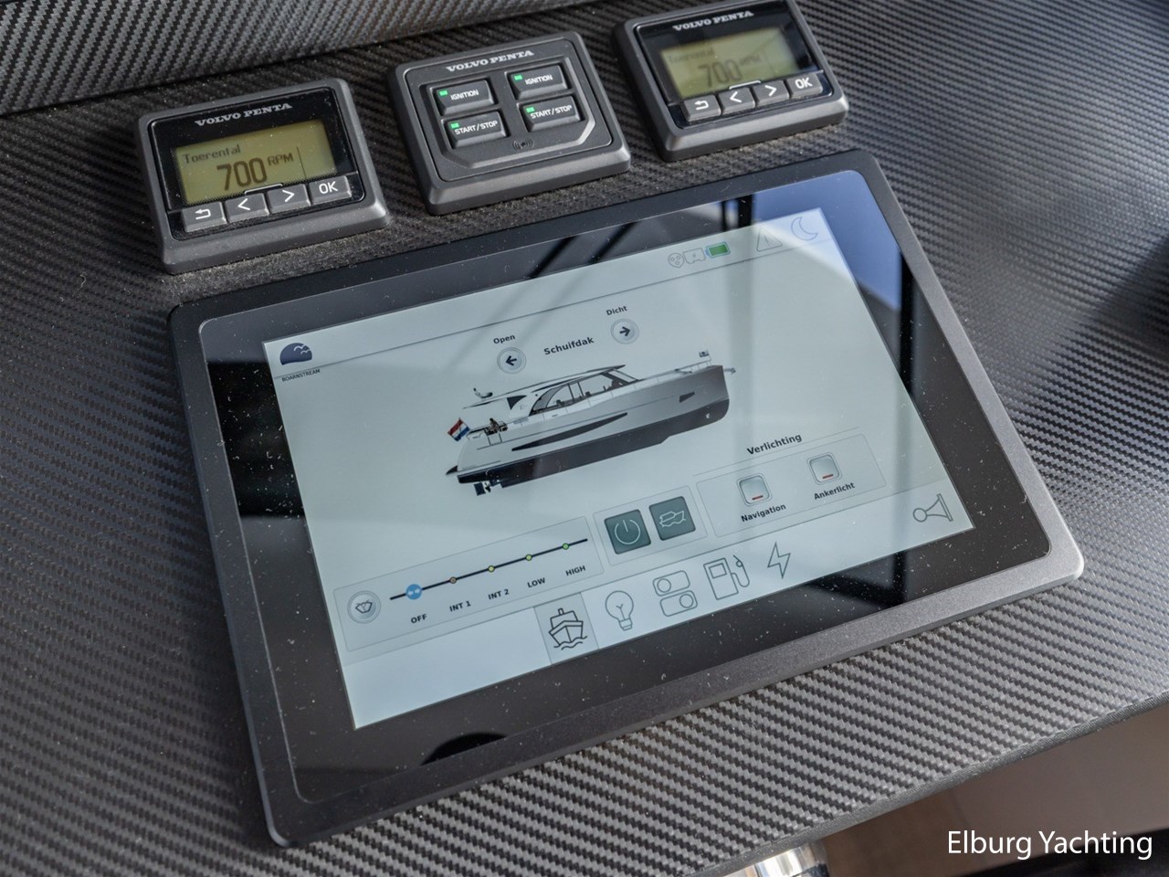 Via een elegante wenteltrap met geïntegreerde verlichting en wandbekleding bereikt u de eigenaarshut met kingsize bed, luxe afwerking en eigen badkamer en-suite. Voorin bevindt zich de gastenhut, voorzien van een eigen badkamer, een apart toilet en een dubbel tegenovergesteld vluchtluik. Beide badkamers en toilet zijn voorzien van Getacore vloeren. Op het voordek bevindt zich een royaal zonnedek met twee verstelbare zonnebedden en twee r.v.s. opbergvakken voor fenders. Daarvoor is een comfortabele zitgelegenheid gecreëerd, waar tevens de mogelijkheid bestaat om buiten te varen. De buitenstuurstand is uitgerust met roerbediening en Volvo Penta EVC-gashendels. Aanvullend is er een Dockmate-afstandsbediening aanwezig, waarmee niet alleen de boeg- en hekschroef maar ook de motoren kunnen worden bediend, ideaal voor comfortabel en nauwkeurig manoeuvreren.
