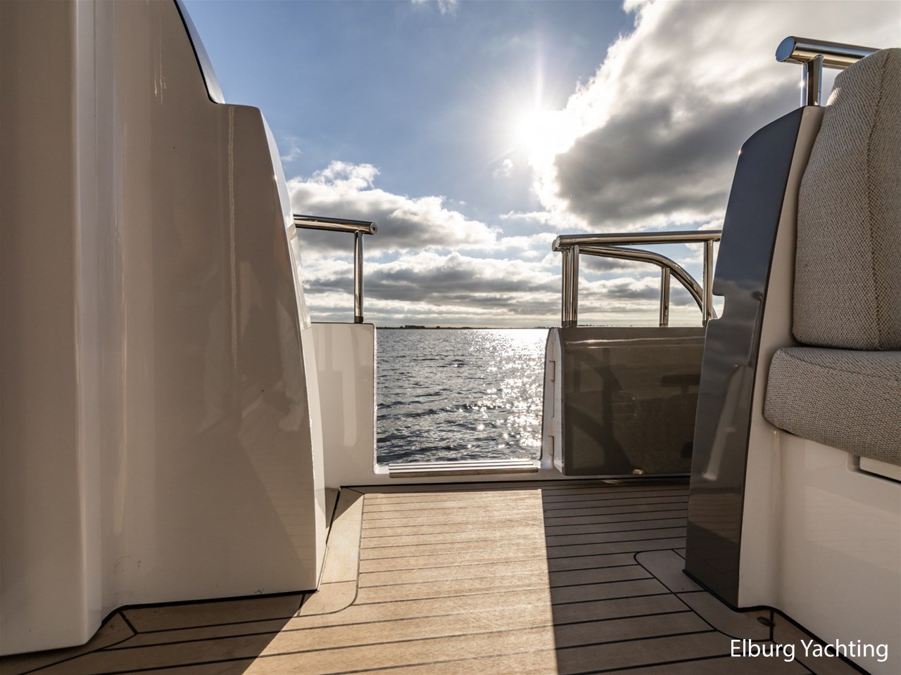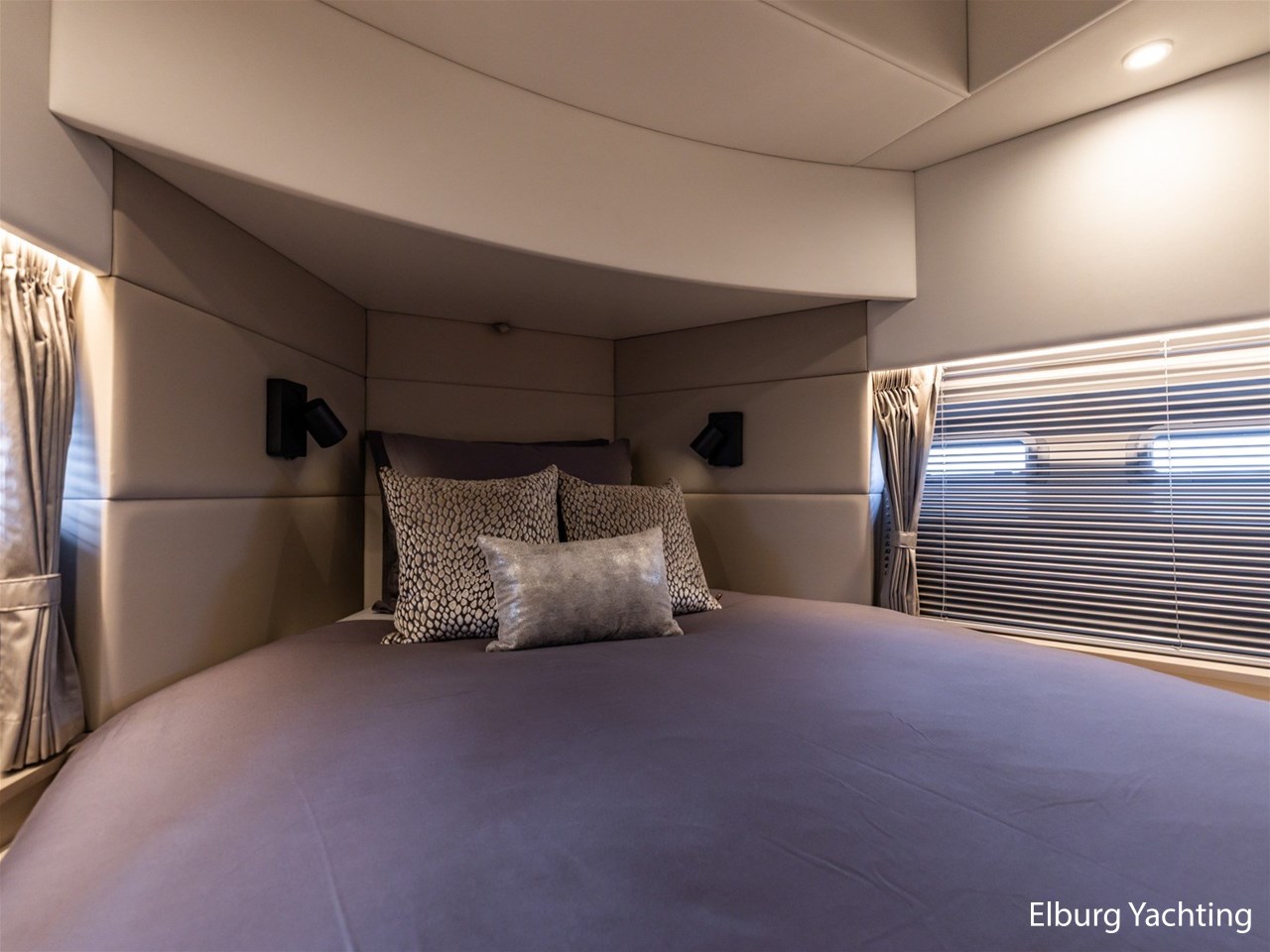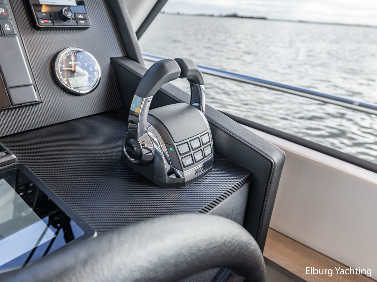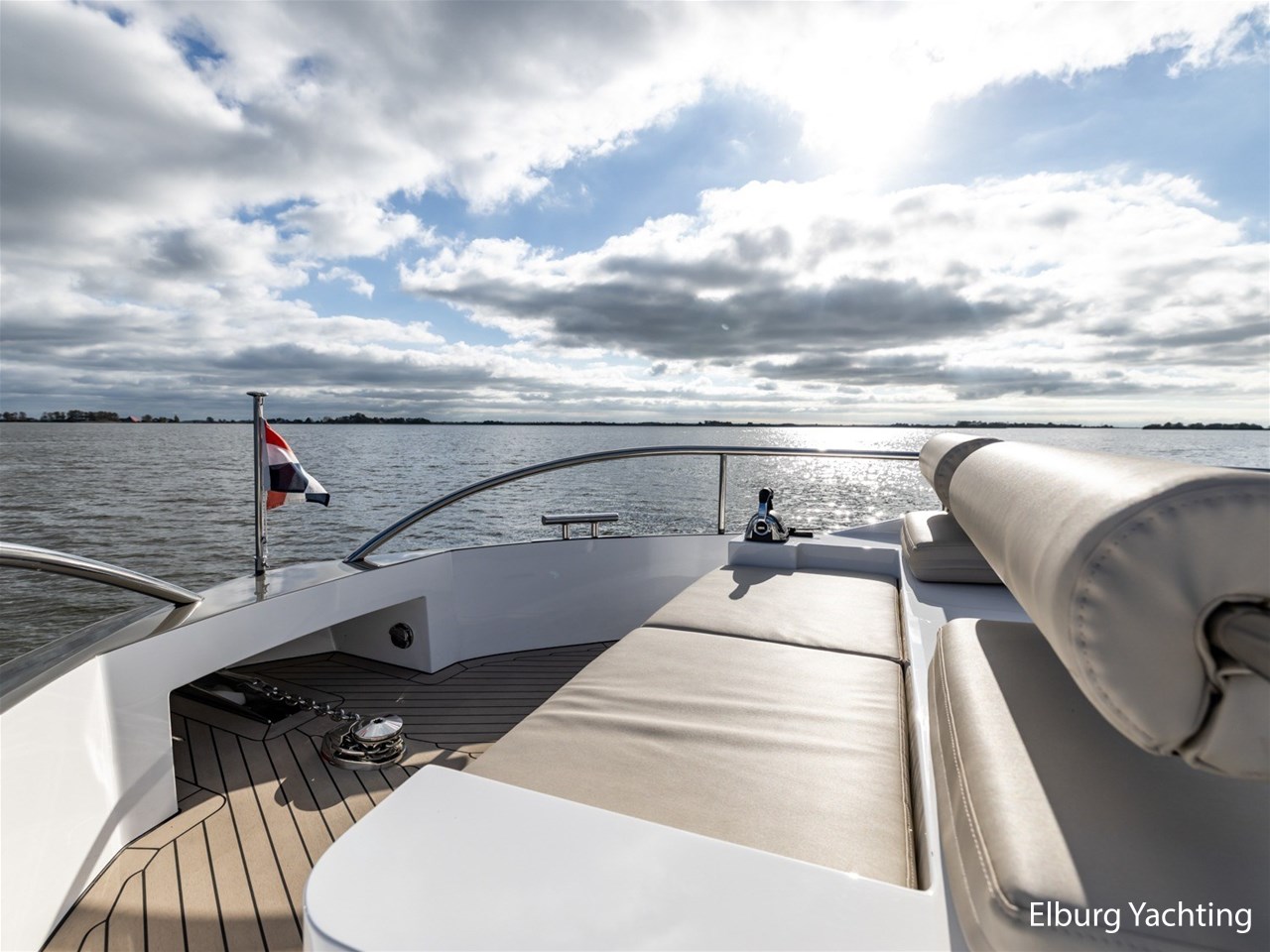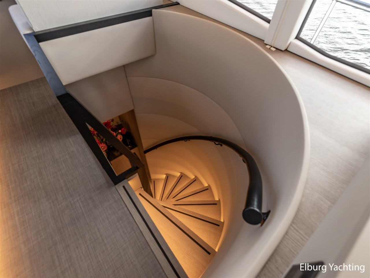 Via een elegante wenteltrap met geïntegreerde verlichting en wandbekleding bereikt u de eigenaarshut met kingsize bed, luxe afwerking en eigen badkamer en-suite. Voorin bevindt zich de gastenhut, voorzien van een eigen badkamer, een apart toilet en een dubbel tegenovergesteld vluchtluik. Beide badkamers en toilet zijn voorzien van Getacore vloeren. Op het voordek bevindt zich een royaal zonnedek met twee verstelbare zonnebedden en twee r.v.s. opbergvakken voor fenders. Daarvoor is een comfortabele zitgelegenheid gecreëerd, waar tevens de mogelijkheid bestaat om buiten te varen. De buitenstuurstand is uitgerust met roerbediening en Volvo Penta EVC-gashendels. Aanvullend is er een Dockmate-afstandsbediening aanwezig, waarmee niet alleen de boeg- en hekschroef maar ook de motoren kunnen worden bediend, ideaal voor comfortabel en nauwkeurig manoeuvreren.