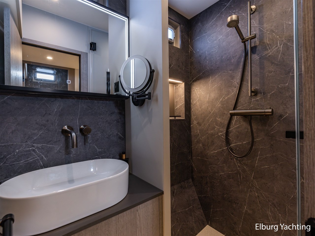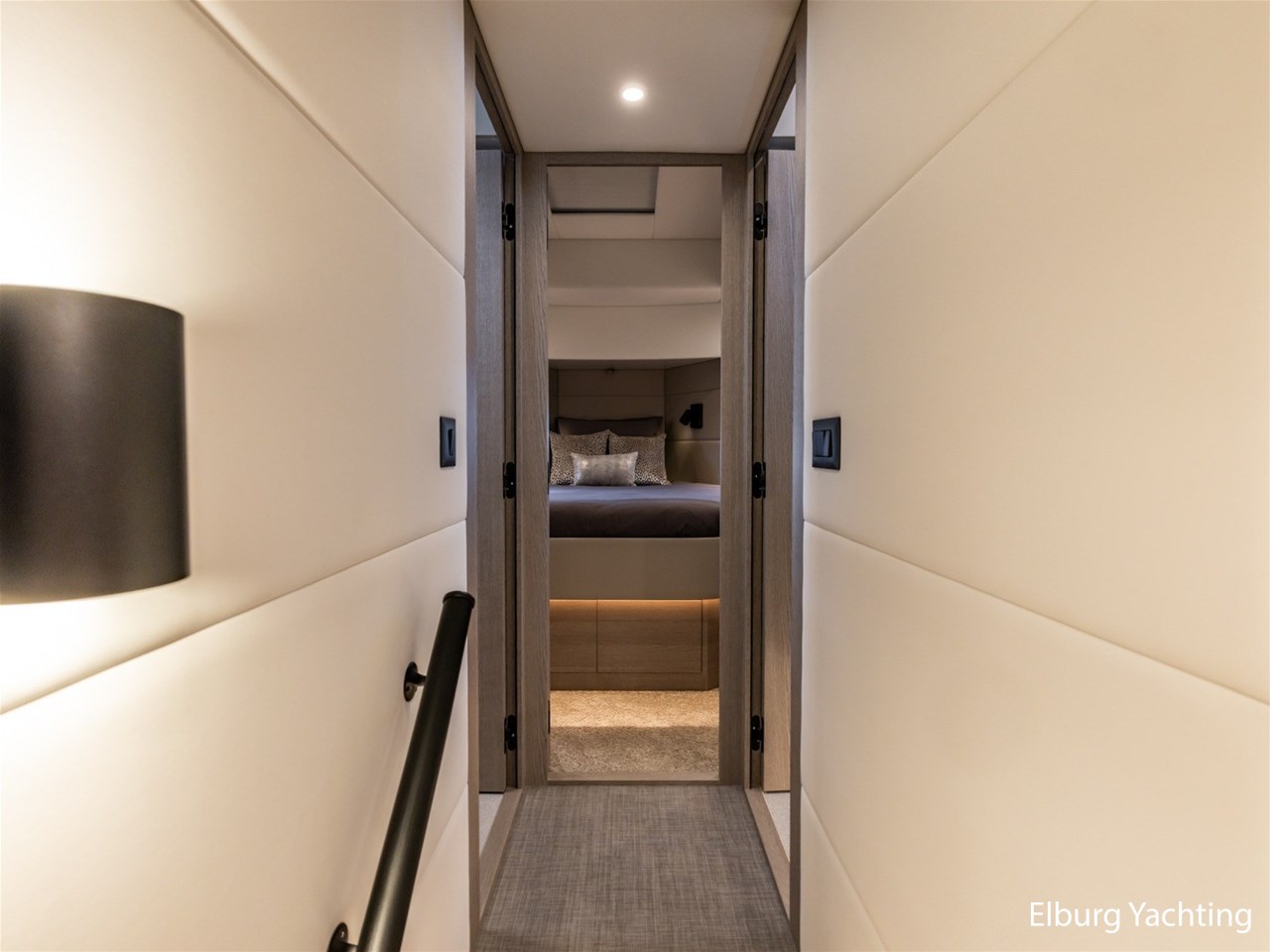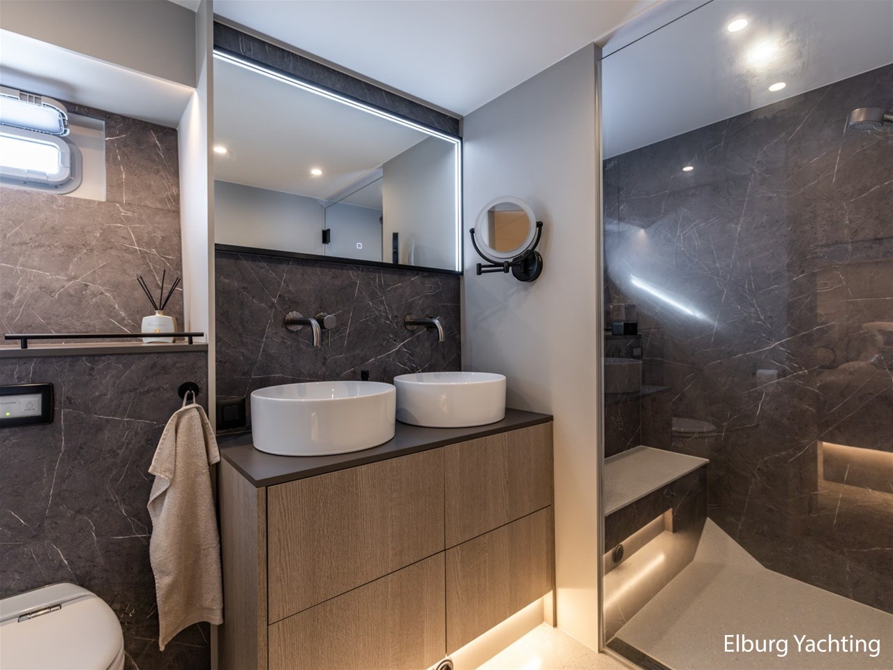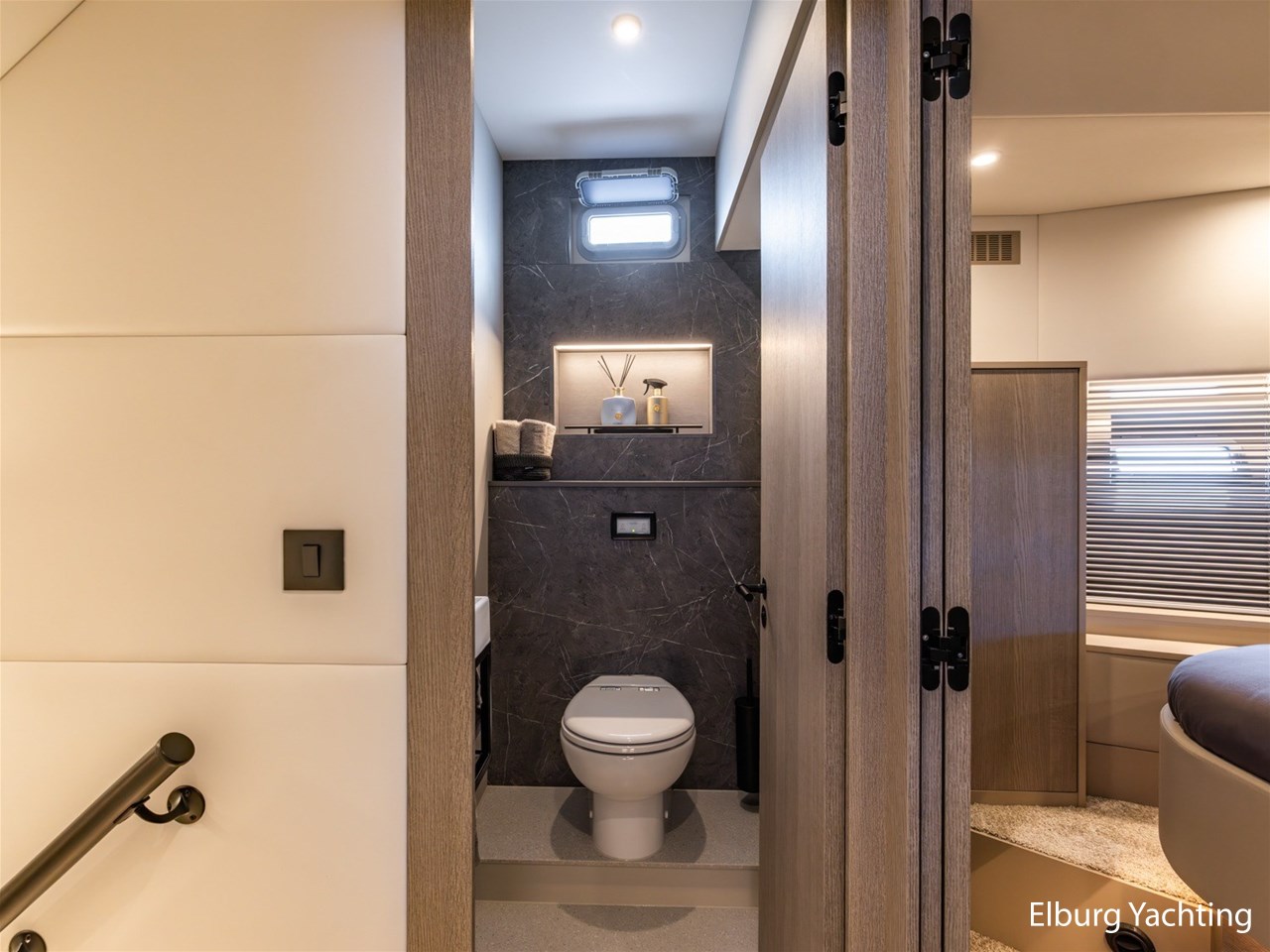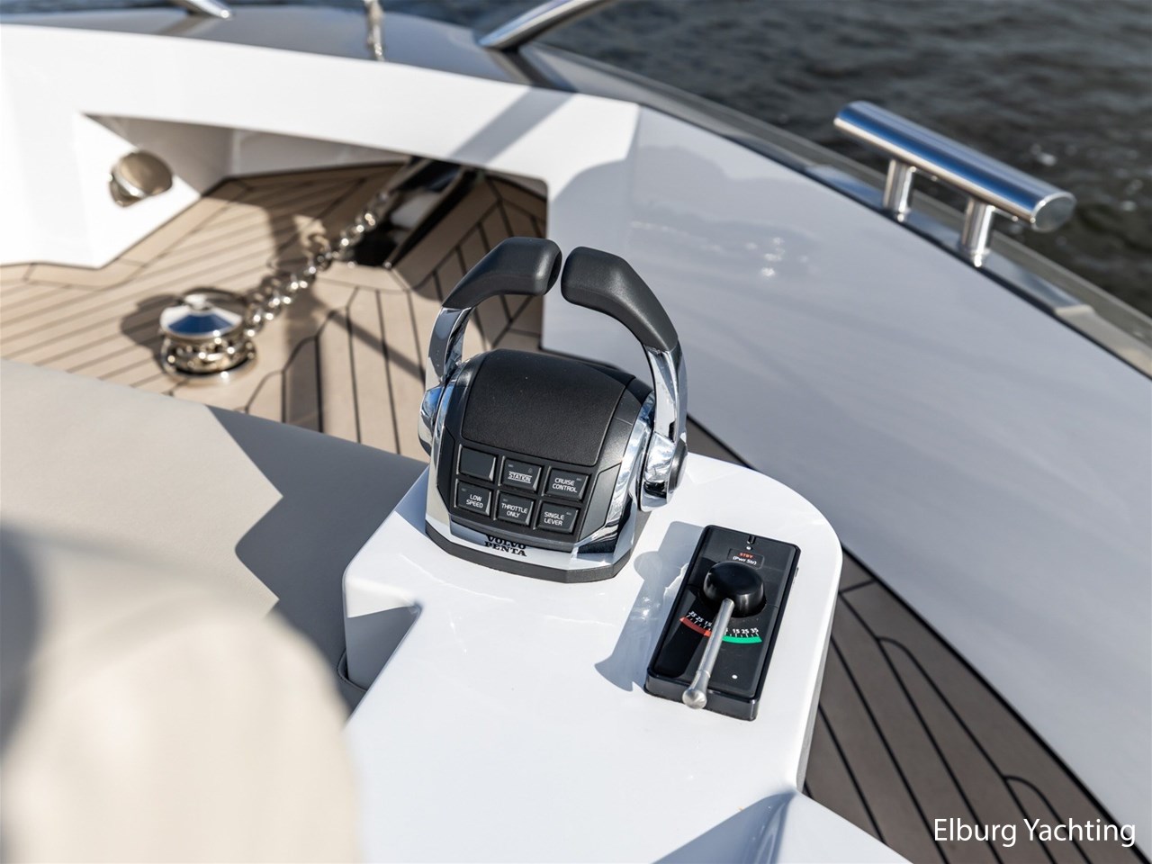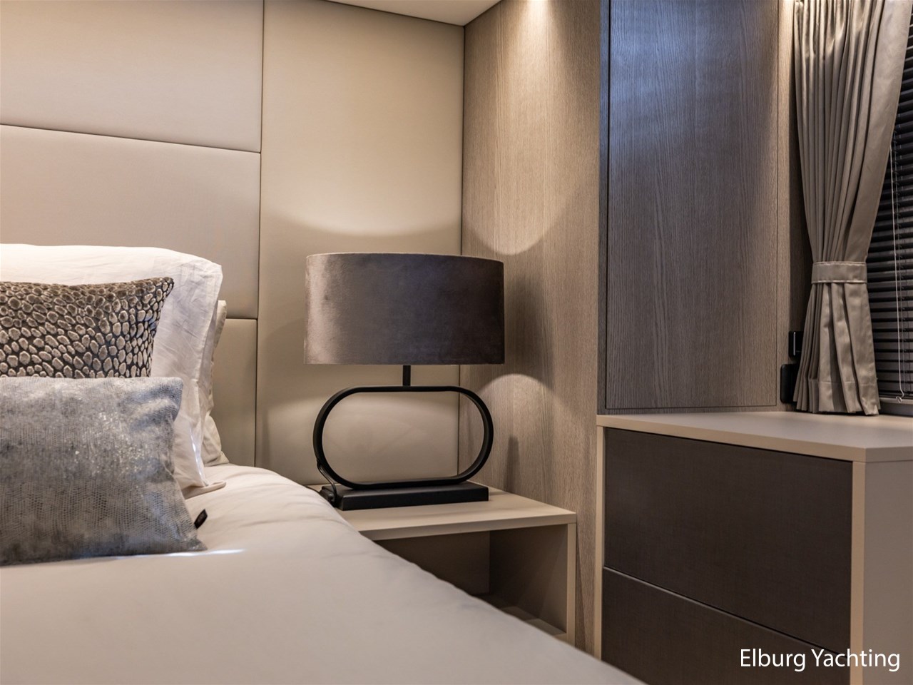 Via een elegante wenteltrap met geïntegreerde verlichting en wandbekleding bereikt u de eigenaarshut met kingsize bed, luxe afwerking en eigen badkamer en-suite. Voorin bevindt zich de gastenhut, voorzien van een eigen badkamer, een apart toilet en een dubbel tegenovergesteld vluchtluik. Beide badkamers en toilet zijn voorzien van Getacore vloeren. Op het voordek bevindt zich een royaal zonnedek met twee verstelbare zonnebedden en twee r.v.s. opbergvakken voor fenders. Daarvoor is een comfortabele zitgelegenheid gecreëerd, waar tevens de mogelijkheid bestaat om buiten te varen. De buitenstuurstand is uitgerust met roerbediening en Volvo Penta EVC-gashendels. Aanvullend is er een Dockmate-afstandsbediening aanwezig, waarmee niet alleen de boeg- en hekschroef maar ook de motoren kunnen worden bediend, ideaal voor comfortabel en nauwkeurig manoeuvreren.