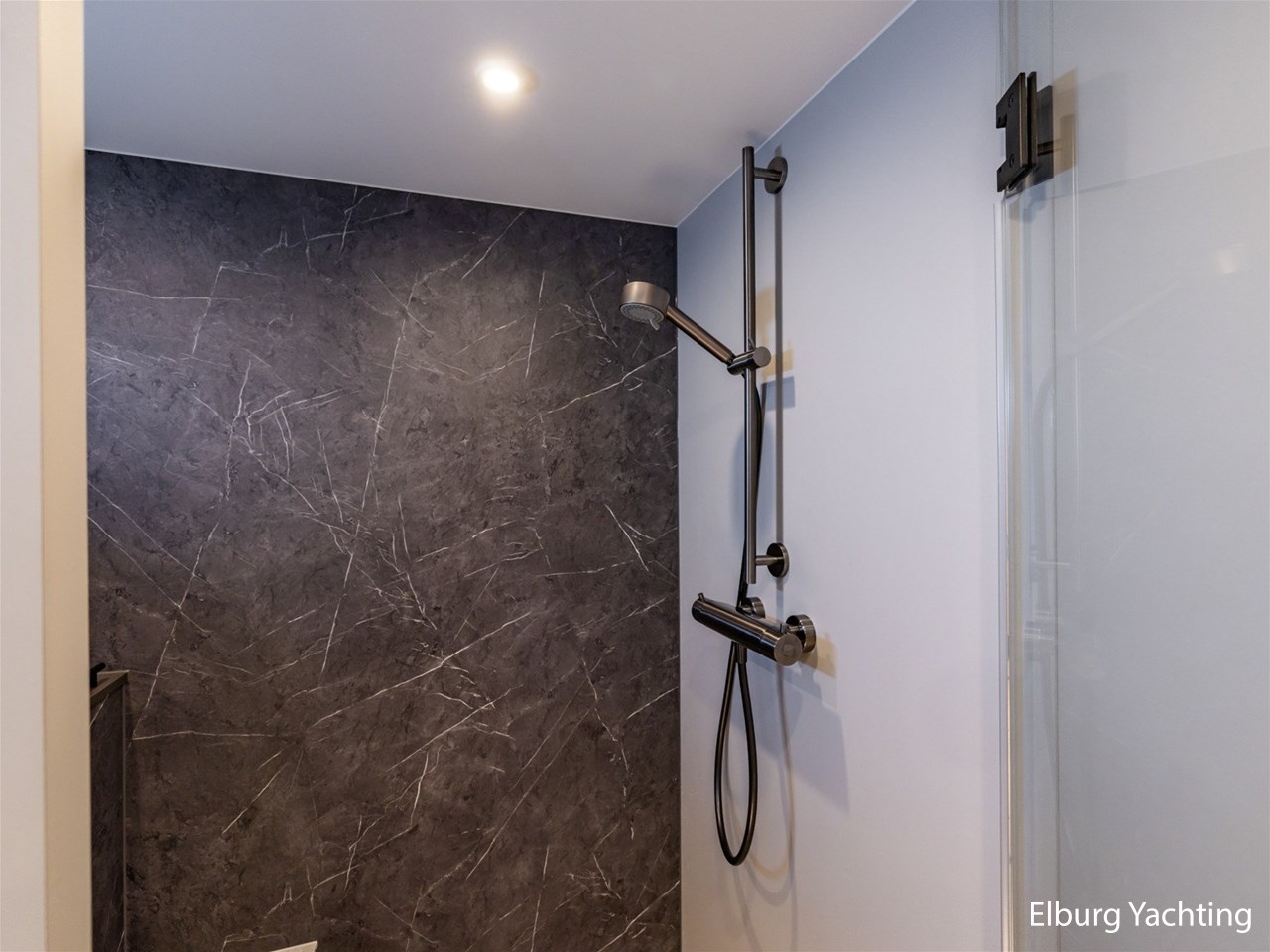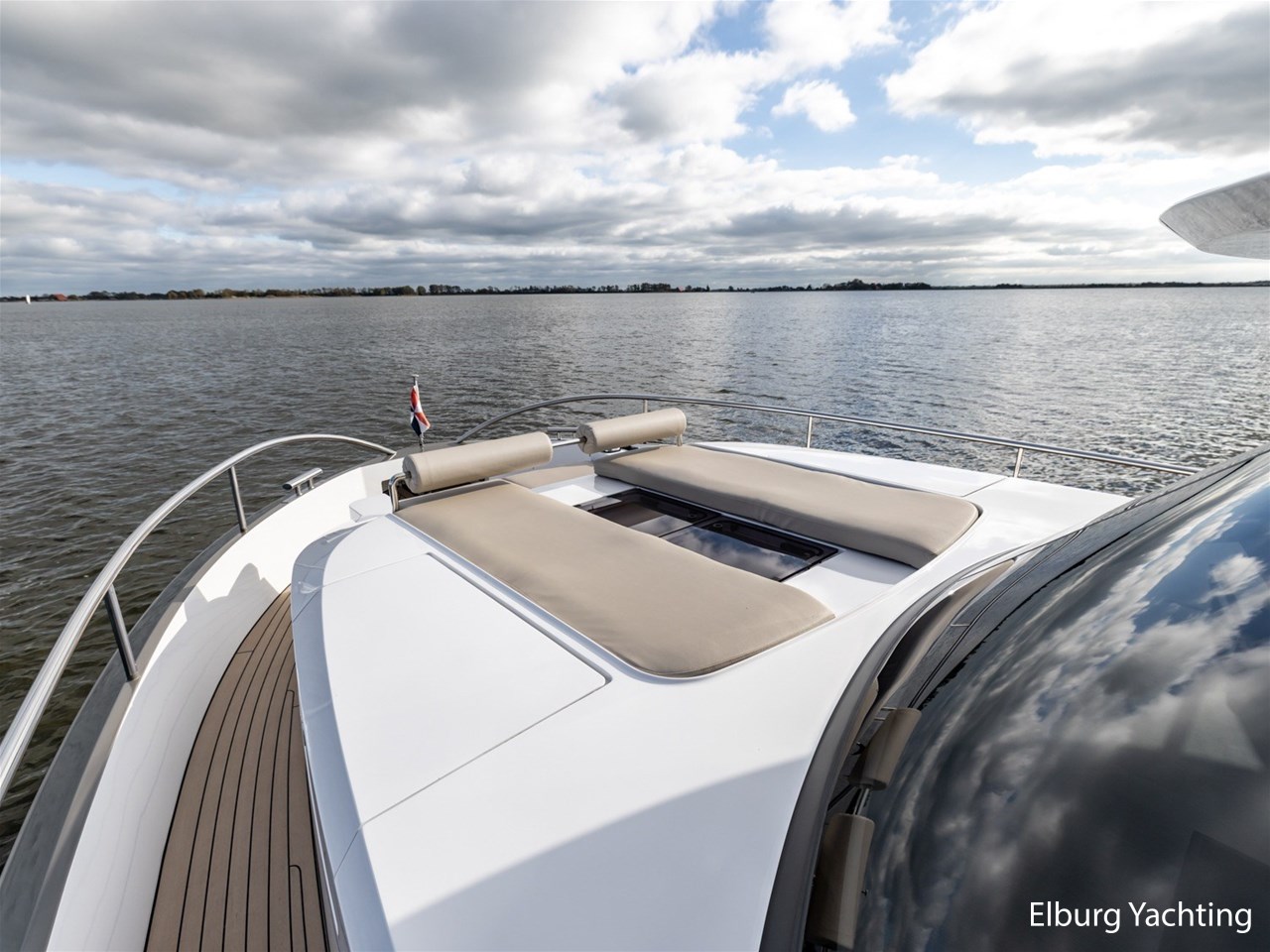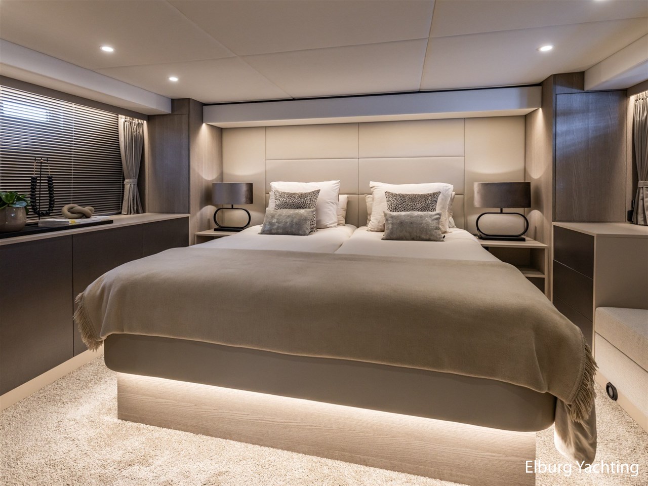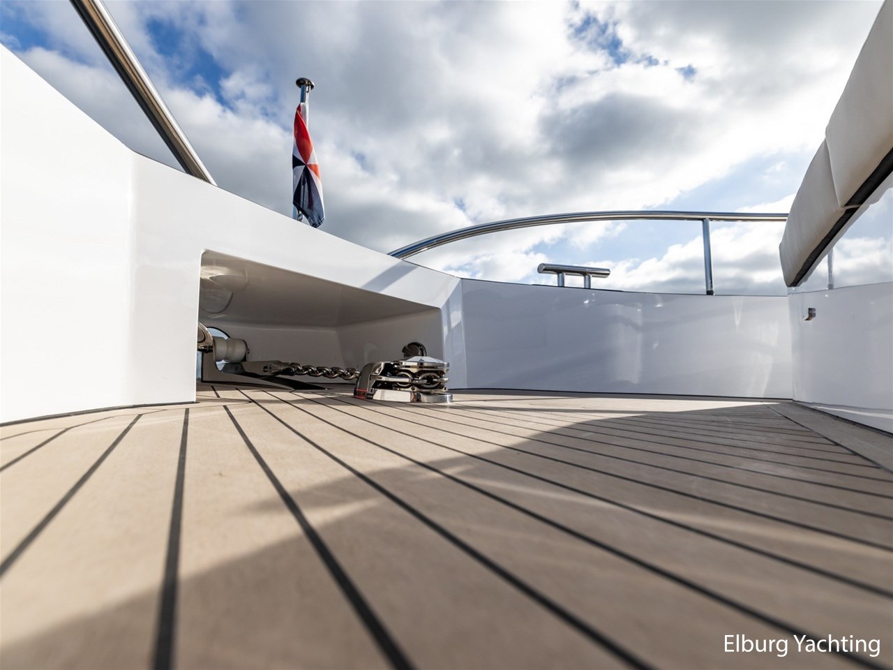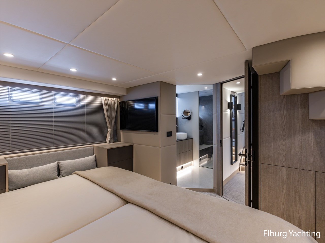 Via een elegante wenteltrap met geïntegreerde verlichting en wandbekleding bereikt u de eigenaarshut met kingsize bed, luxe afwerking en eigen badkamer en-suite. Voorin bevindt zich de gastenhut, voorzien van een eigen badkamer, een apart toilet en een dubbel tegenovergesteld vluchtluik. Beide badkamers en toilet zijn voorzien van Getacore vloeren. Op het voordek bevindt zich een royaal zonnedek met twee verstelbare zonnebedden en twee r.v.s. opbergvakken voor fenders. Daarvoor is een comfortabele zitgelegenheid gecreëerd, waar tevens de mogelijkheid bestaat om buiten te varen. De buitenstuurstand is uitgerust met roerbediening en Volvo Penta EVC-gashendels. Aanvullend is er een Dockmate-afstandsbediening aanwezig, waarmee niet alleen de boeg- en hekschroef maar ook de motoren kunnen worden bediend, ideaal voor comfortabel en nauwkeurig manoeuvreren.