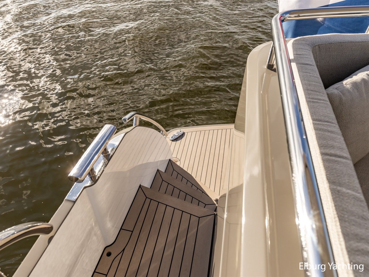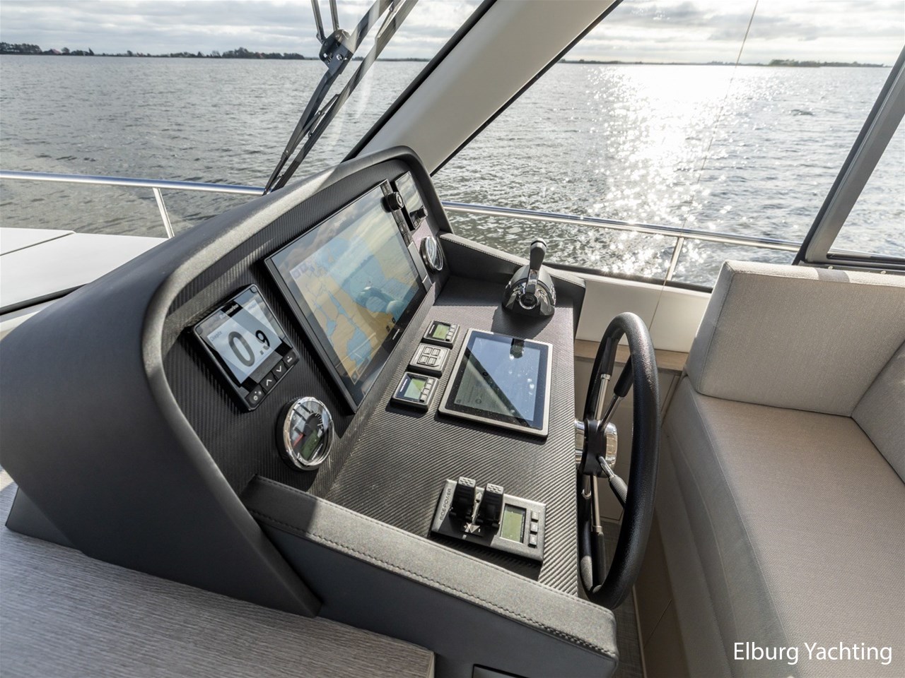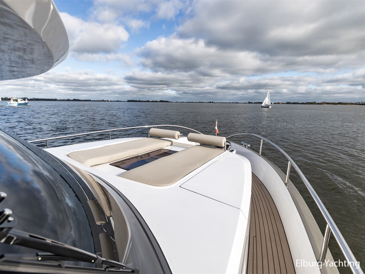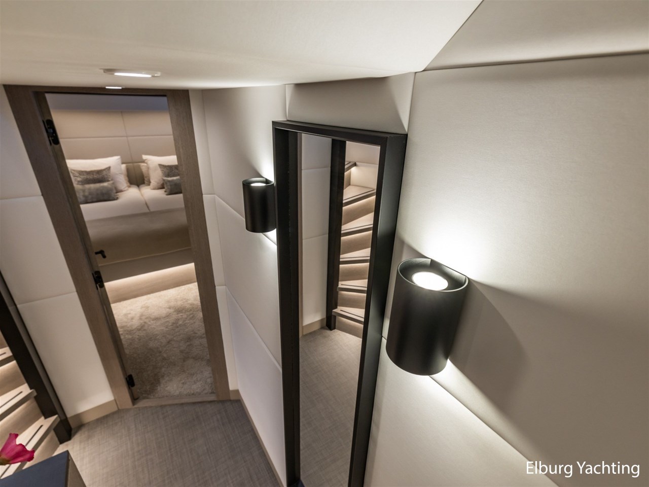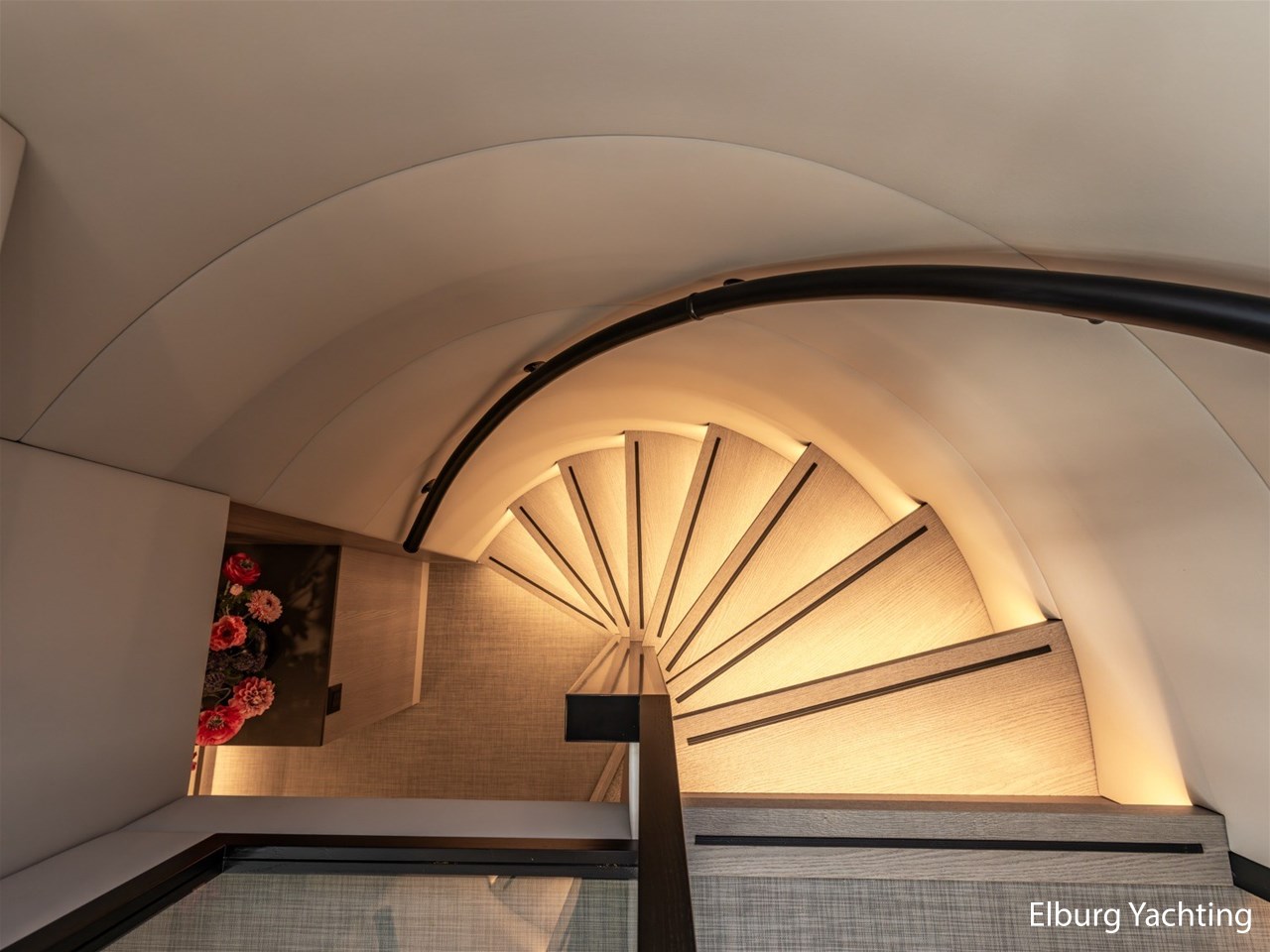 Via een elegante wenteltrap met geïntegreerde verlichting en wandbekleding bereikt u de eigenaarshut met kingsize bed, luxe afwerking en eigen badkamer en-suite. Voorin bevindt zich de gastenhut, voorzien van een eigen badkamer, een apart toilet en een dubbel tegenovergesteld vluchtluik. Beide badkamers en toilet zijn voorzien van Getacore vloeren. Op het voordek bevindt zich een royaal zonnedek met twee verstelbare zonnebedden en twee r.v.s. opbergvakken voor fenders. Daarvoor is een comfortabele zitgelegenheid gecreëerd, waar tevens de mogelijkheid bestaat om buiten te varen. De buitenstuurstand is uitgerust met roerbediening en Volvo Penta EVC-gashendels. Aanvullend is er een Dockmate-afstandsbediening aanwezig, waarmee niet alleen de boeg- en hekschroef maar ook de motoren kunnen worden bediend, ideaal voor comfortabel en nauwkeurig manoeuvreren.