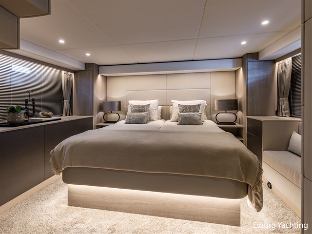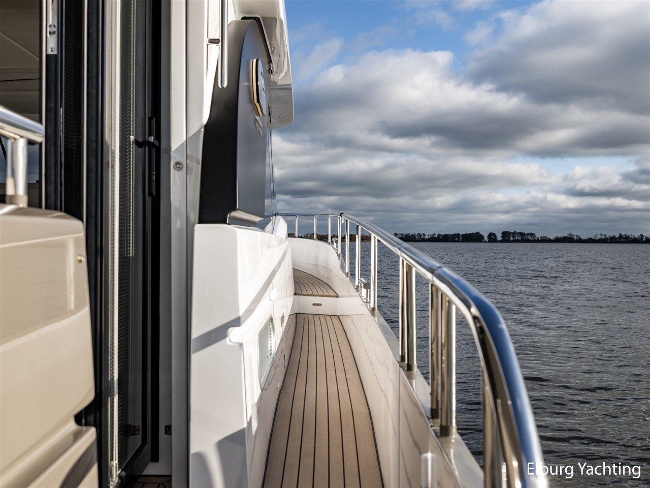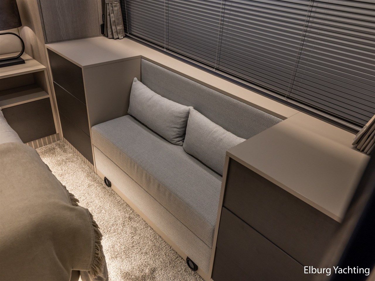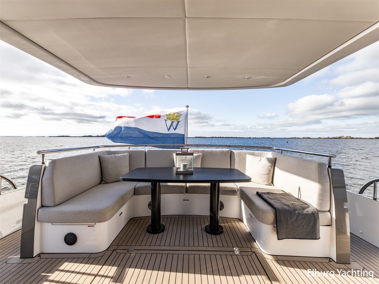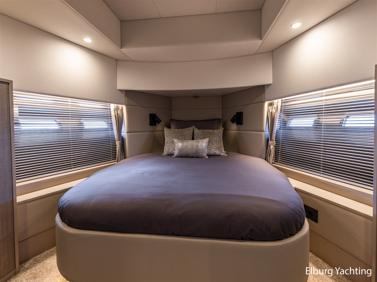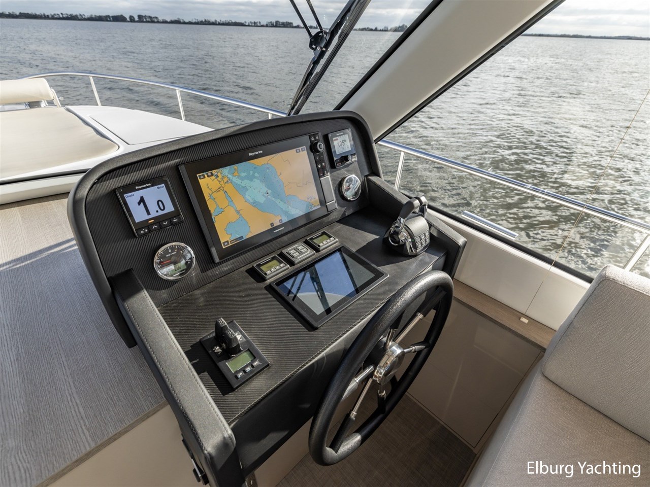 Via een elegante wenteltrap met geïntegreerde verlichting en wandbekleding bereikt u de eigenaarshut met kingsize bed, luxe afwerking en eigen badkamer en-suite. Voorin bevindt zich de gastenhut, voorzien van een eigen badkamer, een apart toilet en een dubbel tegenovergesteld vluchtluik. Beide badkamers en toilet zijn voorzien van Getacore vloeren. Op het voordek bevindt zich een royaal zonnedek met twee verstelbare zonnebedden en twee r.v.s. opbergvakken voor fenders. Daarvoor is een comfortabele zitgelegenheid gecreëerd, waar tevens de mogelijkheid bestaat om buiten te varen. De buitenstuurstand is uitgerust met roerbediening en Volvo Penta EVC-gashendels. Aanvullend is er een Dockmate-afstandsbediening aanwezig, waarmee niet alleen de boeg- en hekschroef maar ook de motoren kunnen worden bediend, ideaal voor comfortabel en nauwkeurig manoeuvreren.