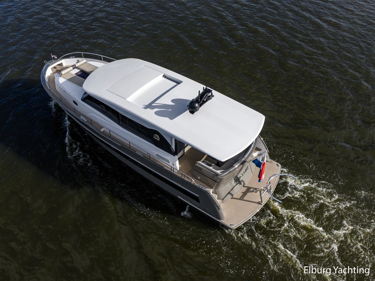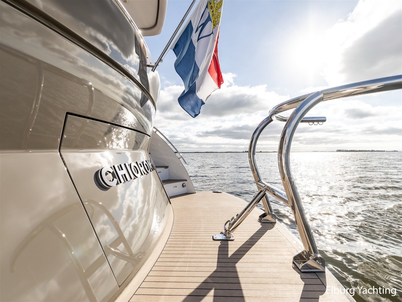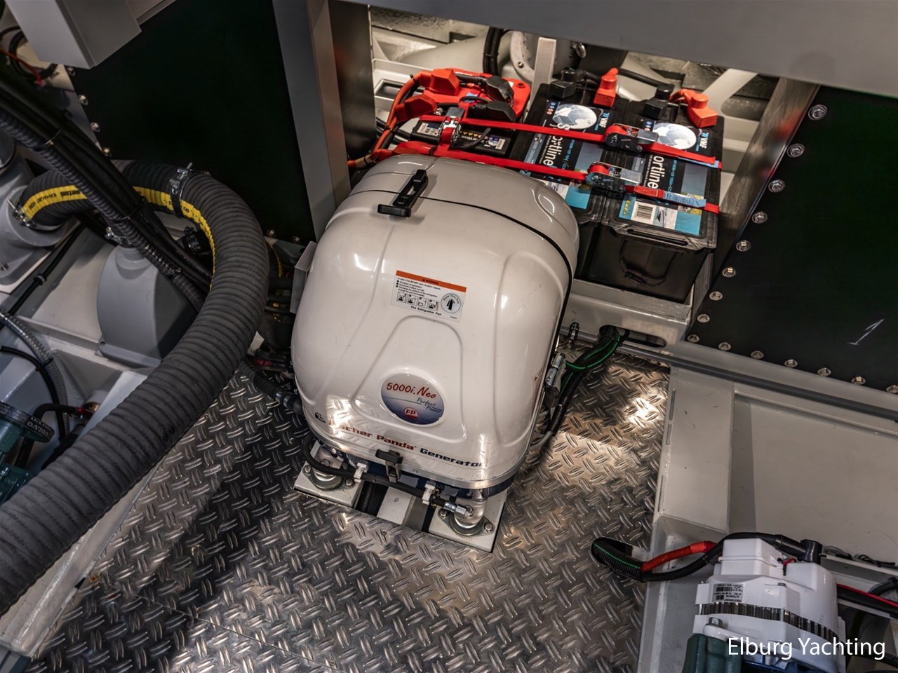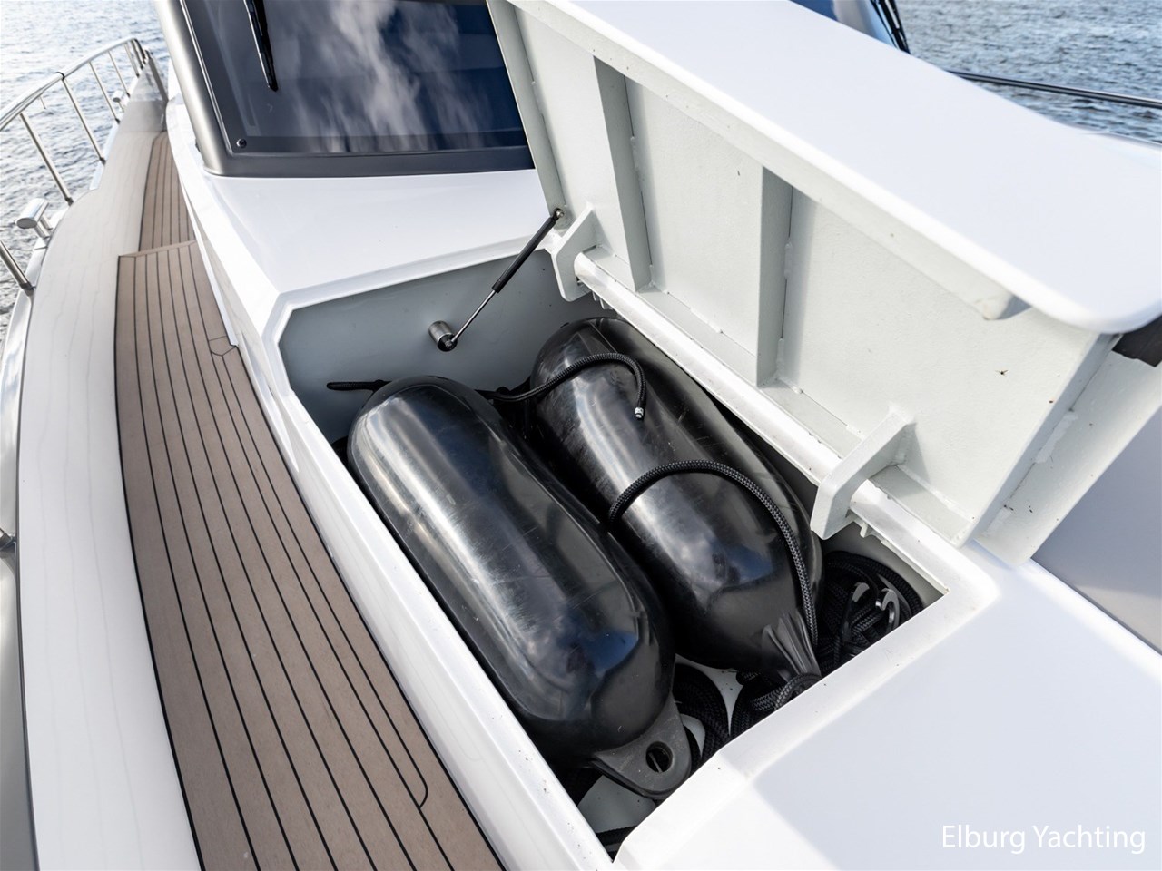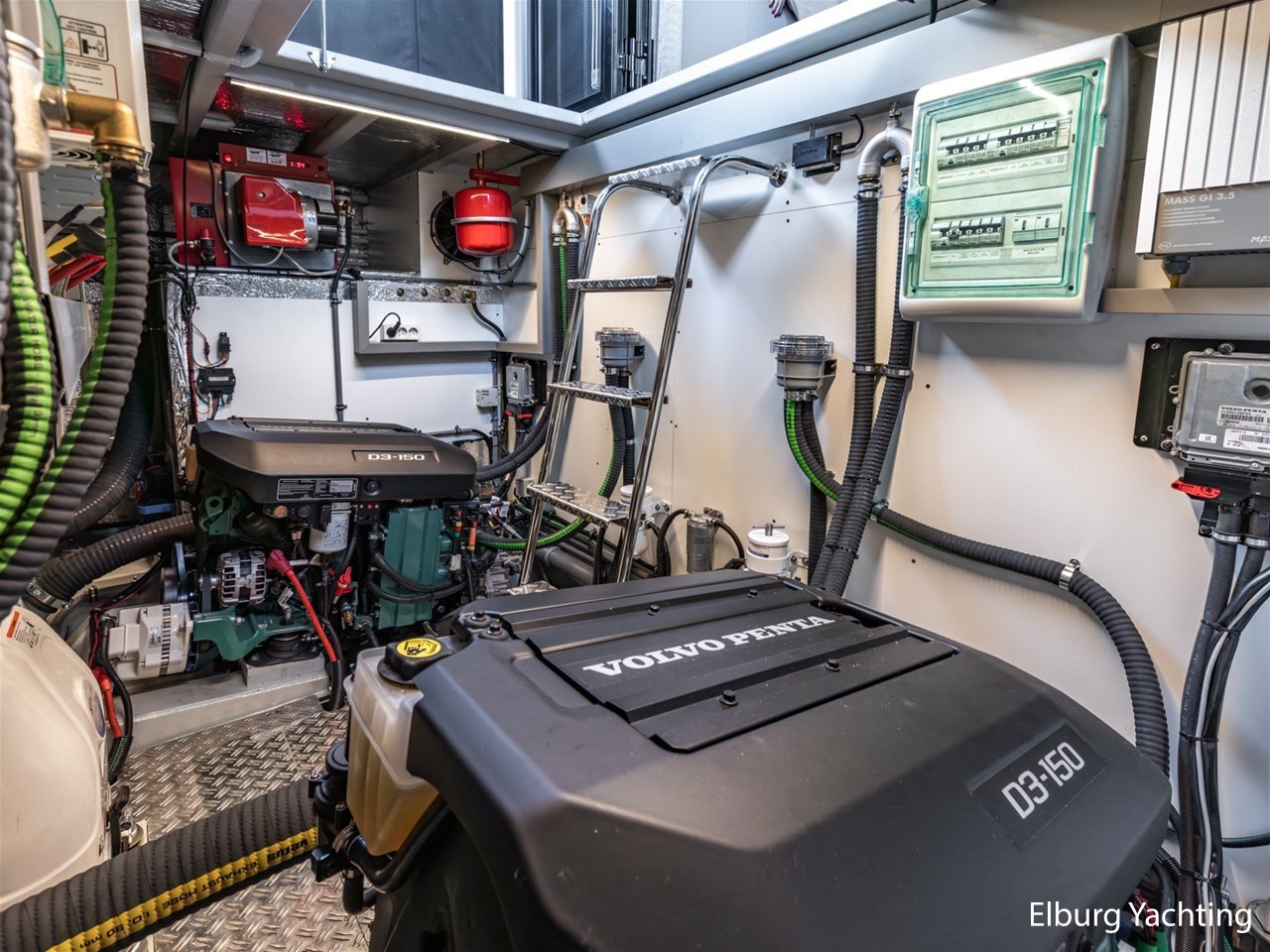 Achterin bevindt zich een ruime garage, hydraulisch te openen via een spiegeldeur, met directe doorgang naar de goed georganiseerde motorkamer. Deze blijft bruikbaar zonder dat de kuip wordt verstoord. De aandrijving komt van twee krachtige Volvo Penta motoren met vaste schroefassen, indirecte koeling, flexibele stuwdragers, watergesmeerde assen en 4-blads schroeven. Voor extra veiligheid is er een FirePro brandblussysteem in de motorkamer. Tot slot is het jacht voorzien van een centraal stofzuigsysteem, een verlengd zwemplateau van ca. 40 cm, gangboord en embleem verlichting, een dekwaspomp, sunscreens voor voorraam, zijkanten en in de kuip in 4 delen, een Miele was-/droogmachine, horizontale jaloezieën in beide hutten, een r.v.s. elektro-hydraulisch klapbare mast en veel gepolijste r.v.s. railingdelen en bolders. De doorvaarthoogte met gestreken mast bedraagt circa 4,05 meter. Motoronderhoud en Kabola-service zijn recent uitgevoerd in 2025.