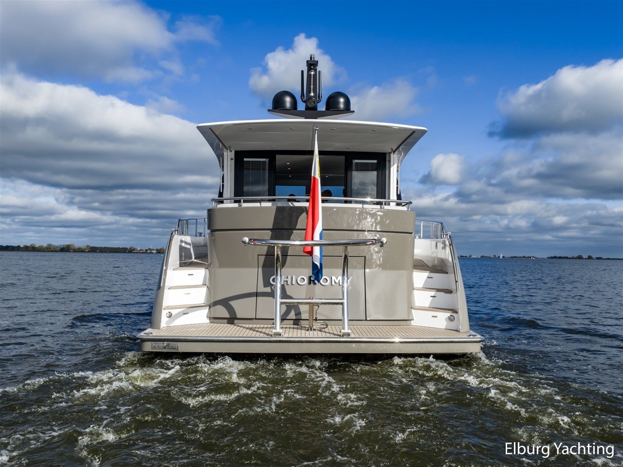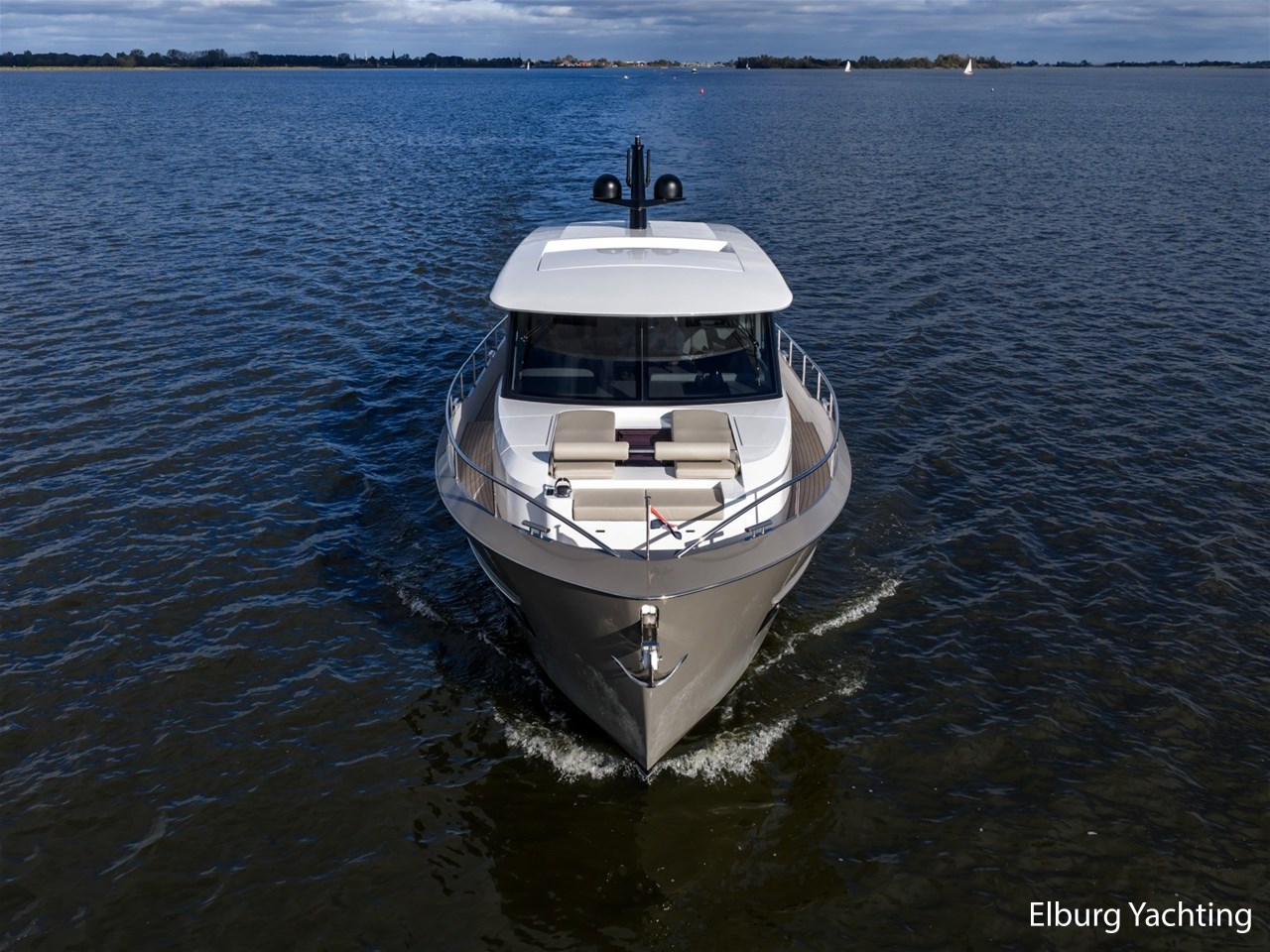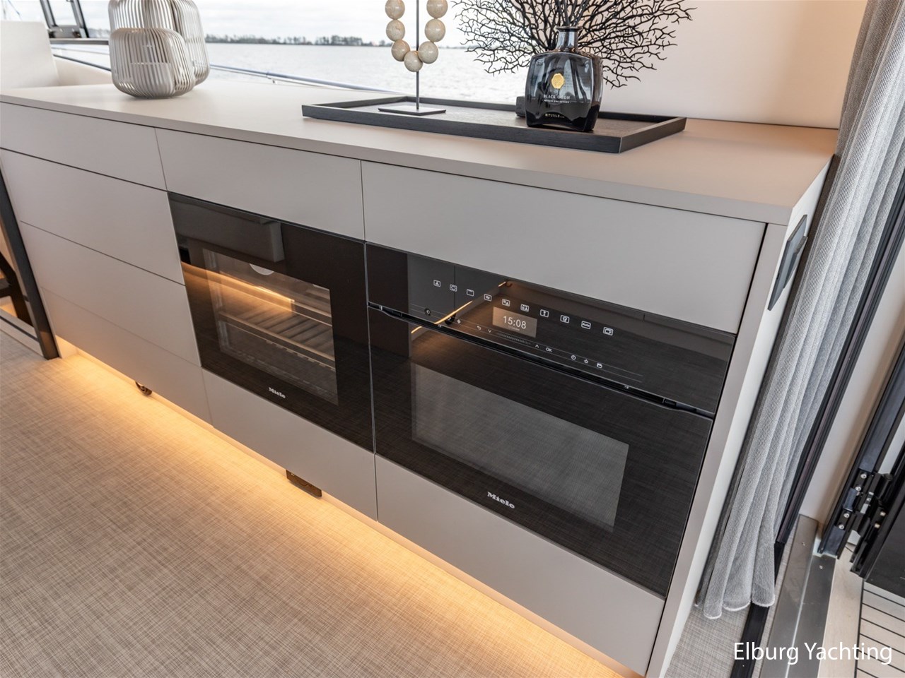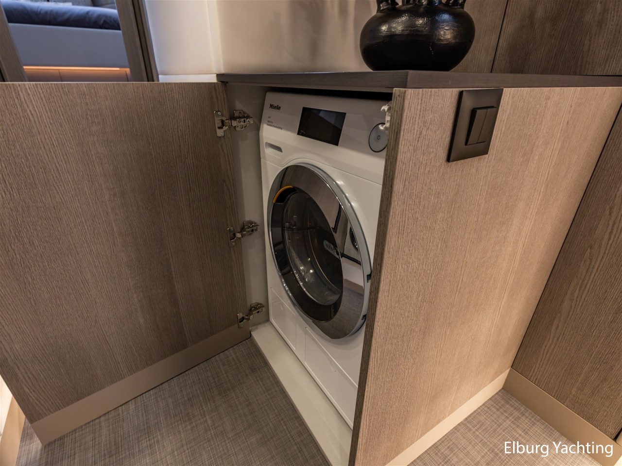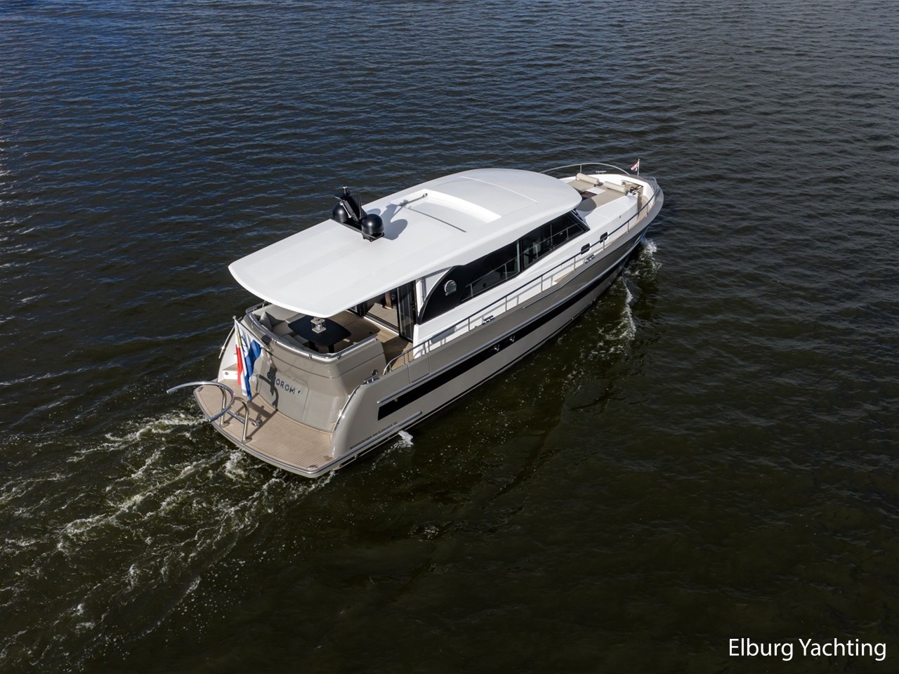 Achterin bevindt zich een ruime garage, hydraulisch te openen via een spiegeldeur, met directe doorgang naar de goed georganiseerde motorkamer. Deze blijft bruikbaar zonder dat de kuip wordt verstoord. De aandrijving komt van twee krachtige Volvo Penta motoren met vaste schroefassen, indirecte koeling, flexibele stuwdragers, watergesmeerde assen en 4-blads schroeven. Voor extra veiligheid is er een FirePro brandblussysteem in de motorkamer. Tot slot is het jacht voorzien van een centraal stofzuigsysteem, een verlengd zwemplateau van ca. 40 cm, gangboord en embleem verlichting, een dekwaspomp, sunscreens voor voorraam, zijkanten en in de kuip in 4 delen, een Miele was-/droogmachine, horizontale jaloezieën in beide hutten, een r.v.s. elektro-hydraulisch klapbare mast en veel gepolijste r.v.s. railingdelen en bolders. De doorvaarthoogte met gestreken mast bedraagt circa 4,05 meter. Motoronderhoud en Kabola-service zijn recent uitgevoerd in 2025.