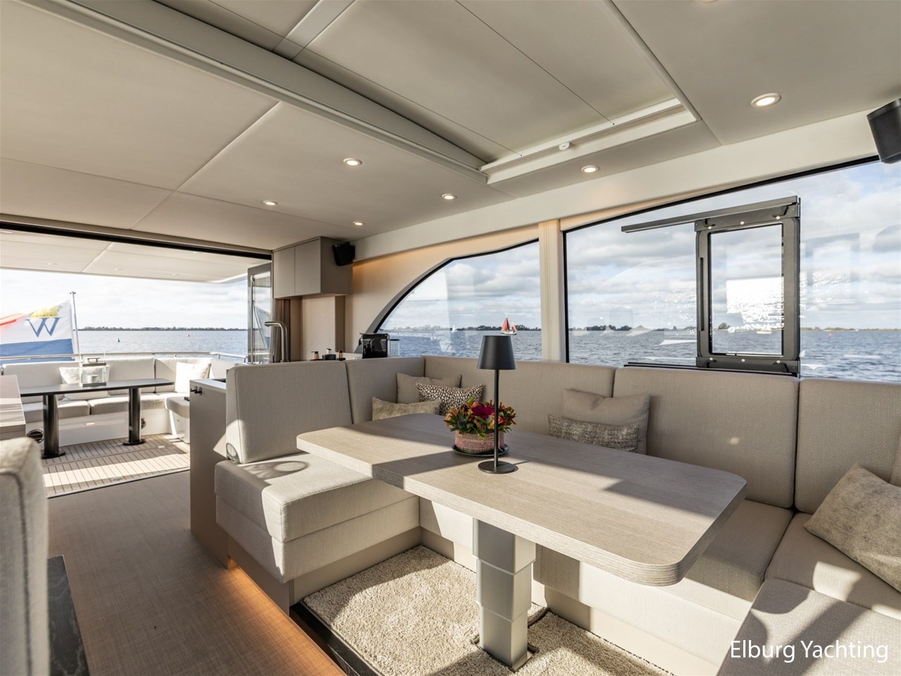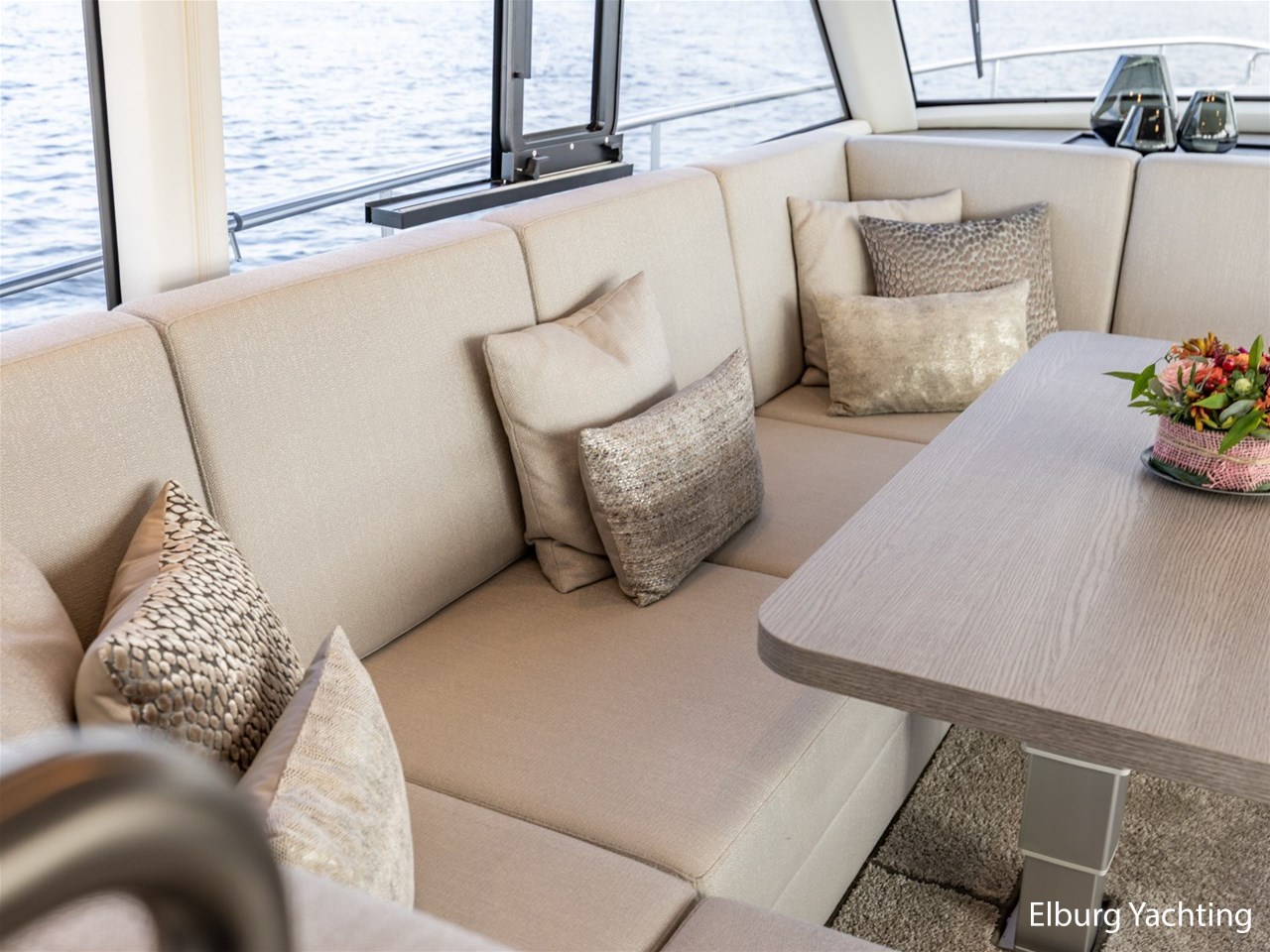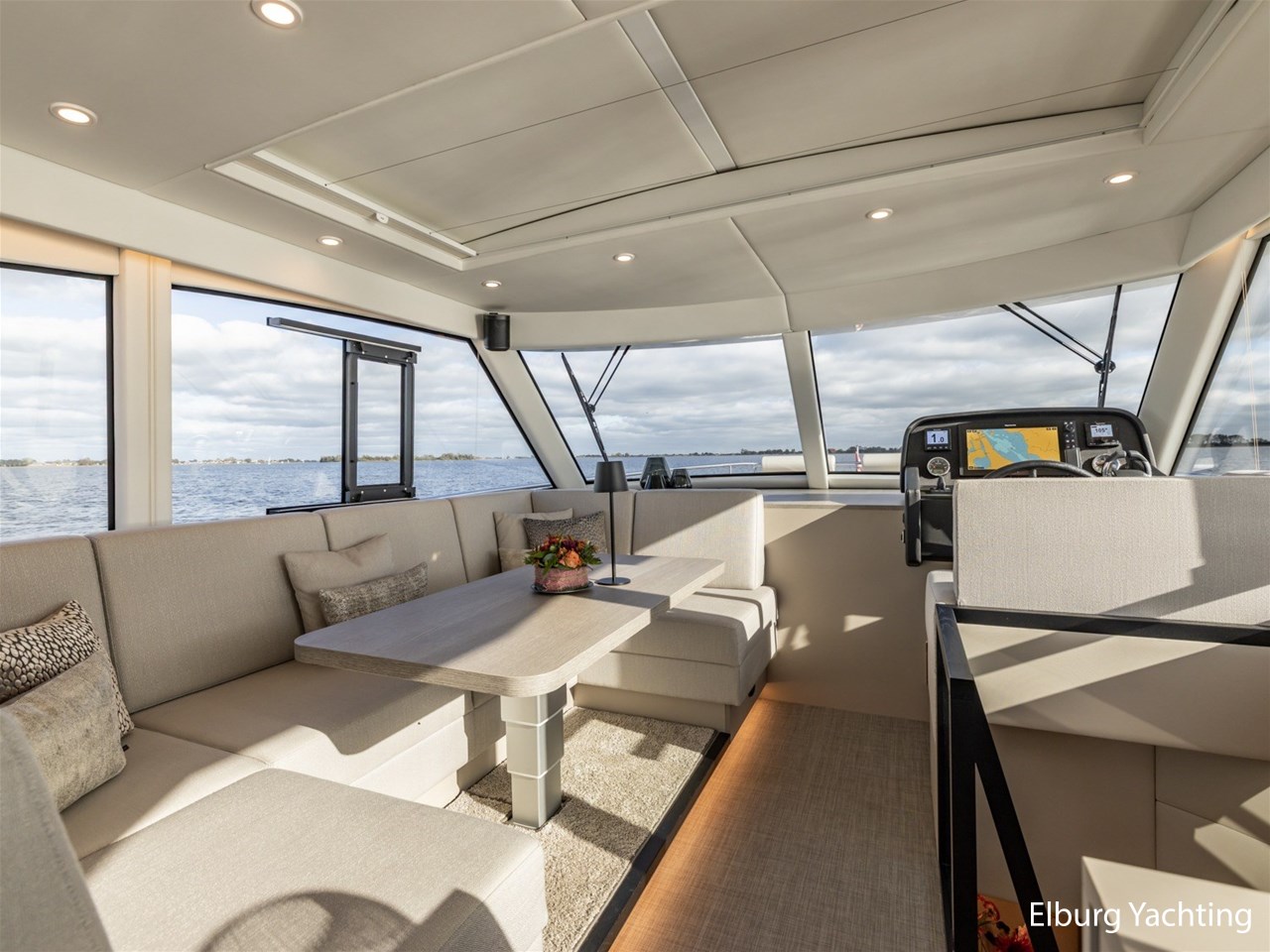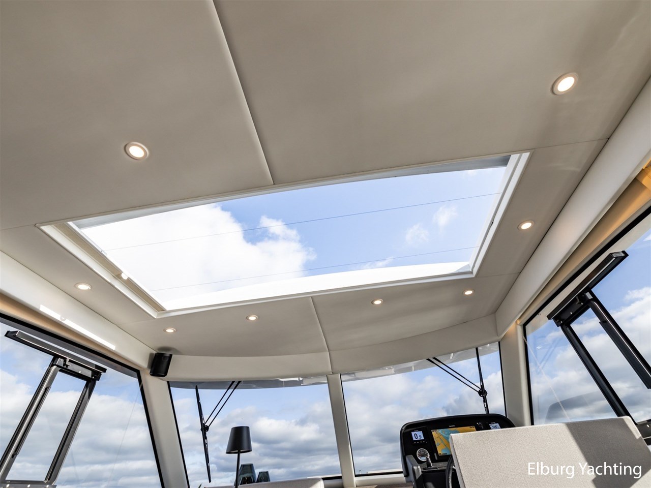 Als u aan boord stapt, komt u in de royale open kuip, overkapt met een verlengd stalen dak en uitgerust met een hoogwaardige kuiptent, voorzien van geïntegreerde berging (CanopEasy). Vanuit de kuip loopt u gelijkvloers naar binnen via vier openslaande deuren, voorzien van een geïntegreerde plisséhordeur. Aan boord geniet u van vloerverwarming en hete lucht verwarming, twee te openen zijramen en een groot elektrisch schuifdak. De gehele vloer is afgewerkt met een stijlvolle Bolon kunststofvloer. De salon is licht en ruim opgezet, met sfeerverlichting, veel kastruimte, een wijnkoeler, vaatwasser, koelkast, Sonos muzieksysteem, Samsung TV op een lift en een stijlvolle dinette met elektrisch verstelbare tafel die tevens als extra slaapplaats kan dienen. De hoge afwerkingskwaliteit wordt doorgetrokken in details zoals het Getacore werkblad met verzonken keramische kookplaat en de plissé gordijnen in de salon.