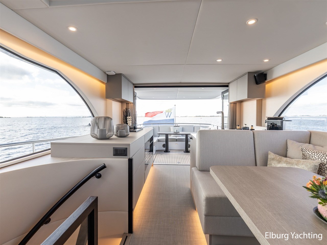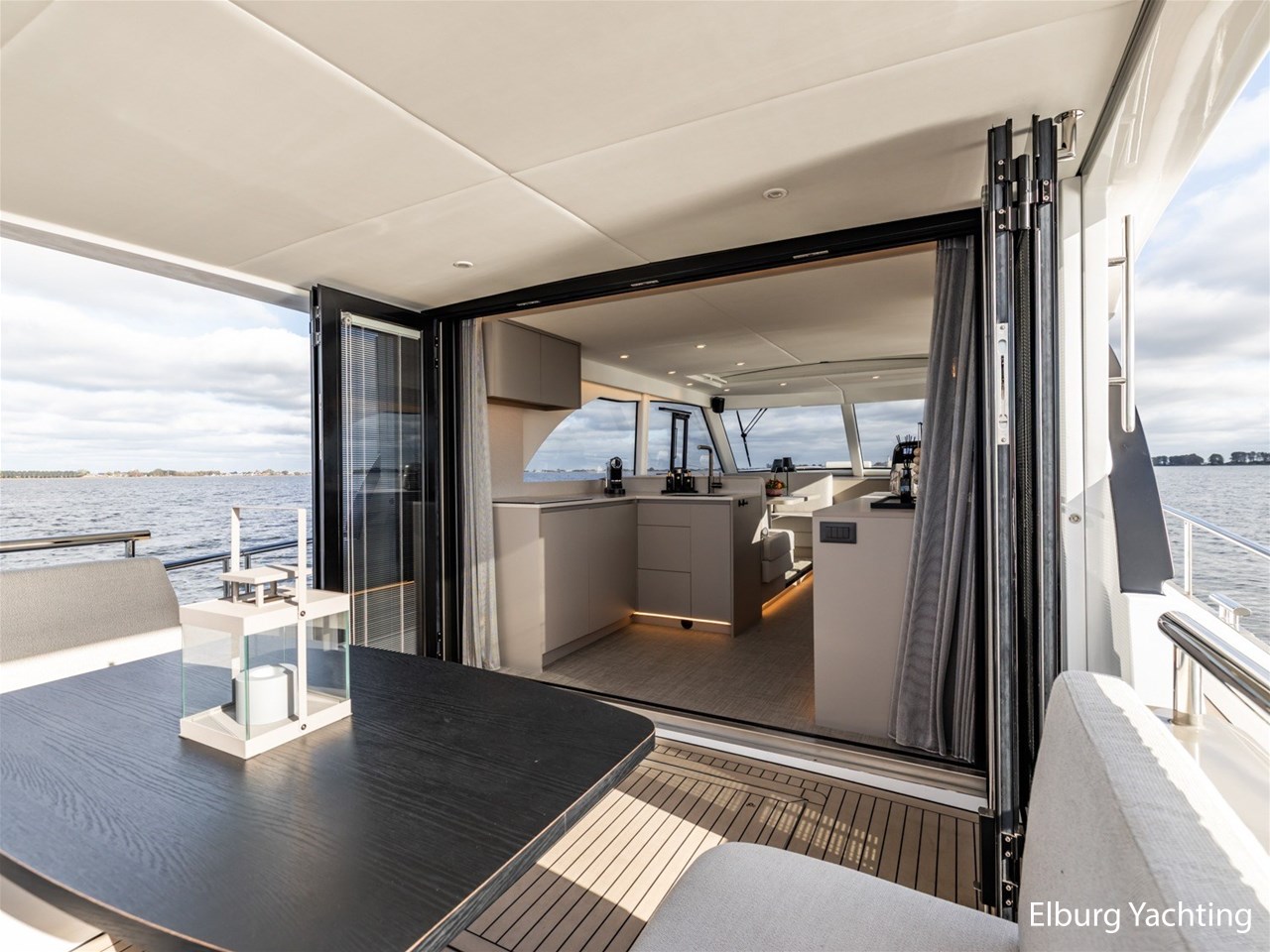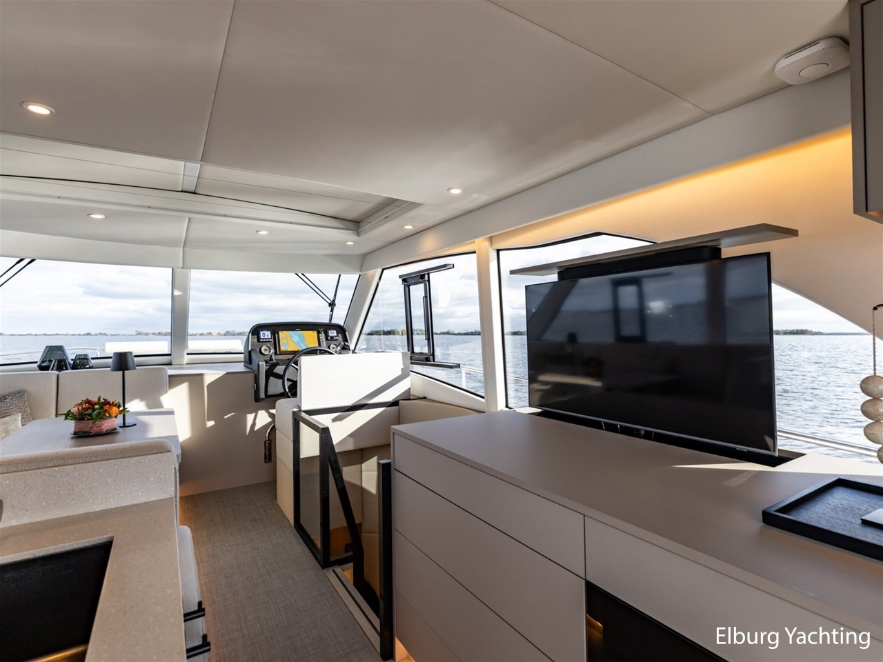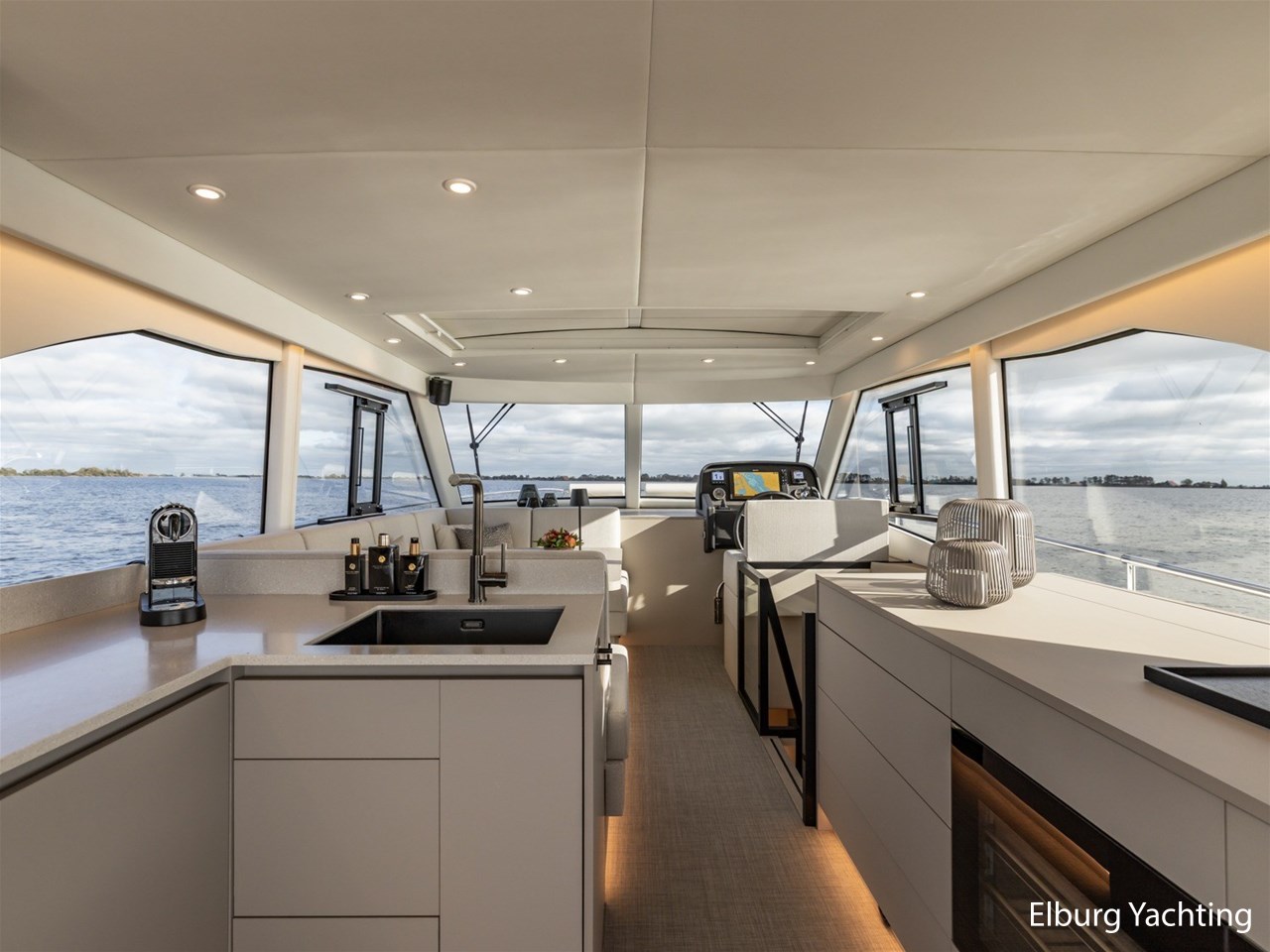 Als u aan boord stapt, komt u in de royale open kuip, overkapt met een verlengd stalen dak en uitgerust met een hoogwaardige kuiptent, voorzien van geïntegreerde berging (CanopEasy). Vanuit de kuip loopt u gelijkvloers naar binnen via vier openslaande deuren, voorzien van een geïntegreerde plisséhordeur. Aan boord geniet u van vloerverwarming en hete lucht verwarming, twee te openen zijramen en een groot elektrisch schuifdak. De gehele vloer is afgewerkt met een stijlvolle Bolon kunststofvloer. De salon is licht en ruim opgezet, met sfeerverlichting, veel kastruimte, een wijnkoeler, vaatwasser, koelkast, Sonos muzieksysteem, Samsung TV op een lift en een stijlvolle dinette met elektrisch verstelbare tafel die tevens als extra slaapplaats kan dienen. De hoge afwerkingskwaliteit wordt doorgetrokken in details zoals het Getacore werkblad met verzonken keramische kookplaat en de plissé gordijnen in de salon.