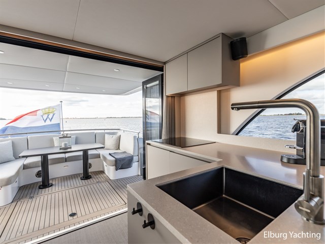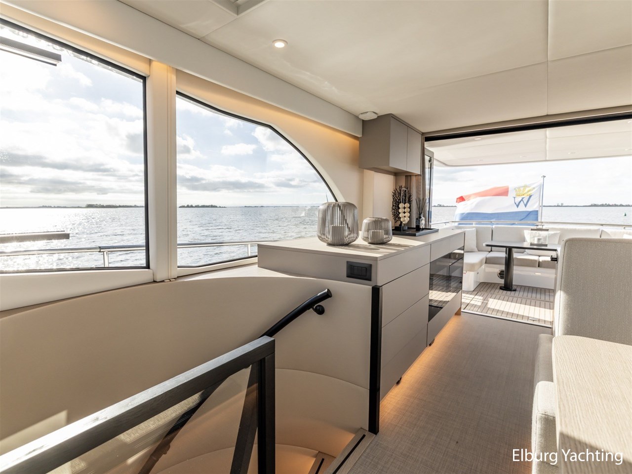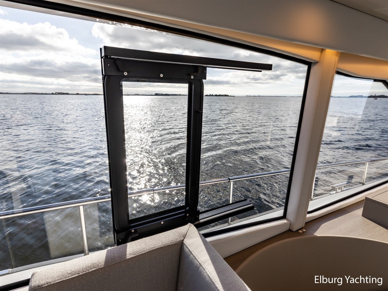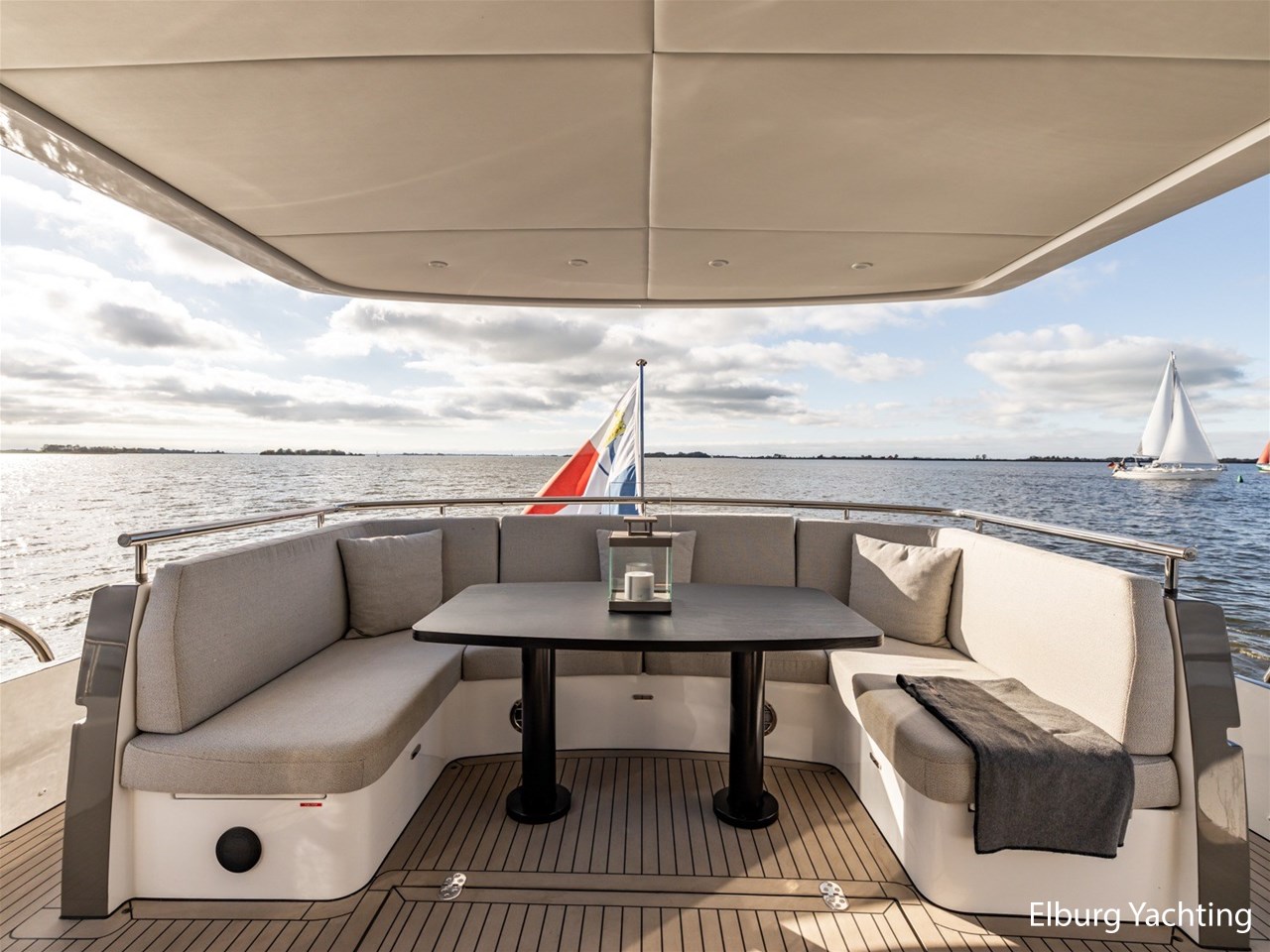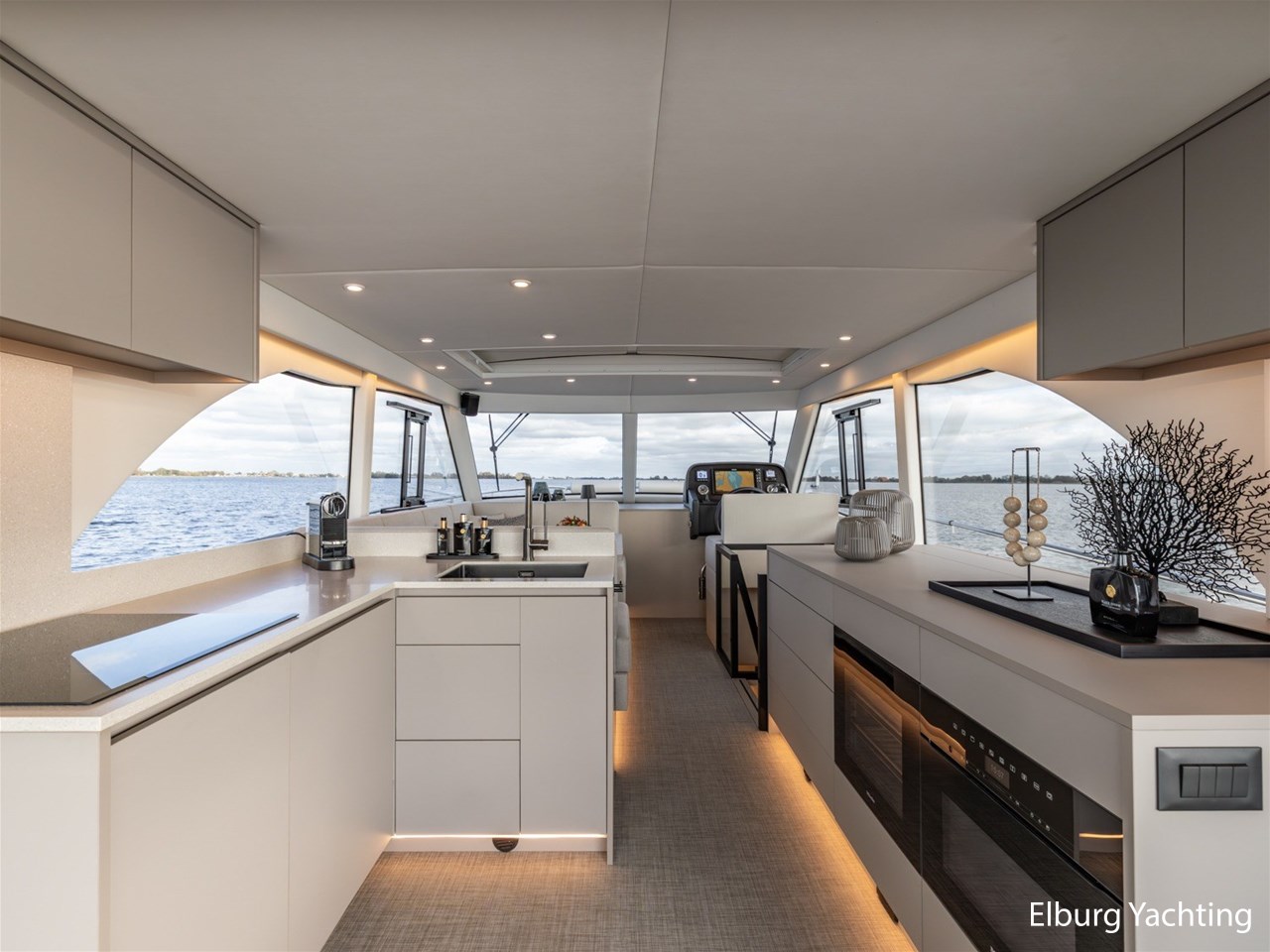 Als u aan boord stapt, komt u in de royale open kuip, overkapt met een verlengd stalen dak en uitgerust met een hoogwaardige kuiptent, voorzien van geïntegreerde berging (CanopEasy). Vanuit de kuip loopt u gelijkvloers naar binnen via vier openslaande deuren, voorzien van een geïntegreerde plisséhordeur. Aan boord geniet u van vloerverwarming en hete lucht verwarming, twee te openen zijramen en een groot elektrisch schuifdak. De gehele vloer is afgewerkt met een stijlvolle Bolon kunststofvloer. De salon is licht en ruim opgezet, met sfeerverlichting, veel kastruimte, een wijnkoeler, vaatwasser, koelkast, Sonos muzieksysteem, Samsung TV op een lift en een stijlvolle dinette met elektrisch verstelbare tafel die tevens als extra slaapplaats kan dienen. De hoge afwerkingskwaliteit wordt doorgetrokken in details zoals het Getacore werkblad met verzonken keramische kookplaat en de plissé gordijnen in de salon.