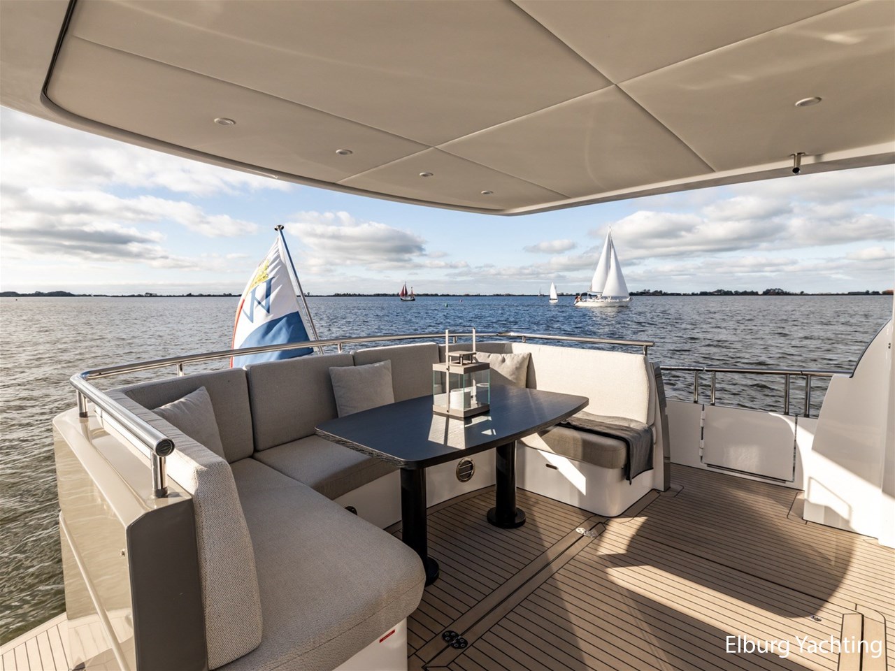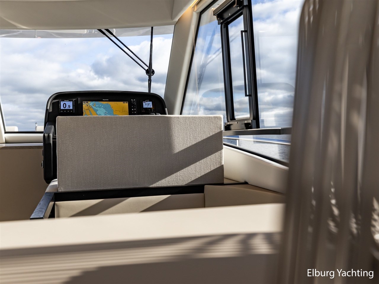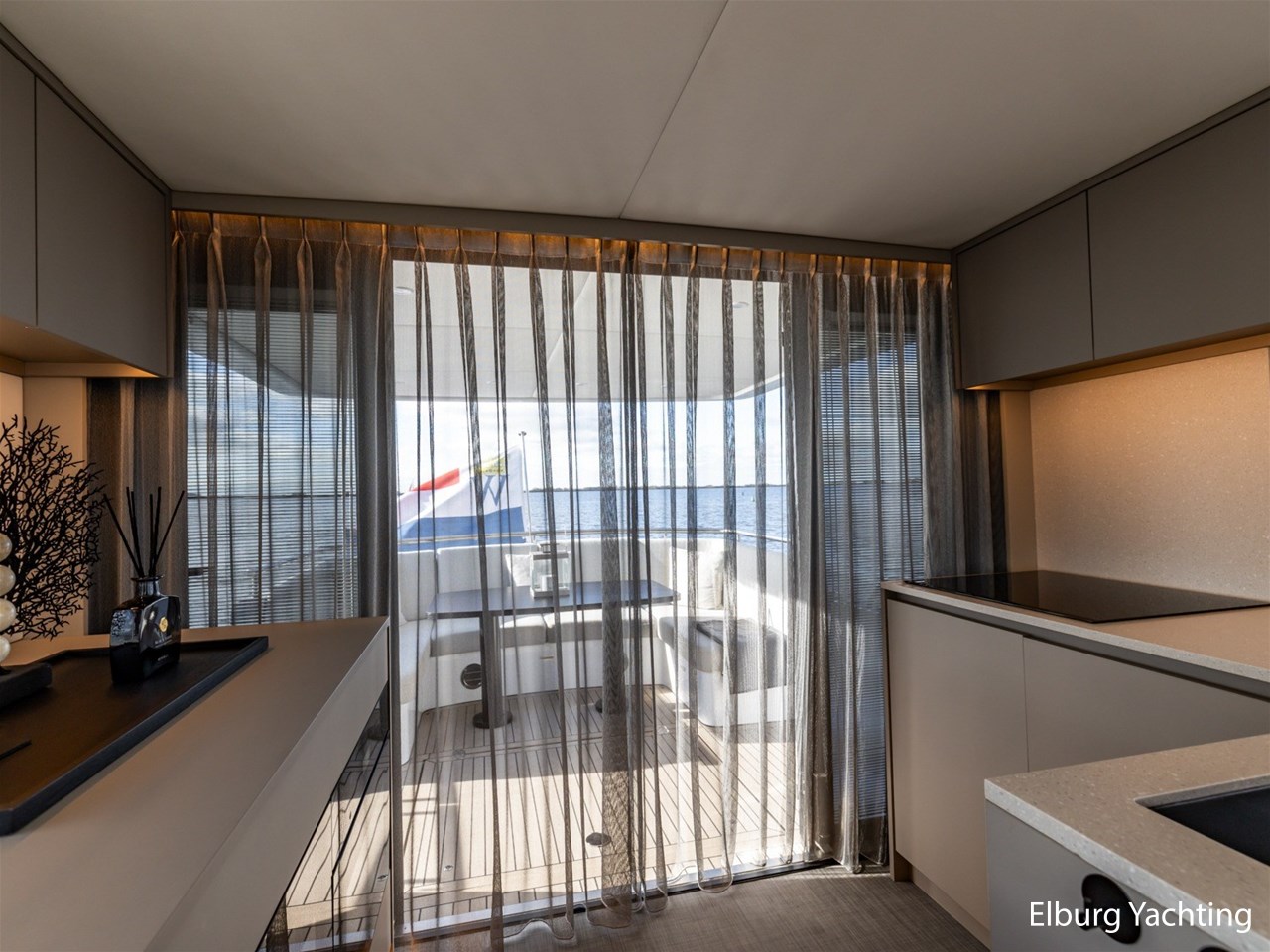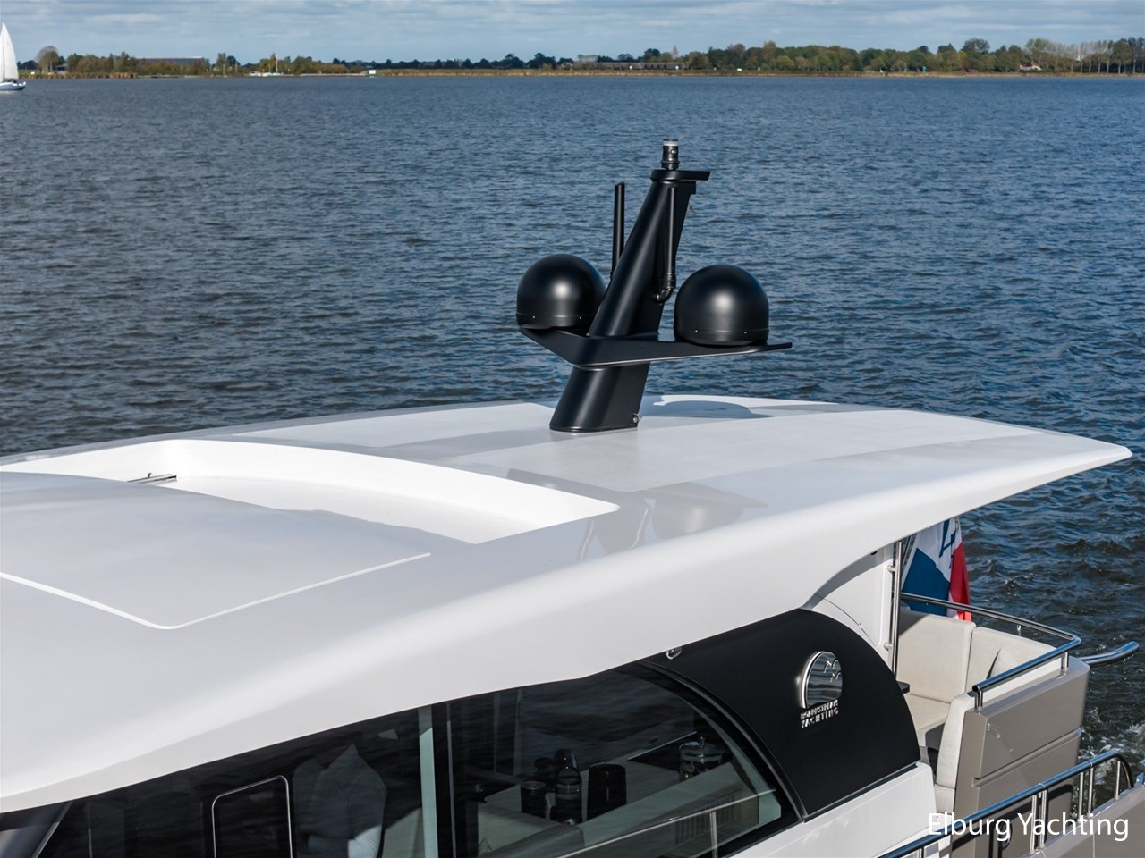 Als u aan boord stapt, komt u in de royale open kuip, overkapt met een verlengd stalen dak en uitgerust met een hoogwaardige kuiptent, voorzien van geïntegreerde berging (CanopEasy). Vanuit de kuip loopt u gelijkvloers naar binnen via vier openslaande deuren, voorzien van een geïntegreerde plisséhordeur. Aan boord geniet u van vloerverwarming en hete lucht verwarming, twee te openen zijramen en een groot elektrisch schuifdak. De gehele vloer is afgewerkt met een stijlvolle Bolon kunststofvloer. De salon is licht en ruim opgezet, met sfeerverlichting, veel kastruimte, een wijnkoeler, vaatwasser, koelkast, Sonos muzieksysteem, Samsung TV op een lift en een stijlvolle dinette met elektrisch verstelbare tafel die tevens als extra slaapplaats kan dienen. De hoge afwerkingskwaliteit wordt doorgetrokken in details zoals het Getacore werkblad met verzonken keramische kookplaat en de plissé gordijnen in de salon.