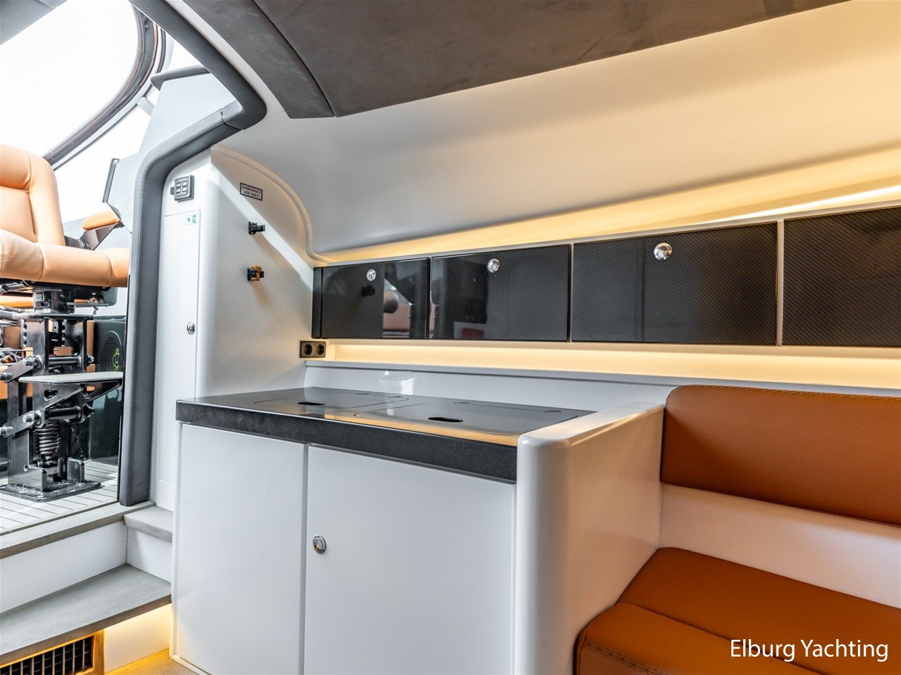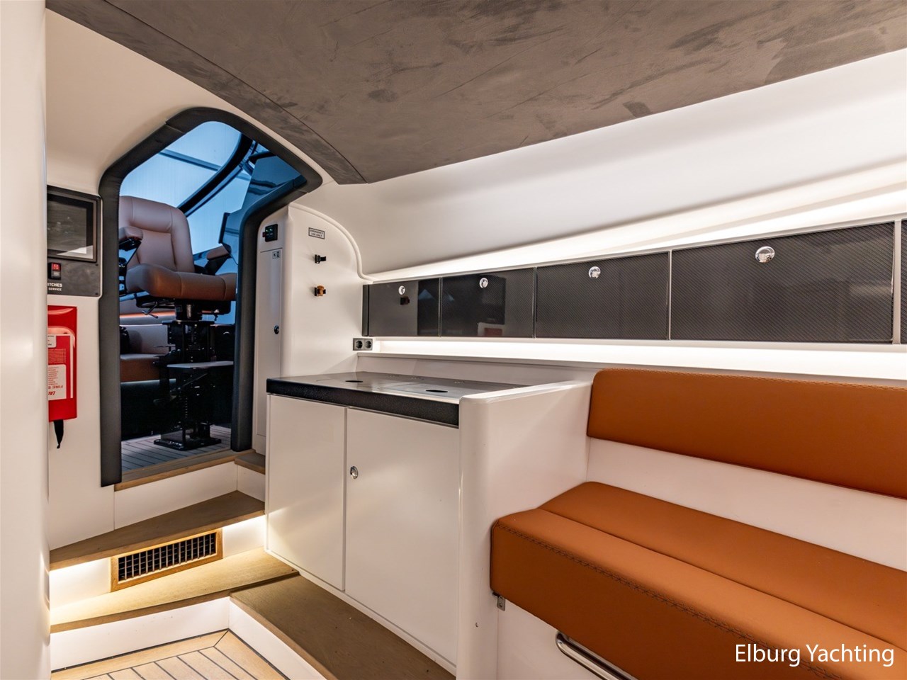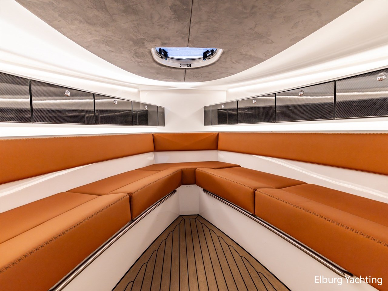 - Wit gelakt met alcantara plafond bekleding en kunstteak vloeren
