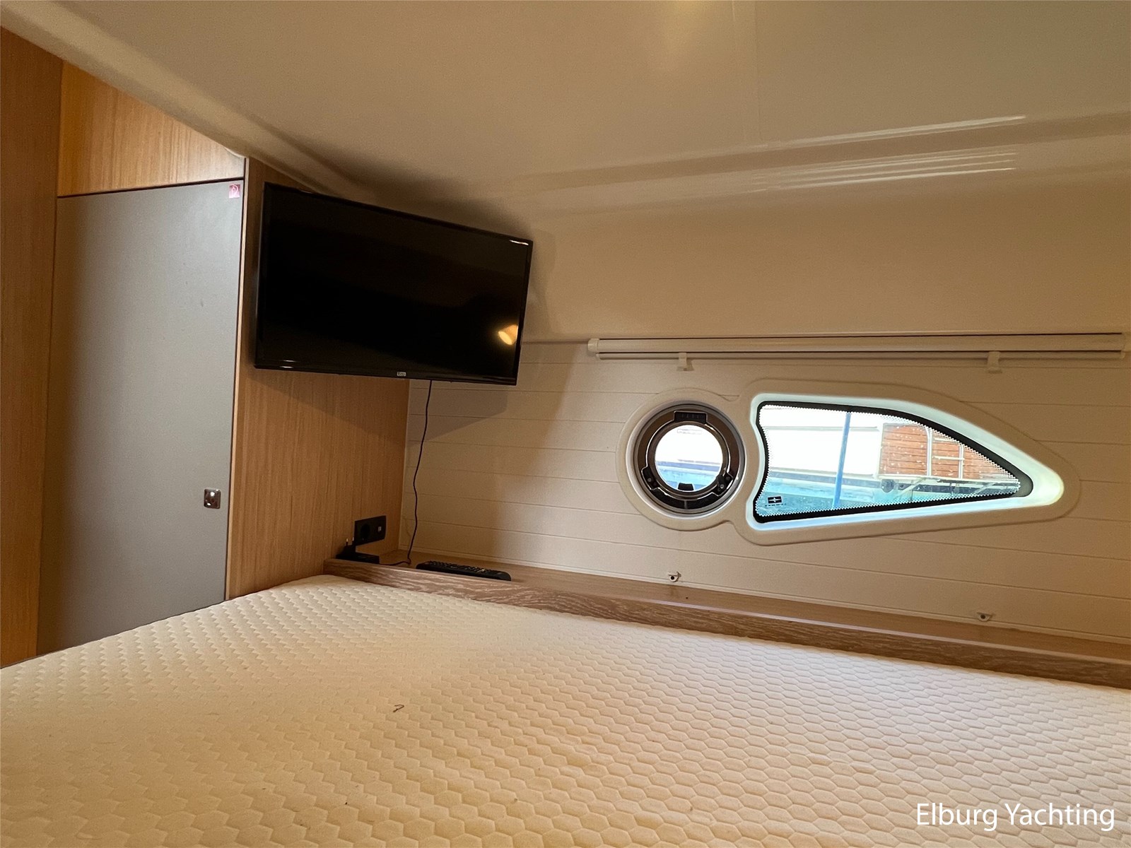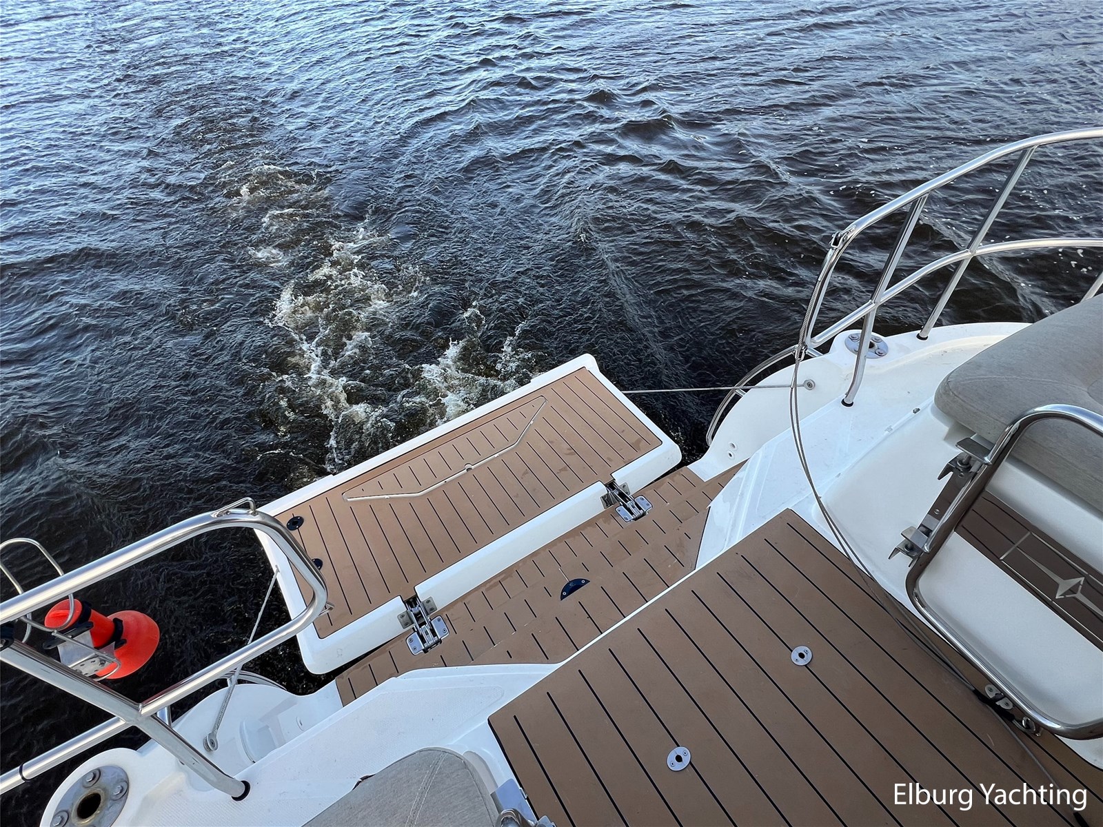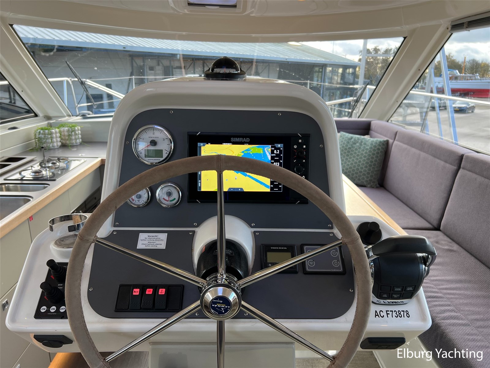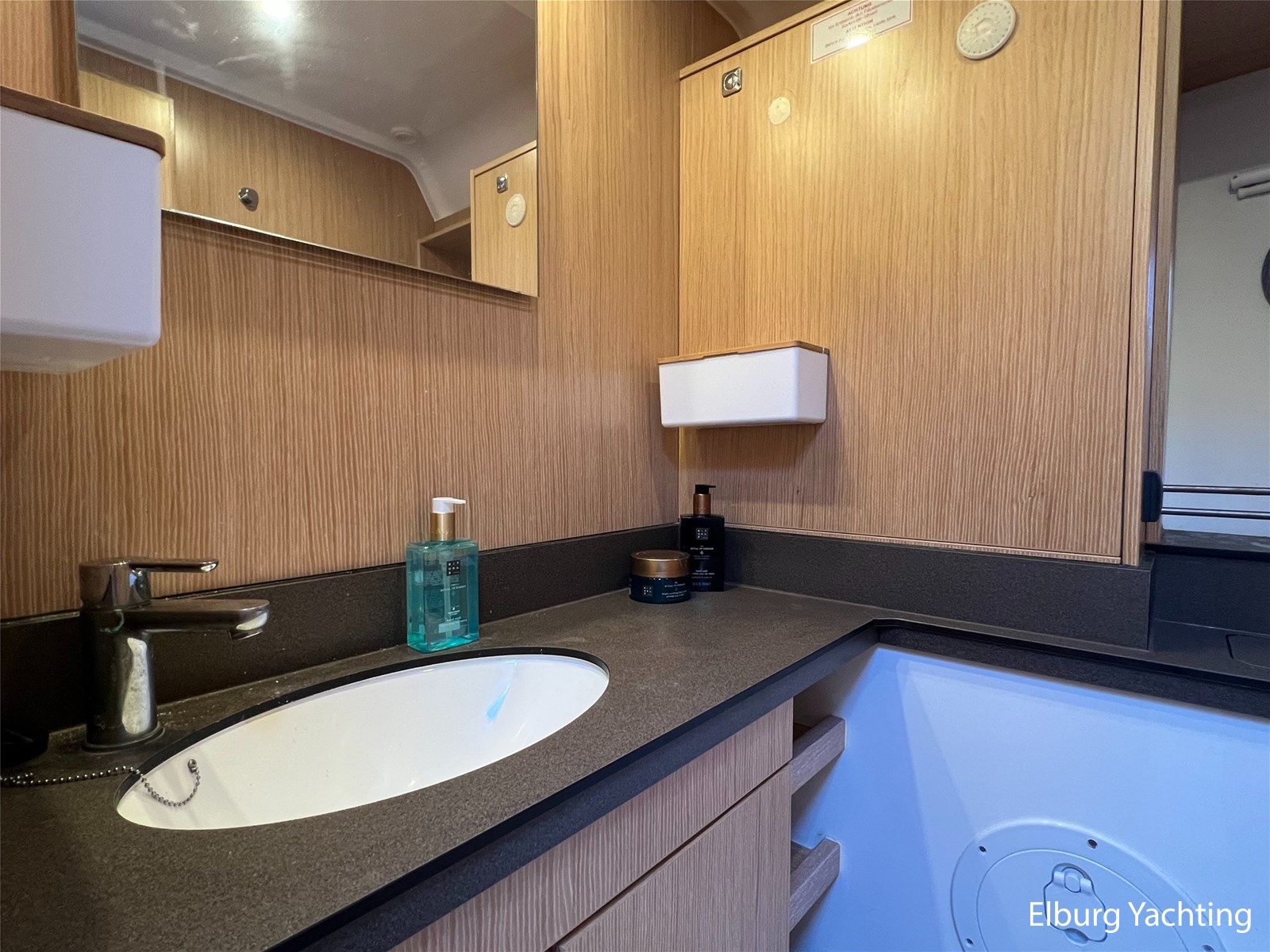 Deze jonge Bavaria E40 wordt aangeboden door haar tweede eigenaar. De Bavaria E40 Sedan is gebouwd met heel veel praktische ruimte voor haar afmeting en is voorzien van 3 volwaardige hutten. Dit exemplaar is uitgerust met de topmotorisering van 1 x 300 pk Volvo Penta D4 en heeft een vast schroefas aandrijving, waarmee een maximale snelheid wordt bereikt van ca. 13 knopen. De kuip biedt plaats voor ca. 8 personen en loopt gelijkvloers rond met de gangboorden. Vanuit de kuip is er een korte doorloop naar de salon, waar zich aan de rechterzijde de verhoogde stuurstand bevind. De stuurstand biedt plek voor minimaal 2 personen en beschikt over alle benodigde moderne navigatie apparatuur; zoals een een elektrische boeg- en hekschroef bediening, een vaste Simrad HS35 marifoon met daarnaast een tweede gekoppelde handheld toestel, een Simrad NSS Evo 3 plotter met autopilot en een Fusion audiosysteem met volumeregeling in de salon en kuip. Aan bakboordzijde van de salon is er een ruim opgezette keuken gesitueerd met aan de stuurboordzijde de dinette die volledig uitzicht rondom biedt. De salon is voorzien van grote raampartijen die zorgen voor een ruimtelijk gevoel en veel lichtinval. Tussen de stuurstand en de kuip bevinden zich wegschuifbare ramen, zodat de kapitein en zijn bezoek samen de tocht ervaren. Naar voren in het schip bevind zich een 2 persoons hut, met aan de bakboordzijde een toilet en aan stuurboordzijde een douchecabine. Achter de stuurstand is via een trap naar beneden de tweede en derde hut te bereikbaar, elk voorzien van een tweepersoonsbed. Ook is er een tweede badkamer met een gezamenlijk douche en toilet aanwezig. Deze Bavaria E40 is verder voorzien van: Geïntegreerde kuipbanken met afneembare kussens, afsluitbare kuiptent (2025), afneembare r.v.s. davits, klapbaar zwemplateau in spiegel, 2 x dakluik in salon + 2 x schuifraam (SB+BB), kussens voor zonnebed op voordek aanwezig, groot bergluik in voorschip, TV in salon en in alle hutten, klapbare r.v.s. mast met toplicht waarmee een minimale hoogte verkregen wordt van ca. 3,80m. Voor vragen en/of het maken van een afspraak bent u 7 dagen per week van harte welkom bij Elburg Yachting